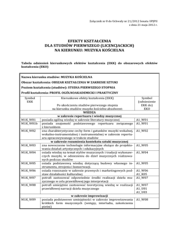 Załącznik nr 8 do Uchwały nr 21/2012 Senatu UPJPII z dnia 21 maja 2012 r. EFEKTY KSZTAŁCENIA DLA STUDIÓW PIERWSZEGO (LICENCJACKICH) NA KIERUNKU: MUZYKA KOŚCIELNA Tabela odniesień kierunkowych efektów kształcenia (EKK) do obszarowych efektów kształcenia (EKO) Nazwa kierunku studiów: MUZYKA KOŚCIELNA Obszar kształcenia: OBSZAR KSZTAŁCENIA W ZAKRESIE SZTUKI Poziom kształcenia (studiów): STUDIA PIERWSZEGO STOPNIA Profil kształcenia: PROFIL OGÓLNOAKADEMICKI I PRAKTYCZNY Symbol EKK M1K_W01 M1K_W01b M1K_W02 M1K_W03 M1K_W04 M1K_W05 M1K_W06 M1K_W07 M1K_W08 M1K_W09 Kierunkowe efekty kształcenia (EKK) Po ukończeniu studiów pierwszego stopnia na kierunku studiów muzyka kościelna absolwent: WIEDZA w zakresie repertuaru i wiedzy muzycznej posiada ogólną wiedzę w zakresie literatury muzycznej posiada znajomość podstawowego repertuaru związanego z kierunkiem zna charakterystyczne cechy form i gatunków muzyki wokalnej, wokalno-instrumentalnej i instrumentalnej w zakresie repertuaru opracowywanego w trakcie studiów w zakresie rozumienia kontekstu sztuki muzycznej zna nowoczesne technologie informacyjne służące do projektowania działań artystycznych i edukacyjnych osiada wiedzę na temat stylów muzycznych i tradycji wykonawczych muzyki, w odniesieniu do dzieł muzycznych realizowanych podczas studiów osiada podstawową wiedzę dotyczącą budowy własnego instrumentu, strojenia i konserwacji. osiada rozeznanie w zakresie prawnych i marketingowych podstaw działalności kulturalnej potrafi zastosować odpowiednie środki realizacji dzieła muzycznego w celu prawidłowej jego interpretacji potrafi umiejętnie zastosować teoretyczną wiedzę w realizacji prawidłowej narracji dzieła muzycznego Symbol (odniesienie EKK do) EKO A1_W01 A1_W01 A1_W02 A1_W05 A1_W04 A1_W05 A1_W06 A1_K05 A1_W07 A1_W07 A1_U01 A1_U03 w zakresie improwizacji posiada podstawowe umiejętności w zakresie improwizowania A1_W08 krótkich form muzycznych (wstępy, interludia, zakończenia pieśni) M1K_W10 M1K_U01 M1K_U02 M1K_U02b M1K_U02c M1K_U03 M1K_U04 M1K_U04b M1K_U05 M1K_U05b M1K_U06 M1K_U07 M1K_U07b M1K_U08 M1K_U09 M1K_U09b w zakresie wiedzy pedagogicznej zna różne typy oprogramowania komputerowego, mającego A1_W09 zastosowanie w dydaktyce w szczególności w edukacji muzycznej UMIEJĘTNOŚCI w zakresie ekspresji artystycznej dysponuje umiejętnościami potrzebnymi do realizacji dzieł mu- A1_U01 zycznych w zakresie repertuaru wykonuje utwory muzyczne związane z kierunkiem studiów, A1_U02 zgodnie ze stylistyką epoki w której zostały stworzone posiada umiejętność odczytu zapisu nutowego opracowywa- A1_U02 nych kompozycji, powstałych w różnych epokach historycznych A1_U03 (od średniowiecza do muzyki współczesnej) posiada podstawową wiedzę na temat różnych dziedzin sztuki A1_U01 pomocną w rozumieniu muzyki. w zakresie interpretacji posiada podstawowe umiejętności interpretacji wykonywanych A1_U03 dzieł muzycznych. w zakresie pracy w zespole jest przygotowany do współpracy z innymi muzykami podczas A1_U04 wspólnego wykonywania utworów, organizacji i uczestnictwa w artystycznych wydarzeniach o zasięgu lokalnym, krajowym i międzynarodowym. posiada umiejętność akompaniowania soliście (solistom) w ze- A1_U04 społach ansamblowych w zakresie ćwiczenia i pracy podczas prób stosuje poznane sposoby ćwiczenia doskonaląc swój warsztat A1_U05 techniczny z zaawansowanych technologicznie urządzeń potrafi wydoby- A1_U05 wać dźwięki, które układa w logiczne struktury melodycznorytmiczne i łączy je z ekspresją związaną z własną osobowością posiada nawyki prawidłowej postawy wykorzystując swoje cia- A1_U06 ło jako element wspomagający wszelkie działania muzyczne w zakresie czytania nut posiada umiejętność prawidłowego odczytania tekstu nutowego A1_U07 w procesie rozczytywania materiału muzycznego posiada umie- A1_U07 jętność zrozumienia formy utworu muzycznego i relacji zachodzących pomiędzy poszczególnymi warstwami kompozycji; ma świadomość potrzeby zrozumienia intencji kompozytora w zakresie umiejętności słuchowych, twórczych i odtwórczych potrafi skutecznie odtworzyć dzieło muzyczne realizując prawidłowo jego warstwę dźwiękową wraz z artykulacja i dynamiką, oraz formę z zachowaniem stylistyki w zakresie umiejętności werbalnych posiada umiejętność przygotowania pracy pisemnej przy użyciu A1_U09 komputera; poprawnie pracuje z obszernymi dokumentami tekstowymi; respektuje zasady pisania prac naukowych sprawnie posługuje się elektronicznymi narzędziami wyszuki- A1_U09 wawczymi w celu zdobywania informacji z dziedziny związanej z kierunkiem studiów M1K_U09c M1K_U10 M1K_U11 M1K_U11b M1K_U11c M1K_U11d M1K_U12 M1K_U13 M1K_K01 M1K_K02b M1K_K02c M1K_K02 M1K_K03 M1K_K04 Organy M1K_K05 M1K_K05b M1K_K05c M1K_K06 posiada umiejętność przygotowania pracy pisemnej i ustnej, A1_U09 dotyczącej zagadnień związanych z realizowanym kierunkiem studiów, z wykorzystaniem podstawowych ujęć teoretycznych, a także różnych źródeł posiada umiejętności językowe w zakresie dziedzin sztuki i dys- A1_U10 cyplin artystycznych w zakresie publicznych prezentacji potrafi odpowiednio zachowywać się podczas prób i występów A1_U11 publicznych wykazuje umiejętność radzenia sobie w sytuacji stresu i braku A1_U11 komfortu psychicznego posiada umiejętność brania pod uwagę okoliczności wykonania A1_U11 utworu (reakcja na wykonanie zespołu, akustykę pomieszczenia itp.) zna formy zachowań związane z występami publicznymi A1_U11 w zakresie umiejętności improwizacji posiada umiejętności improwizowania krótkich form instru- A1_U12 mentalnych w oparciu o pieśni kościelne w zakresie pedagogiki posiada umiejętność nauczania w zakresie gry na organach i in- A1_U13 nych instrumentach klawiszowych dzieci i młodzież KOMPETENCJE SPOŁECZNE w aspekcie niezależności rozumie potrzebę ciągłego doskonalenia swoich umiejętno