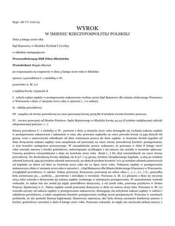 Sygn. akt I C 1120/15 WYROK W IMIENIU RZECZYPOSPOLITEJ POLSKIEJ Dnia 5 lutego 2016 roku Sąd Rejonowy w Kłodzku Wydział I Cywilny w składzie następującym: Przewodniczący SSR Eliza Skotnicka Protokolant Magda Biernat po rozpoznaniu na rozprawie w dniu 5 lutego 2016 roku w Kłodzku sprawy z powództwa C. z siedzibą w W. przeciwko A. M. (1) o zapłatę kwoty 12549,66 zł I. uchyla nakaz zapłaty w postępowaniu nakazowym wydany przez Sąd Rejonowy dla miasta stołecznego Warszawy w Warszawie z dnia 17 sierpnia 2010 roku w sprawie (...) w całości; II. oddala powództwo; III. zasądza od strony powodowej na rzecz pozwanej kwotę 3229,86 zł tytułem zwrotu kosztów procesu; IV. zwraca pozwanej od Skarbu Państwa- Sądu Rejonowego w Kłodzku kwotę 44,24 zł tytułem nadpłaconej zaliczki zdeponowanej pod poz. (...) Strona powodowa C. z siedzibą w W., pozwem z dnia 4 sierpnia 2010 roku domagała się wydania nakazu zapłaty w postępowaniu nakazowym i nakazanie w nim, aby pozwana zapłaciła na rzecz powoda kwotę 12.549 złotych 66 groszy wraz z ustawowymi odsetkami od dnia wniesienia pozwu do dnia zapłaty, w terminie dwóch tygodni od dnia doręczenia nakazu zapłaty oraz zasądzenia od pozwanej na rzecz strony powodowej kosztów postępowania, w tym kosztów zastępstwa procesowego. W uzasadnieniu pozwu wskazano, że pozwana w dniu 8 lutego 2007 roku zawarła umowę o kredyt gotówkowy, zobowiązanie wynikające z tej umowy nie zostało w terminie spłacone. Umową przelewu wierzytelności z dnia 20 kwietnia 2010 roku Bank (...) SA zbył wierzytelność na rzecz strony powodowej. Na dochodzoną kwotę składają się 8.377 i 14 groszy tytułem niespłaconego kapitału, 3.265,42 tytułem odsetek karnych, 595,59 tytułem odsetek umownych, 40 złotych tytułem kosztów i 271,51 tytułem odsetek ustawowych od kapitału za okres od dnia 21 kwietnia 2010 roku do 21 lipca 2010 roku. Nakazem zapłaty w postępowaniu nakazowym z dnia 17 sierpnia 2010 roku w sprawie (...) Sąd Rejonowy dla Miasta Stołecznego Warszawy w Warszawie, uwzględnił powództwo w całości. Nakaz powyższy doręczono, pozwanej na adres ulica (...), (...)-(...) G., przesyłka była awizowana po..., podwój..., powtórnie i nieodjęta w terminie. Pozwana A. M. (1) pismem z dnia 20 stycznia 2015 roku wniosła o doręczenie jej nakazu zapłaty wydanego w niniejszym postępowaniu. W uzasadnieniu wnioski wskazała, że nakaz ten nie został jej nigdy prawidłowo doręczony, a od 2008 roku, pozwana przebywa w Domu Pomocy Społecznej w J.. Nakaz zapłaty został pozwanej doręczony w dniu 20 marca 2015 roku. Pozwana A. M. (1) wniosła zarzuty od nakazu zapłaty w postępowaniu nakazowym, domagając się uchylenia nakazu zapłaty w całości i oddalenia powództwa, a także zasądzenia kosztów postępowania według norm przepisanych. Pozwana w zarzutach podniosła, że nie posiada biernej legitymacji. Stanowczo zaprzecza, aby była stroną czynności bankowej umowy o kredyt, gotówkowy zawartej w dniu 8 lutego 2007 roku. Pozwana wskazała, że nigdy nie zawierała żadnej umowy z Bankiem (...), a ponadto podała, że cierpi na mózgowe porażenie dziecięce, dysplazję stawu biodrowego prawego. Od urodzenia jest osobą niezdolną do samodzielnej egzystencji, jest całkowicie uzależniona od osób trzecich, wymaga całodobowej opieki. Pozwana ma nie do..., niewładne kończyny, nie jest w stanie samodzielnie się poruszać. Ponadto pozwana jest analfabetką, nie czyta, nie pisze, nie jest w stanie nawet się podpisać. Wszelkie czynności, które miałby być dokonane z udziałem pozwanej, odbywają się w obecności notariusza. Ponadto pozwana wskazała, że od 2008 roku mieszka w G., nie mieszka w G., wcześniej zamieszkiwała wraz z matką i braćmi w domu rodzinnym. Matka pozwanej zmarła w 2006 roku. Od 2008 roku pozwana stale przebywa w Domu Pomocy Społecznej w J.. Pozwana z daleko idącej ostrożności procesowej podniosła także zarzut przedawnienia wierzytelności. Sąd ustalił następujący stan faktyczny. W dniu 8 lutego 2007 roku w siedzibie (...) Banku (...) SA z siedzibą we W., sporządzona została umowa o kredyt gotówkowy numer (...). W umowie wpisano A. M. (1) posługującą się dowodem osobistym (...) numer pesel (...) jako kredytobiorcę. Umowa dotyczyła kwoty kredytu w wysokości 10.000 złotych, oprocentowanie na dzień zawarcia kredytu wynosiło 22 procent w stosunku rocznym. Załącznikiem do umowy o kredyt była, było zestawienie terminów i wysokości rat, które należała, należało zgodnie z umową spłacać. Ostatnia rata miała być płatna, do 10 lutego 2012 roku. Na umowie oraz jej załącznikach, widnieją podpisy, przedstawiciela Banku oraz nakreślony podpis wyraźny M.. Dowód umowa o kredyt gotówkowy karta 80 do 85. Bank (...) SA z siedzibą we W. w dniu 20 kwietnia 2010 roku, zawarł z C. z siedzibą w W. umowę sprzedaży wierzytelności, zgodnie z wyciągiem załączonym do tej umowy, przedmiotem umowy zbycia była również wierzytelność, w której wskazano, jako dłużnika A. M. (1), wartość nabytej wierzytelności to kwota 11.938 i 65 groszy na dzień zawarcia tej umowy. Dowód umowa sprzedaży wierzytelności karta 88 do 111 akt. Pozwana A. M. (1) od 16, od 16 kwietnia 2008 roku przebywa w Domu Pomocy Społecznej w J.. Obecnie pozwana ma (...) lat. Przed umieszczeniem w Domu Pomocy Społecznej pozwana zamieszkiwała w mieszkaniu własnościowym jej rodziców. Pozwana ma dziecięce porażenie mózgowe, choroba ta powstała w dzieciństwie, jest analfabetką, nie pisze, nie czyta, nie umie liczyć. Od śmierci rodziców zwłaszcza mamy w 2006 roku, pozwana pozostawała pod opieką brata T. oraz jego dziewczyny. Z uwagi na to, że opieka nie była sprawowana należycie, pozwana była zaniedbywana, została ona umieszczona w Domu Pomocy Społecznej w J.. W J. przebywa od 7 lat, jest stale rehabilitowana. Upośledzenie pozwanej polega na tym, że nie ma ona skoordynowan