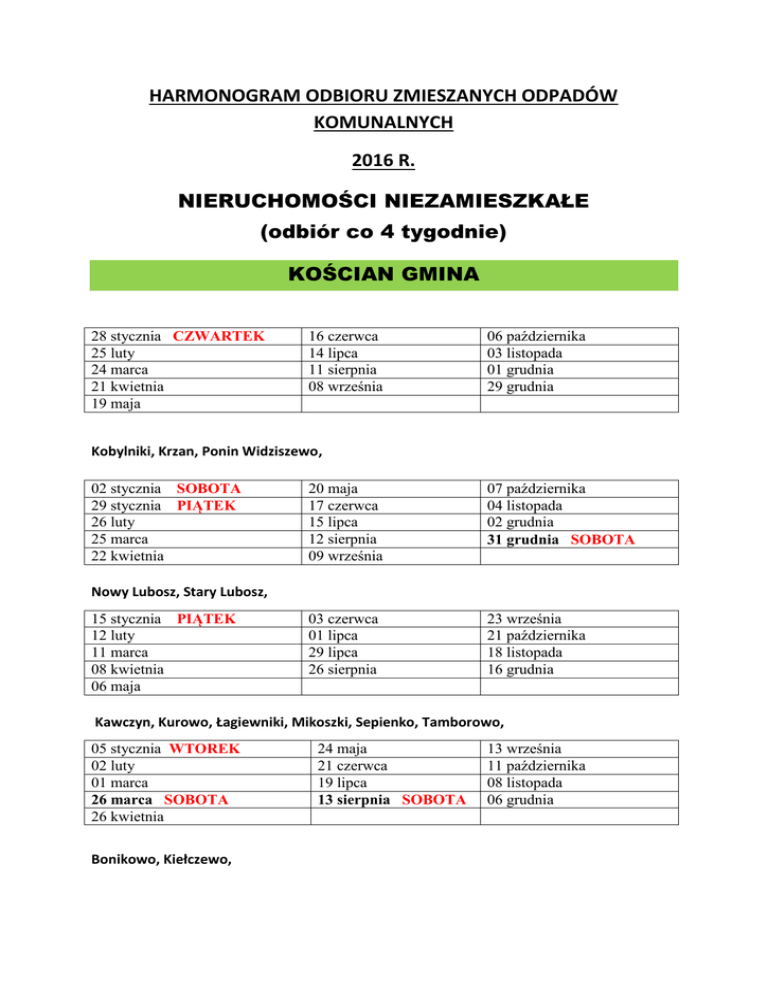 HARMONOGRAM ODBIORU ZMIESZANYCH ODPADÓW KOMUNALNYCH 2016 R. NIERUCHOMOŚCI NIEZAMIESZKAŁE (odbiór co 4 tygodnie) KOŚCIAN GMINA 28 stycznia CZWARTEK 25 luty 24 marca 21 kwietnia 19 maja 16 czerwca 14 lipca 11 sierpnia 08 września 06 października 03 listopada 01 grudnia 29 grudnia Kobylniki, Krzan, Ponin Widziszewo, 02 stycznia SOBOTA 29 stycznia PIĄTEK 26 luty 25 marca 22 kwietnia 20 maja 17 czerwca 15 lipca 12 sierpnia 09 września 07 października 04 listopada 02 grudnia 31 grudnia SOBOTA 03 czerwca 01 lipca 29 lipca 26 sierpnia 23 września 21 października 18 listopada 16 grudnia Nowy Lubosz, Stary Lubosz, 15 stycznia PIĄTEK 12 luty 11 marca 08 kwietnia 06 maja Kawczyn, Kurowo, Łagiewniki, Mikoszki, Sepienko, Tamborowo, 05 stycznia WTOREK 02 luty 01 marca 26 marca SOBOTA 26 kwietnia Bonikowo, Kiełczewo, 24 maja 21 czerwca 19 lipca 13 sierpnia SOBOTA 13 września 11 października 08 listopada 06 grudnia 19 stycznia WTOREK 16 luty 15 marca 12 kwietnia 10 maja 07 czerwca 05 lipca 02 sierpnia 30 sierpnia 27 września 25 października 22 listopada 20 grudnia Darnowo, Granecznik, Ignacewo, Spytkówki, Turew, Witkówki, Wławie, Wronowo, Wyskoć, 05 stycznia WTOREK 02 luty 01 marca 26 marca SOBOTA 26 kwietnia 24 maja 21 czerwca 19 lipca 13 sierpnia SOBOTA 13 września 11 października 08 listopada 06 grudnia Kokorzyn, Pelikan, Sierakowo, Szczodrowo, 08 stycznia PIĄTEK 04 luty CZWARTEK 03 marca 31 marca 28 kwietnia 27 maja PIĄTEK 23 czerwca 21 lipca 18 sierpnia 15 września 13 października 10 listopada 08 grudnia Nowe Oborzyska, Pianowo, Stare Oborzyska, 09 stycznia SOBOTA 04 luty CZWARTEK 03 marca 31 marca 28 kwietnia 28 maja SOBOTA 23 czerwca 21 lipca 18 sierpnia 15 września 13 października 12 listopada SOBOTA 08 grudnia 10 czerwca 08 lipca 05 sierpnia 02 września 30 września 28 października 25 listopada 23 grudnia Racot, 22 stycznia 19 luty 18 marca 15 kwietnia 13 maja Choryń, Katarzynin, Kurza Góra, 12 stycznia WTOREK 09 luty 08 marca 05 kwietnia 30 kwietnia SOBOTA 31 maja 28 czerwca 26 lipca 23 sierpnia 20 września 18 października 15 listopada 13 grudnia 14 czerwca 12 lipca 09 sierpnia 06 września 04 października 29 października SOBOTA 29 listopad 30 grudnia PIĄTEK Czarkowo, Nacław, Nielęgowo, 26 stycznia WTOREK 23 luty 22 marca 19 kwietnia 17 maja Gryżyna, Gryżynka, Januszewo, Nowy Dębiec, Osiek,