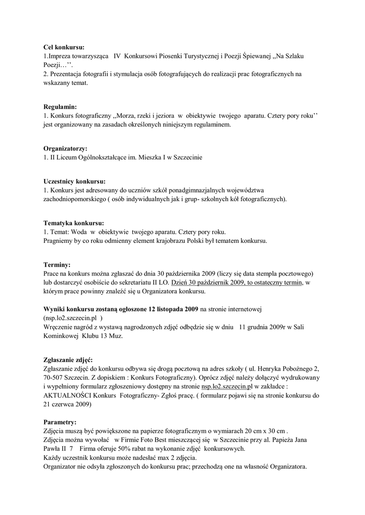 Cel konkursu: 1.Impreza towarzysząca IV Konkursowi Piosenki Turystycznej i Poezji Śpiewanej ,,Na Szlaku Poezji…’’. 2. Prezentacja fotografii i stymulacja osób fotografujących do realizacji prac fotograficznych na wskazany temat. Regulamin: 1. Konkurs fotograficzny ,,Morza, rzeki i jeziora w obiektywie twojego aparatu. Cztery pory roku’’ jest organizowany na zasadach określonych niniejszym regulaminem. Organizatorzy: 1. II Liceum Ogólnokształcące im. Mieszka I w Szczecinie Uczestnicy konkursu: 1. Konkurs jest adresowany do uczniów szkół ponadgimnazjalnych województwa zachodniopomorskiego ( osób indywidualnych jak i grup- szkolnych kół fotograficznych). Tematyka konkursu: 1. Temat: Woda w obiektywie twojego aparatu. Cztery pory roku. Pragniemy by co roku odmienny element krajobrazu Polski był tematem konkursu. Terminy: Prace na konkurs można zgłaszać do dnia 30 października 2009 (liczy się data stempla pocztowego) lub dostarczyć osobiście do sekretariatu II LO. Dzień 30 październik 2009, to ostateczny termin, w którym prace powinny znaleźć się u Organizatora konkursu. Wyniki konkursu zostaną ogłoszone 12 listopada 2009 na stronie internetowej (nsp.lo2.szczecin.pl ) Wręczenie nagród z wystawą nagrodzonych zdjęć odbędzie się w dniu 11 grudnia 2009r w Sali Kominkowej Klubu 13 Muz. Zgłaszanie zdjęć: Zgłaszanie zdjęć do konkursu odbywa się drogą pocztową na adres szkoły ( ul. Henryka Pobożnego 2, 70-507 Szczecin. Z dopiskiem : Konkurs Fotograficzny). Oprócz zdjęć należy dołączyć wydrukowany i wypełniony formularz zgłoszeniowy dostępny na stronie nsp.lo2.szczecin.pl w zakładce : AKTUALNOŚCI Konkurs Fotograficzny- Zgłoś pracę. ( formularz pojawi się na stronie konkursu do 21 czerwca 2009) Parametry: Zdjęcia muszą być powiększone na papierze fotograficznym o wymiarach 20 cm x 30 cm . Zdjęcia można wywołać w Firmie Foto Best mieszczącej się w Szczecinie przy al. Papieża Jana Pawła II 7 Firma oferuje 50% rabat na wykonanie zdjęć konkursowych. Każdy uczestnik konkursu może nadesłać max 2 zdjęcia. Organizator nie odsyła zgłoszonych do konkursu prac; przechodzą one na własność Organizatora. Nadesłanie prac na konkurs stanowi jednocześnie deklarację, że osoba/ grupa nadsyłająca zdjęcie/a i zarejestrowana w formularzu zgłoszeniowym: -jest autorem/ autorką/ autorem grupowym przesłanych zdjęć; -przyjmuje warunki regulaminu konkursu; -wyraża zgodę na nieodpłatne wykorzystanie przez Organizatora Konkursu nadesłanych zdjęć w dowolnym czasie i formie do celów promocji Konkursu Piosenki ,, Na Szlaku Poezji…’’. Nagrody: W konkursie zostaną przyznane nagrody za najlepsze fotografie za najlepsze prace ( I, II i III miejsce) oraz wyróżnienia. Nagrody zostaną wręczone zwycięzcom w dniu Konkursu Piosenki Turystycznej i Poezji Śpiewanej ,, Na Szlaku Poezji’’, czyli 11 grudnia 2009r.Nagrodzone zdjęcia posłużą do stworzenia galerii w czasie trwania konkursu piosenki. JURY: Oceny prac dokonają: 1. Pani Bożena Mozolewska – absolwentka WSP w Szczecinie, kier. matematyka. Ukończyła studia podyplomowe na Uniwersytecie Szczecińskim na kierunkach: matematyką z informatyką oraz sztuka. Jest członkiem Zachodniopomorskiego Stowarzyszenia Twórców Kultury oraz wiceprezesem Szczecińskiego Oddziału Polskiego Stowarzyszenia Racjonalistów. Maluje farbami olejnymi i akrylami , stosuje też enkaustykę. Brała udział w licznych zbiorowych i indywidualnych wystawach plastycznych. Jednym słowem artystyczna dusza wśród belfrów Pobożniaka. 2. Pan Zbigniew Wróblewski- absolwent Studium Fotografii i Filmu COMUK w Warszawie. Prowadził Amatorski Klub Filmowy w Szczecinie. Przez wiele lat pełnił funkcję prezesa Szczecińskiego Towarzystwa Fotograficznego. Instruktor fotografii i filmu w Wojewódzkim Domu Kultury w Szczecinie. Prowadzi warsztaty i kursy fotograficzne i filmowe. 3. Pan Janusz Piszczatowski – zawodowy fotograf z własnym studio w Szczecinie specjalizujący się w fotografii reklamowej. Kilka informacji o Jego wystawach: Cite Internetionale des Arts, Paryż 1983 ;Galeria "Terre Rouge", Luxemburg 1986;Mała Galeria ZAPF, Warszawa 1987; Miesiąc Fotografii w Paryżu, 1988; Brama Królewska BWA, Szczecin 1989; Galeria "Cankarjev Dom", Lubljana 1990; Cykl czarno-białych zdjęć "W pracowni malarza J.B." znajduje się w zbiorach fotografii Muzeum Sztuki Współczesnej Paryża. 4. Pan Arkadiusz Piętak- Absolwent Akademii Sztuk Pięknych w Poznaniu wydziału komunikacji medialnej, kierunek fotografia. Nauczyciel w Wyższej Szkole Sztuki Użytkowej w Szczecinie. Uczestnik wystaw w kraju i za granicą, laureat konkursów fotograficznych. Werdykt Jurorów jest ostateczny i niepodważalny Postanowienia końcowe: Organizatorzy zastrzegają sobie prawo zmiany postanowień niniejszego regulaminu w przypadku istotnych zdarzeń mających wpływ na organizowanie Konkursu. Niniejszy Regulamin wchodzi w życie z dniem rozpoczęcia konkursu i obowiązuje do czasu jego zakończenia. Sponsorzy Konkursu Fotograficznego: 1. 2. 3. 4. 5. 6. 7. 8. Urząd Miasta Szczecin Drukarnia Stardruk Firma NCDC Firma Foto Best Klub 13 Muz Firma KWARK Szczeciński Oddział Polskiego Stowarzyszenia Racjonalistów Sklep CETUS
