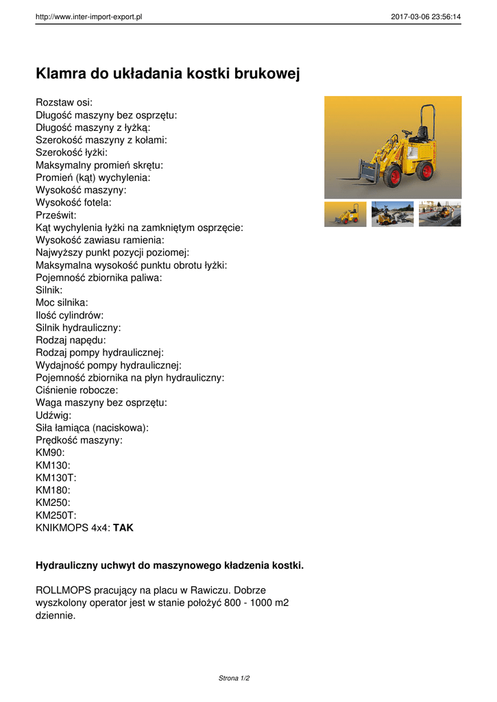 http://www.inter-import-export.pl 2017-03-06 23:56:14 Klamra do układania kostki brukowej Rozstaw osi: Długość maszyny bez osprzętu: Długość maszyny z łyżką: Szerokość maszyny z kołami: Szerokość łyżki: Maksymalny promień skrętu: Promień (kąt) wychylenia: Wysokość maszyny: Wysokość fotela: Prześwit: Kąt wychylenia łyżki na zamkniętym osprzęcie: Wysokość zawiasu ramienia: Najwyższy punkt pozycji poziomej: Maksymalna wysokość punktu obrotu łyżki: Pojemność zbiornika paliwa: Silnik: Moc silnika: Ilość cylindrów: Silnik hydrauliczny: Rodzaj napędu: Rodzaj pompy hydraulicznej: Wydajność pompy hydraulicznej: Pojemność zbiornika na płyn hydrauliczny: Ciśnienie robocze: Waga maszyny bez osprzętu: Udźwig: Siła łamiąca (naciskowa): Prędkość maszyny: KM90: KM130: KM130T: KM180: KM250: KM250T: KNIKMOPS 4x4: TAK Hydrauliczny uchwyt do maszynowego kładzenia kostki. ROLLMOPS pracujący na placu w Rawiczu. Dobrze wyszkolony operator jest w stanie położyć 800 - 1000 m2 dziennie. Strona 1/2 http://www.inter-import-export.pl 2017-03-06 23:56:14 W ciągu ostatnich lat prezentowaliśmy nasze maszyny i położyliśmy około 100 000 m2 kostki w całej Polsce. Ku satysfakcji naszych klientów. Strona 2/2