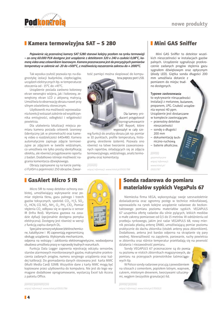 nowe produkty Kamera termowizyjna SAT – S 280 Mini GAS Sniffer Pojawienie się przenośnej kamery SAT S280 stanowi kolejny przełom na rynku termowizji – za cenę 60.000 PLN dostępne jest urządzenie z detektorem 320 x 240 o czułości 0,08°C, kamerą video oraz celownikiem laserowym. Kamera przeznaczona jest do precyzyjnych pomiarów temperatury w zakresie od -20 do +500°C, z możliwością rozszerzenia zakresu do + 2000°C. Tak wysoka czułość pozwala np: na diagnostykę izolacji budynków, ciepłociągów, urządzeń elektrycznych itp. w temperaturze otoczenia od - 15°C do +45°C. Urządzenie posiada zarówno kolorowy ekran wewnątrz wizjera, jak i kolorowy, zewnętrzny ekran LCD z aktywną matrycą. Umożliwia to obserwację obrazu nawet przy silnym oświetleniu słonecznym. Użytkownik ma możliwość wprowadzania korekcji wskazań zależnie od współczynnika emisyjności, odległości i wilgotności powietrza. Dla ułatwienia lokalizacji miejsca pomiaru kamera posiada celownik laserowy (identyczny jak w pirometrach) oraz kamerę video o rozdzielczości 640x480. Kamera automatycznie zapisuje zdjęcie termowizyjne ze zdjęciem w świetle widzialnym, co umożliwia nie tylko prostą identyfikację obiektu, ale również przygotowanie raportu z badań. Dodatkowo istnieje możliwość nagrania komentarza dźwiękowego. Obrazy zapisywane są na karcie pamięci FLASH o pojemności 250 obrazów. Zawar- tość pamięci można skopiować do komputera poprzez port USB. Dla kamery producent przygotował oprogramowanie SAT Report, które wyposażył w cały szereg funkcji do analizy obrazu jak np: pomiar w 10 punktach, profile temperatury, histogramy, określenie izoterm). Pozwala ono również na łatwe tworzenie zaawansowanych raportów, składających się ze zdjęcia termowizyjnego, widzialnego, analiz termogramu oraz komentarzy. Mini GAS Sniffer to detektor wszelkich nieszczelności w instalacjach gazów palnych. Urządzenie sygnalizuje przekroczenie zadanych progów stężenia gazu sygnałem dźwiękowym oraz optycznym (diody LED). Giętka sonda długości 200 mm umożliwia dotarcie z pomiarem do miejsc trudno dostępnych. Typowe zastosowanie to wykrywanie nieszczelności instalacji z metanem, butanem, propanem, LPG. Czułość urządzenia wynosi 40 ppm. Urządzenie jest dostarczane w komplecie zawierającym: – przenośny detektor nieszczelności – sondę o długości 200 mm – dokumentację techniczno-ruchową – baterie alkaliczne. pomiary gazometryczne więcej informacji: pirometry www.introl.pl/ więcej informacji: www.introl.pl/05011788 05011787 GasAlert Micro 5 IR Sonda radarowa do pomiaru materiałów sypkich VegaPuls 67 Micro 5IR to nowy detektor ochrony osobistej, umożliwiający wykrywanie oraz pomiar stężenia tlenu, gazu palnego i trzech gazów toksycznych, spośród: CO2, H2S, SO2, O2, HCN, CO, NO2, NH3, O3, PH3, ClO2. Pomiar stężenia CO2 odbywa się w oparciu o sensor IR (Infra Red). Wymiana gazowa na zasadzie dyfuzji (opcjonalnie dostępna pompka elektryczna). Dostępny jest również w wersji z funkcją zapisu danych DL. Specjalne sensory wtykowe (elektrochemiczne, katalityczne i IR) zapewniają ergonomiczną obsługę urządzenia. Wytrzymała mechanicznie, odporna na wstrząsy i zakłócenia elektromagnetyczne, wodoodporna obudowa umożliwia pracę w naprawdę trudnych warunkach. Funkcja Data Logger zapewnia rejestrację odczytu sensorów, stanów alarmowych monitorowanych gazów, maksymalne przekroczenia zadanych progów, numeru seryjnego urządzenia oraz każdej kalibracji. Do gromadzenia danych stosowana jest karta MMC (Multi Media Card) 32MB. Wszystkie dane z karty MMC mogą być kopiowane przez użytkownika do komputera. Nie jest do tego wymagane dodatkowe oprogramowanie, wystarczą Excel lub Access z pakietu Office. Niemiecka firma VEGA, wykorzystując swoje szesnastoletnie doświadczenia oraz ogromny postęp w technice mikrofalowej, wprowadziła na rynek kolejne urządzenie radarowe do bezkontaktowego pomiaru poziomu materiałów sypkich. VEGAPULS 67 uzupełnia ofertę radarów dla silnie pylących, lekkich mediów o małe zakresy pomiarowe od 0,5 do 15 metrów. W odróżnieniu od przeboju rynkowego, jakim jest radar VEGAPULS 68, nowy miernik posiada płaską antenę DN80, umożliwiającą pomiar poziomu praktycznie do dachu zbiornika (stożek anteny poza zbiornikiem). Dodatkowo, antena jest bardzo odporna na skraplanie się pary wodnej. Niewrażliwość na zapylenie, parowanie, ruchy powietrza w zbiorniku oraz różnice temperatur przekładają się na pewność działania i niezawodność pomiaru. Sondy VEGAPULS 67 przeznaczone są do pomiaru poziomu w niskich zbiornikach magazynowych, do pomiaru na przesypach przenośników taśmociągowych itp. W Polsce sondy radarowe pracują z powodzeniem na silosach z cementem, popiołem lotnym, wapnem, cukrem, mielonym drewnem, tworzywami sztucznymi, węglem (wszystkie granulacje) itd. pomiary gazometryczne pomiary poziomu więcej informacji: www.introl.pl/05011786 więcej informacji: www.introl.pl/17010121 4 nowe produkty Rejestrator wideograficzny dla każdego Firma Brainchild, uzupełniając swoją ofertę rejestratorów wideograficznych, wprowadziła do sprzedaży nowy, tani rejestrator VR06. Jego parametry techniczne są identyczne z parametrami doskonale znanego rejestratora VR18: ten sam duży, kolorowy wyświetlacz 6,4”, te same wymiary zewnętrzne, 6 slotów do montażu kart rozszerzeń (np. z modułami wejść i wyjść cyfrowych) oraz to samo oprogramowanie w języku polskim (!). Jedyna różnica polega na ograniczeniu ilości kanałów: VR06 obsługuje maksymalnie 6 kanałów wejściowych. Atrakcyjna cena stanowi ważne uzupełnienie zalet rejestratora VR06. rejestracja i wizualizacja więcej informacji: www.introl.pl/02030009 Pierwszy na świecie kalibrator Fieldbus Na całym świecie gwałtownie rośnie liczba instalacji Fieldbus. Sam rynek systemów Fieldbus jest duży, ale spośród wszy