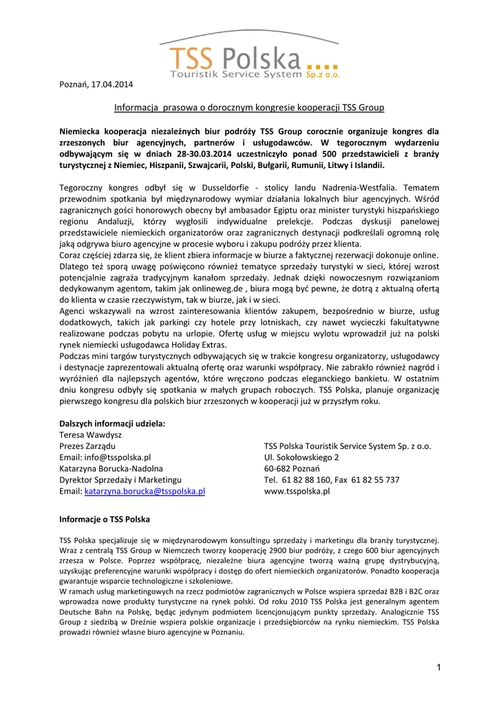 Poznań, 17.04.2014 Informacja prasowa o dorocznym kongresie kooperacji TSS Group Niemiecka kooperacja niezależnych biur podróży TSS Group corocznie organizuje kongres dla zrzeszonych biur agencyjnych, partnerów i usługodawców. W tegorocznym wydarzeniu odbywającym się w dniach 28-30.03.2014 uczestniczyło ponad 500 przedstawicieli z branży turystycznej z Niemiec, Hiszpanii, Szwajcarii, Polski, Bułgarii, Rumunii, Litwy i Islandii. Tegoroczny kongres odbył się w Dusseldorfie - stolicy landu Nadrenia-Westfalia. Tematem przewodnim spotkania był międzynarodowy wymiar działania lokalnych biur agencyjnych. Wśród zagranicznych gości honorowych obecny był ambasador Egiptu oraz minister turystyki hiszpańskiego regionu Andaluzji, którzy wygłosili indywidualne prelekcje. Podczas dyskusji panelowej przedstawiciele niemieckich organizatorów oraz zagranicznych destynacji podkreślali ogromną rolę jaką odgrywa biuro agencyjne w procesie wyboru i zakupu podróży przez klienta. Coraz częściej zdarza się, że klient zbiera informacje w biurze a faktycznej rezerwacji dokonuje online. Dlatego też sporą uwagę poświęcono również tematyce sprzedaży turystyki w sieci, której wzrost potencjalnie zagraża tradycyjnym kanałom sprzedaży. Jednak dzięki nowoczesnym rozwiązaniom dedykowanym agentom, takim jak onlineweg.de , biura mogą być pewne, że dotrą z aktualną ofertą do klienta w czasie rzeczywistym, tak w biurze, jak i w sieci. Agenci wskazywali na wzrost zainteresowania klientów zakupem, bezpośrednio w biurze, usług dodatkowych, takich jak parkingi czy hotele przy lotniskach, czy nawet wycieczki fakultatywne realizowane podczas pobytu na urlopie. Ofertę usług w miejscu wylotu wprowadził już na polski rynek niemiecki usługodawca Holiday Extras. Podczas mini targów turystycznych odbywających się w trakcie kongresu organizatorzy, usługodawcy i destynacje zaprezentowali aktualną ofertę oraz warunki współpracy. Nie zabrakło również nagród i wyróżnień dla najlepszych agentów, które wręczono podczas eleganckiego bankietu. W ostatnim dniu kongresu odbyły się spotkania w małych grupach roboczych. TSS Polska, planuje organizację pierwszego kongresu dla polskich biur zrzeszonych w kooperacji już w przyszłym roku. Dalszych informacji udziela: Teresa Wawdysz Prezes Zarządu Email: [email protected] Katarzyna Borucka-Nadolna Dyrektor Sprzedaży i Marketingu Email: [email protected] TSS Polska Touristik Service System Sp. z o.o. Ul. Sokołowskiego 2 60-682 Poznań Tel. 61 82 88 160, Fax 61 82 55 737 www.tsspolska.pl Informacje o TSS Polska TSS Polska specjalizuje się w międzynarodowym konsultingu sprzedaży i marketingu dla branży turystycznej. Wraz z centralą TSS Group w Niemczech tworzy kooperację 2900 biur podróży, z czego 600 biur agencyjnych zrzesza w Polsce. Poprzez współpracę, niezależne biura agencyjne tworzą ważną grupę dystrybucyjną, uzyskując preferencyjne warunki współpracy i dostęp do ofert niemieckich organizatorów. Ponadto kooperacja gwarantuje wsparcie technologiczne i szkoleniowe. W ramach usług marketingowych na rzecz podmiotów zagranicznych w Polsce wspiera sprzedaż B2B i B2C oraz wprowadza nowe produkty turystyczne na rynek polski. Od roku 2010 TSS Polska jest generalnym agentem Deutsche Bahn na Polskę, będąc jedynym podmiotem licencjonującym punkty sprzedaży. Analogicznie TSS Group z siedzibą w Dreźnie wspiera polskie organizacje i przedsiębiorców na rynku niemieckim. TSS Polska prowadzi również własne biuro agencyjne w Poznaniu. 1
