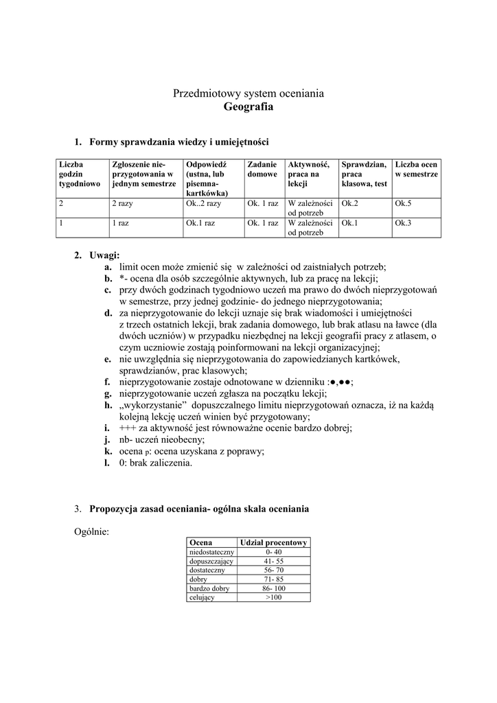 Przedmiotowy system oceniania Geografia 1. Formy sprawdzania wiedzy i umiejętności Liczba godzin tygodniowo Zgłoszenie nieprzygotowania w jednym semestrze Zadanie domowe Aktywność, praca na lekcji Sprawdzian, Liczba ocen praca w semestrze klasowa, test 2 razy Odpowiedź (ustna, lub pisemnakartkówka) Ok..2 razy 2 Ok. 1 raz Ok.2 Ok.5 1 raz Ok.1 raz Ok. 1 raz W zależności od potrzeb W zależności od potrzeb 1 Ok.1 Ok.3 2. Uwagi: a. limit ocen może zmienić się w zależności od zaistniałych potrzeb; b. *- ocena dla osób szczególnie aktywnych, lub za pracę na lekcji; c. przy dwóch godzinach tygodniowo uczeń ma prawo do dwóch nieprzygotowań w semestrze, przy jednej godzinie- do jednego nieprzygotowania; d. za nieprzygotowanie do lekcji uznaje się brak wiadomości i umiejętności z trzech ostatnich lekcji, brak zadania domowego, lub brak atlasu na ławce (dla dwóch uczniów) w przypadku niezbędnej na lekcji geografii pracy z atlasem, o czym uczniowie zostają poinformowani na lekcji organizacyjnej; e. nie uwzględnia się nieprzygotowania do zapowiedzianych kartkówek, sprawdzianów, prac klasowych; f. nieprzygotowanie zostaje odnotowane w dzienniku :●,●●; g. nieprzygotowanie uczeń zgłasza na początku lekcji; h. „wykorzystanie” dopuszczalnego limitu nieprzygotowań oznacza, iż na każdą kolejną lekcję uczeń winien być przygotowany; i. +++ za aktywność jest równoważne ocenie bardzo dobrej; j. nb- uczeń nieobecny; k. ocena p: ocena uzyskana z poprawy; l. 0: brak zaliczenia. 3. Propozycja zasad oceniania- ogólna skala oceniania Ogólnie: Ocena niedostateczny dopuszczający dostateczny dobry bardzo dobry celujący Udział procentowy 0- 40 41- 55 56- 70 71- 85 86- 100 >100 Stopnie szkolne: Ocena dopuszczająca- na wystawienie uczniowi oceny dopuszczającej pozwala przyswojenie przez niego treści koniecznych. Taki uczeń przy pomocy nauczyciela jest w stanie nadrobić braki w podstawowych umiejętnościach. Ocena dostateczna- może ją otrzymać uczeń, który opanował wiadomości podstawowe i z niewielką pomocą nauczyciela potrafi rozwiązać podstawowe problemy. Analizuje również podstawowe zależności , próbuje porównywać, wnioskować i zajmować odpowiednie stanowisko. Ocena dobra- uczeń opanował treści rozszerzające, właściwie stosuje terminologię przedmiotową, aktywnie uczestniczy w zajęciach oraz stosuje wiadomości w sytuacjach typowych wg wzorów znanych z lekcji i z podręcznika, a także rozwiązuje problemy z wykorzystaniem poznanych metod. Samodzielnie pracuje z podręcznikiem, materiałami źródłowymi. Ocena bardzo dobra- uczeń może otrzymać ocenę bardzo dobrą, jeśli opanował treści dopełniające. Potrafi samodzielnie interpretować zjawiska i bronić swoich poglądów. Ocena celująca- uczeń otrzymuje ocenę celującą, jeśli opanował treści wykraczające poza informacje w podręczniku, potrafi selekcjonować i hierarchiwizować wiadomości, prowadzi własne prace badawcze, z powodzeniem bierze udział w konkursach i olimpiadach przedmiotowych. Propozycja skali ocen do testów : 95%-100%: celujący, 86%-94%: bardzo dobry, 75%-85%: dobry, 58%-74%: dostateczny, 40%-57%: dopuszczający, 0%-39%: niedostateczny. 4. Zasady zaliczania prac klasowych i sprawdzianów określone są w Wewnątrzszkolnym Systemie Oceniania. 5. Zasady poprawiania wyników niekorzystnych uczeń ustala z nauczycielem (WSO). 6. Zasady oceniania uczniów, u których stwierdzono specyficzne trudności w uczeniu się lub deficyty rozwojowe określa WSO- obniżenie wymagań edukacyjnych zgodnie z zaleceniami PPP. (Z reguły jest to obniżenie punktacji na poszczególne oceny o ok. 10%, wydłużenie czasu pisania, ocenianie zgodne z zaleceniami poradni itp.). 7. Dokonując analizy wyników testów gimnazjalnych, w związku z zaistniałymi potrzebami, przez cały okres trwania nauki w gimnazjum uczniów obowiązuje umiejętność wyznaczania współrzędnych geograficznych, a także znajomość i umiejętność posługiwania się mapami tematycznymi (np. mapa fizyczna świata, mapa polityczna Europy, mapa fizyczna i administracyjna Polski i in.). 8. Ocena semestralna i roczna: zgodnie z Wewnątrzszkolnym Systemem Oceniania.