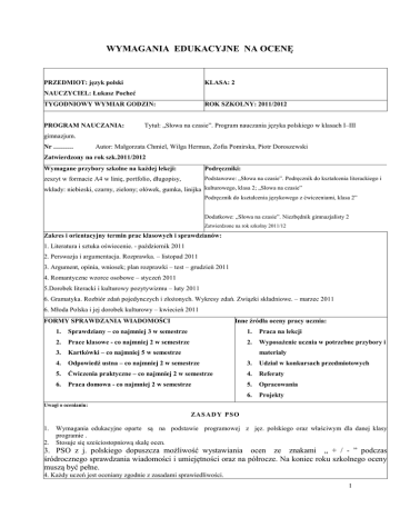 WYMAGANIA EDUKACYJNE NA OCENĘ PRZEDMIOT: język polski KLASA: 2 NAUCZYCIEL: Łukasz Pocheć TYGODNIOWY WYMIAR GODZIN: PROGRAM NAUCZANIA: ROK SZKOLNY: 2011/2012 Tytuł: „Słowa na czasie”. Program nauczania języka polskiego w klasach I–III gimnazjum. Nr ……… Autor: Małgorzata Chmiel, Wilga Herman, Zofia Pomirska, Piotr Doroszewski Zatwierdzony na rok szk.2011/2012 Wymagane przybory szkolne na każdej lekcji: Podręczniki: zeszyt w formacie A4 w linię, portfolio, długopisy, Podstawowe: „Słowa na czasie”. Podręcznik do kształcenia literackiego i wkłady: niebieski, czarny, zielony; ołówek, gumka, linijka kulturowego, klasa 2; „Słowa na czasie” Podręcznik do kształcenia językowego z ćwiczeniami, klasa 2” Dodatkowe: „Słowa na czasie”. Niezbędnik gimnazjalisty 2 Zatwierdzone na rok szkolny 2011/12 Zakres i orientacyjny termin prac klasowych i sprawdzianów: 1. Literatura i sztuka oświecenie. - październik 2011 2. Perswazja i argumentacja. Rozprawka. – listopad 2011 3. Argument, opinia, wniosek; plan rozprawki – test – grudzień 2011 4. Romantyczne wzorce osobowe – styczeń 2011 5.Dorobek literacki i kulturowy pozytywizmu – luty 2011 6. Gramatyka. Rozbiór zdań pojedynczych i złożonych. Wykresy zdań. Związki składniowe. – marzec 2011 6. Młoda Polska i jej dorobek kulturowy – kwiecień 2011 FORMY SPRAWDZANIA WIADOMOŚCI Inne źródła oceny pracy ucznia: 1. Sprawdziany – co najmniej 3 w semestrze 1. Praca na lekcji 2. Prace klasowe - co najmniej 2 w semestrze 2. Wyposażenie ucznia w potrzebne przybory i 3. Kartkówki – co najmniej 5 w semestrze 4. Odpowiedź ustna – co najmniej 2 w semestrze 3. Udział w konkursach przedmiotowych 5. Ćwiczenia praktyczne – co najmniej 2 w semestrze 4. Referaty 6. Praca domowa - co najmniej 2 w semestrze 5. Opracowania 6. Projekty materiały Uwagi o ocenianiu: ZA S A D Y P SO 1. 2. Wymagania edukacyjne oparte są na podstawie programowej z jęz. polskiego oraz właściwym dla danej klasy programie . Stosuje się sześciostopniową skalę ocen. 3. PSO z j. polskiego dopuszcza możliwość wystawiania ocen ze znakami „ + / - ” podczas śródrocznego sprawdzania wiadomości i umiejętności oraz na półrocze. Na koniec roku szkolnego oceny muszą być pełne. 4. Każdy uczeń jest oceniany zgodnie z zasadami sprawiedliwości. 1 5. Ocenie podlegają wszystkie wymienione poniżej formy aktywności ucznia . 6. Każdy uczeń powinien otrzymać w ciągu semestru minimum 16 ocen. 7. Prace klasowe są obowiązkowe. Jeżeli uczeń opuścił pracę klasową, to musi napisać ją w ciągu dwóch tygodni od dnia powrotu do szkoły. Poprawę może pisać tylko jeden raz. 8. Przy poprawianiu prac klasowych i pisaniu w drugim terminie kryteria ocen nie zmieniają się. 9. Prace klasowe i testy z większej partii materiału są zapowiadane z tygodniowym wyprzedzeniem, sprawdziany ortograficzne – przynajmniej dwudniowym, natomiast krótkie kartkówki obejmujące nie więcej niż trzy ostatnie lekcje, mogą być przeprowadzane bez zapowiedzi. 10. Pisemne prace domowe uczeń jest zobowiązany oddać w ustalonym terminie. Nauczyciel może, ale nie musi, wyznaczyć dodatkowy termin. Nieoddanie pracy skutkuje oceną niedostateczną. 11. Wszystkie prace pisemne uczeń musi poprawić, czyli dokonać analizy i korekty popełnionych błędów. 12. Pracą domową jest również przeczytanie tekstu literackiego. Niewykonanie takiej pracy skutkuje oceną niedostateczną. 13. Wszystkie prace klasowe powinny być opatrzone czytelnym podpisem ucznia i tematem pracy oraz gromadzone przez nauczyciela, tak aby uczeń i jego rodzice mieli do nich wgląd. 14. Prace pisemne muszą być napisane czytelnie, a zeszyty przedmiotowe prowadzone estetycznie. 15. Zeszyt przedmiotowy musi być czytelnie podpisany (imię, nazwisko, klasa) i mieć formę skoroszytu A4 (min. 100 kartek). Należy stosować pięciocentymetrowe aktywne marginesy oraz czytelny sposób wyróżniania ważnych informacji. Tematy lekcji muszą być wyróżnione graficznie. Zeszyt musi być uzupełniony i starannie prowadzony. Wszelkie dodatkowe materiały dydaktyczne (wkładki, wklejki, rysunki, etc.) muszą być przyporządkowane do właściwego tematu i odpowiadającej mu jednostce lekcyjnej. Wszystkie lekcje muszą być numerowane i opatrzone właściwą datą. Zeszyt musi być prowadzony jednym kolorem długopisu / pióra (za wyjątkiem wyróżnień). Kolor czerwony jest zarezerwowany tylko dla nauczyciela. Uczniowie nie mogą używać długopisów/piór w kolorze zbliżonym do czerwonego (np. różowy) oraz w kolorach słabo widocznych na papierze. Okładka zeszytu stanowi jego integralną część. 17. Oprócz zeszytu przedmiotowego uczeń jest zobowiązany do prowadzenia portfolio, w którym gromadzone będą materiały przygotowujące do egzaminu gimnazjalnego. 16. Uczeń może na własną prośbę poprawić inną ocenę cząstkową w terminie nie dłuższym niż tydzień od wystawienia tej oceny. Prawo poprawy oceny przysługuje tylko raz. 17. Nie ma możliwości poprawiania ocen na tydzień przed klasyfikacją. 18. Nie ocenia się uczniów do trzech dni po dłuższej usprawiedliwionej nieobecności w szkole (min. 3 dni). 19. Uczeń może nie być klasyfikowany z przedmiotu zgodnie z zapisem z Statucie Szkoły. 20. Każdy uczeń ma prawo do dodatkowych ocen za wykonane prace nadobowiązkowe. 21. Uczeń jest zobowiązany do noszenia podręczników i zeszytu na każdą lekcję. Ich brak jest równoznaczny z brakiem przygotowania do zajęć i skutkuje oceną niedostateczną. 22. Uczeń ma prawo dwukrotnie w ciągu semestru zgłosić nieprzygotowanie do lekcji ( nie dotyczy prac pisemnych i podręcznika/zeszytu ćwiczeń ) 23. W przypadku wykrycia nieuczciwości (ściąganie podczas sprawdzianu, oszukiwanie co do autentyczności pracy, itp.) uczeń otrzymuje ocenę niedostateczną, ujętą w kółko i wpisaną do dziennika na czerwono – bez możliwośc