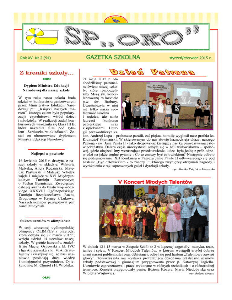 Rok XV Nr 2 (94) dc Dyplom Ministra Edukacji Narodowej dla naszej szkoły W tym roku nasza szkoła brała udział w konkursie organizowanym przez Ministerstwo Edukacji Narodowej pt.: „Książki naszych marzeń”, którego celem była popularyzacja czytelnictwa wśród dzieci i młodzieży. W realizacji zadań konkursowych wyróżniła się klasa III B, która nakręciła film pod tytułem ,,Serduszka w okładkach”. Został on uhonorowany dyplomem Ministra Edukacji Narodowej. Najlepsi w powiecie 16 kwietnia 2015 r. drużyna z naszej szkoły w składzie: Wiktoria Małyska, Alicja Rudzińska, Mateusz Pastuszak i Mateusz Włodek zajęła I miejsce w XVI Międzyszkolnym Turnieju Rowerowym o Puchar Burmistrza. Zwycięstwo dało jej awans do finału wojewódzkiego XXXVIII Ogólnopolskiego Turnieju Bezpieczeństwa Ruchu Drogowego w Krynce k/Łukowa. Naszych uczniów przygotował pan Karol Madyniak. GAZETKA SZKOLNA styczeń/czerwiec 2015 r. 21 maja 2015 r. obchodziliśmy patronalne święto naszej szkoły, które rozpoczęliśmy Mszą św. koncelebrowaną w kościele p.w. św. Barbary. Uczestniczyła w niej nie tylko nasza społeczność szkolna i rodzice, ale także laureaci konkursu papieskiego wraz z opiekunami. Liturgii przewodniczył ks. kan. Andrzej Lupa – proboszcz parafii, zaś piękną homilię wygłosił nasz prefekt ks. Krzysztof Szymański. W skierowanym do nas słowie kaznodzieja ukazał naszego Patrona - św. Jana Pawła II - jako drogowskaz kierujący nas ku prawdziwemu człowieczeństwu. Dalsza część uroczystości odbyła się w hali widowiskowo – sportowej, gdzie obejrzeliśmy wzruszające przedstawienie, które było jedną z prób odpowiedzi na jakże trudne pytanie : Co to znaczy być człowiekiem? Następnie odbyło się podsumowanie XII Konkursu o Papieżu Janie Pawle II odbywającego się pod hasłem: „Być człowiekiem - to znaczy...”, którego zwycięzcy otrzymali nagrody i wyróżnienia z rąk zaproszonych gości i dyrekcji szkoły. opr. Monika Książek – Murawska V Koncert Młodych Talentów Sukces uczniów w olimpiadzie W sesji wiosennej ogólnopolskiej olimpiady OLIMPUS z przyrody, która odbyła się 27 marca 2015r., wzięło udział 14 uczniów naszej szkoły. W gronie laureatów znaleźli się Maciej Ostrowski z kl. IVC i Iga Arciszewska z kl. VIA. Gratulujemy i cieszymy się, że nasi uczniowie posiadają dużą wiedzę i umiejętności przyrodnicze. Opiekunowie: M. Chmiel i H. Wrońska. dc W dniach 12 i 13 marca w Zespole Szkół nr 2 w Łęcznej zagościły: muzyka, teatr, taniec i śpiew. V Koncert Młodych Talentów, w którym wystąpili artyści dobrze znani naszej publiczności oraz debiutanci, odbył się pod hasłem „Talentowy zawrót głowy”. Towarzyszyła mu wystawa prezentująca dokonania plastyczne uczniów szkoły podstawowej i gimnazjum przygotowana przez p. Katarzynę Jagiełło. Uczniowie zaprezentowali prace wykonane w różnych technikach i o różnorodnej tematyce. Koncert przygotowały panie: Bożena Kozyra, Marta Niedobylska oraz Wioletta Wójtowicz. opr. Bożena Kozyra SP„OKO” Nr 2—styczeń/czerwiec 2015 r. Str. 2 Wydarzenia, wywiady, opinie... Dzień Języka Ojczystego Turniej Tańca Nowoczesnego 2015 Zapewne znane są wszystkim słowa Mikołaja Reja „Niechaj narodowie wżdy postronni znają, iż Polacy nie gęsi, iż swój język mają”. Czasem jednak przysłuchując się rozmowom, jakie toczą ze sobą szczególnie osoby młode, zaczynamy się zastanawiać, czy to na pewno ,,po polsku”. Skróty, półsłówka, już nawet ,,kocham Cię” można zastąpić dwiema literami (KC). Dlatego bardzo ważne jest, aby przypominać, w szczególności młodzieży, że język to bogactwo, to skarb, za który nasi przodkowie przelewali krew. Wspaniałą okazją do podkreślenia roli mowy ojczystej i naszej odpowiedzialności za nią stał się organizowany w naszej szkole już po raz piąty Dzień Języka Ojczystego. Uczniowie klas IV – VI zmierzyli się z tekstem językowym oraz dyktandem. Turnieje taneczne są zazwyczaj bardzo widowiskowe i wzbudzają zainteresowanie wielu widzow. 31 maja 2015 r. w hali sportowej Zespołu Szkoł nr 2 w Łęcznej odbył się XI Turniej Tanca Nowoczesnego o Puchar Burmistrza Łęcznej. Celem imprezy była konfrontacja dorobku artystycznego młodych tancerzy, a takze zachęta do aktywnosci tworczej. Uroczystosc rozpoczęły dzieci tanczące solowki. Następnie zaprezentowały się duety, a pozniej formacje. Po długim oczekiwaniu ogłoszono wyniki turnieju. Dla jednych stały się powodem do radosci, a dla innych powodem do smutku, a jednoczesnie motywacją do poprawienia swoich umiejętnosci. Nagrody wręczał burmistrz miasta Łęczna, pan Teodor Kosiarski. W imprezie uczestniczyli m.in. reprezentanci władz miejskich oraz przedstawiciele mediow. Uczniowie naszej szkoły odniesli w niej duze sukcesy w roznych kategoriach. Wielu z nich bierze udział w zajęciach tanecznych w Centrum Kultury. opr. M. Książek - Murawska Opracowały: Dominika Lisowska, Eliza Cieniuch „Kreatywne dźwięki” Gdzie pojedziesz na wakacje i jak je spędzisz? W dniach 13-14 maja 2015r. w naszej szkole odbyły się warsztaty muzyczne „Kreatywne dzwięki”. W czasie zajęc uczniowie klas I-VI mieli mozliwosc tworzenia, nagrywania i przetwarzania dzwiękow przy pomocy nowoczesnych instrumentow i urządzen elektronicznych. Warsztaty prowadzili instruktorzy warszawskiej pracowni muzycznej „Montownia dzwięku” Karolina Błasik i Antoni Sojka. Zaproponowana forma zajęc muzycznych spotkała się z pozytywnym odbiorem, a zywiołowe i spontaniczne reakcje uczniow wskazują na potrzebę organizowania tego typu lekcji. Estera kl. V Na początku wakacji pojadę na kolonie nad morze. Potem odwiedzę babcię, a pod sam koniec ferii letnich wybiorę się na Śląsk. Amelka kl. V W lipcu jadę na kolonie do Kotliny Kłodzkiej, a w sierpniu do siostry do Warszawy na koncert. Bartek kl. V W wakacje pojadę do Niem