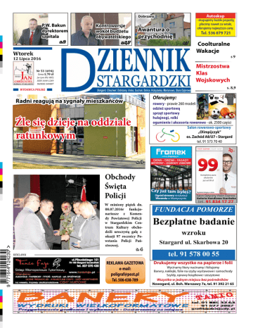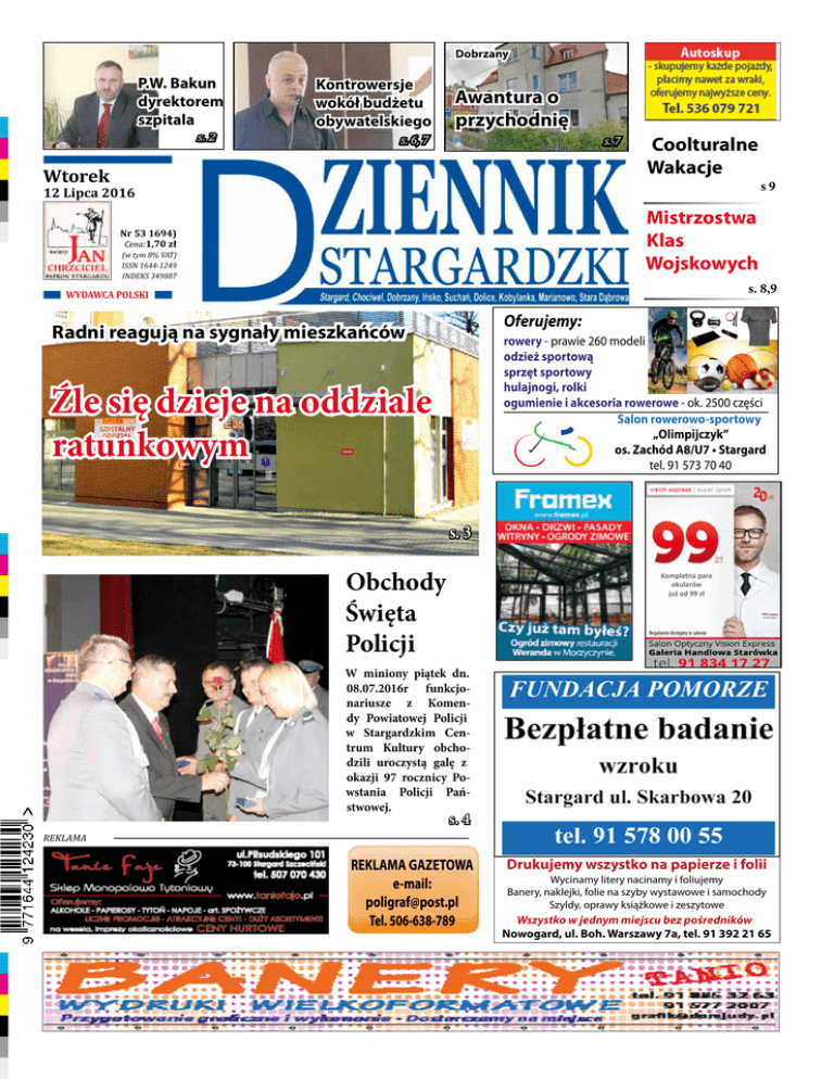 Dobrzany P.W. Bakun dyrektorem szpitala s. 2 Kontrowersje wokół budżetu obywatelskiego Awantura o przychodnię s. 6, 7 s. 7 Wtorek Coolturalne Wakacje 12 Lipca 2016 s9 Mistrzostwa Klas Wojskowych Nr 53 1694) Cena:1,70 zł (w tym 8% VAT) ISSN 1644-1249 INDEKS 349887 s. 8,9 SALON ROWEROWO - SPORTOWY WYDAWCA POLSKI Oferujemy: Radni reagują na sygnały mieszkańców rowery - prawie 260 modeli odzież sportową sprzęt sportowy hulajnogi, rolki ogumienie i akcesoria rowerowe - ok. 2500 części Salon rowerowo-sportowy „Olimpijczyk” os. Zachód A8/U7 • Stargard tel. 91 573 70 40 Źle się dzieje na oddziale ratunkowym s. 3 Obchody Święta Policji Kompletna para okularów już od 99 zł Regulamin dostępny w salonie W miniony piątek dn. 08.07.2016r funkcjonariusze z Komendy Powiatowej Policji w Stargardzkim Centrum Kultury obchodzili uroczystą galę z okazji 97 rocznicy Powstania Policji Państwowej. s. 4 Reklama REKLAMA GAZETOWA e-mail: [email protected] Tel. 506-638-789 Drukujemy wszystko na papierze i folii Wycinamy litery nacinamy i foliujemy Banery, naklejki, folie na szyby wystawowe i samochody Szyldy, oprawy książkowe i zeszytowe Wszystko w jednym miejscu bez pośredników Nowogard, ul. Boh. Warszawy 7a, tel. 91 392 21 65 2 Nr 53 (1694) Puls Miasta Nasza Sonda Kluczowym składnikiem zdrowego stylu życia oprócz prawidłowego odżywiania jest również aktywność fizyczna. Każdy dzień jest świetną okazją do tego, aby zadbać o siebie i swoje zdrowie. Dlatego tym razem w naszej sondzie pytamy mieszkańców Stargardu jak często podejmują aktywność fizyczną ? Weronika - Oczywiście, że uprawiam sport. Trenuję zapasy i sumo. Zajęłam ostatnio trzecie miejsce na Mistrzostwach Europy w sumo. Każdego dnia ćwiczę, aby być w dobrej formie, w końcu zależy mi również na tym, aby efekty mojej pracy były widoczne na zawodach. Pamiętam, że nawet w szkole podstawowej byłam aktywna fizycznie, za każdym razem brałam udział w zawodach sportowych. W domu nawet mam stworzoną dla siebie taką mini-siłownię. Podnoszę ciężary, wykonuję ćwiczenia. Jeżdżę dość często na rowerze. 121 Barierki drogowe, które prezentujemy na fotografii są w opłakanym stanie. Taki widok można zaobserwować na ulicy Szczecińskiej tuż za wiaduktem. – Chciałabym zwrócić uwagę na barierki, które oddzielają chodnik od drogi na ulicy Szczecińskiej. Barierki od podstaw są uszkodzone i spróchniałe. Myślę, że warto byłoby wymienić je na nowe. Pod względem wizualnym również nie wyglądają dobrze. Najważniejsze jest to, że mają one nam zapewnić bezpieczeństwo, a w takim stanie nam tego nie gwarantują. – mówi mieszkanka Stargardu, która poinformowała nas o całej sprawie. 122 Na ulicy Szczecińskiej, niedaleko stacji BP znajduje się hydrant zewnętrzny, który od jakiegoś czasu nie posiada pokrywy nasady. W dodatku płyta chodnikowa, która otacza z jednej strony obiekt jest zapadnięta. – Myślę, że warto byłoby zwrócić uwagę na hydrant, który znajduje się na ulicy Szczecińskiej. Warto byłoby zabezpieczyć miejsce, do którego podłączany jest wąż strażacki. Zawsze znajdzie się ktoś, kto wepchnie tam papier czy uszkodzi to miejsce. Należy zwrócić również uwagę na dziurę, która powstała w nawierzchni chodnika. Zarządca drogi powinien się tym zająć – mówi mieszkanka Stargardu. Magdalena – Jestem aktywna fizycznie. Bardzo lubię uprawiać sport. Gdy byłam w gimnazjum brałam udział w różnych konkurencjach sportowych i zdobywałam wyróżnienia z tego tytułu. Ostatnio dużo czasu spędziłam na jeździe na rolkach. Jeżdżę również na rowerze, nie siedzę w domu, nie nudzę się. W szkole biorę udział w biegach. Staram się być aktywna, szczególnie teraz w okresie wakacji. Każdemu z nas zależy na tym, aby dobrze wglądać, aby mieć dobrą figurę. Hubert - Jestem aktywny fizycznie. Uprawiam tenis stołowy. Bardzo lubię pływać, stąd też zdarza mi się od czasu do czasu jeździć na basen. Wspólnie z kolegami jeździmy również rowerami na Miedwie. Dobrze jest spędzić trochę czasu na świeżym powietrzu. Uprawianie sportu może wpłynąć korzystnie na nasze zdrowie. Tenis stołowy, czy inna forma aktywności fizycznej sprawia mi dużo frajdy. Maksymilian – Na co dzień uprawiam kolarstwo. Zająłem dwa pierwsze miejsca w dwóch edycjach kolarskich w mieście Żagań. Dużo czasu spędzam również na siłowni. Od czasu do czasu chodzę na basen, aby poprawić swoją kondycję fizyczną. Biegam także na długie dystanse, aby być w formie. Warto również wspomnieć o tym, by dobrze się odżywiać. Śniadanie jest najważniejszym posiłkiem dnia. Musimy spożywać pełnowartościowe posiłki, aby mieć siłę i być w dobrej formie. Mateusz – Zazwyczaj uprawiam sport, ale to w dużej mierze zależy od tego, czy mam na to czas. Wieczorem staram się trochę pobiegać. Od czasu do czasu pojeżdżę również rowerem. Kiedyś grałem nawet w piłkę nożną, ale od czasu operacji nie mogę uprawiać tego sportu. Warto podejmować aktywność fizyczną, chociażby ze względów zdrowotnych. KS 122 Na ulicy Szczecińskiej powstał prowizoryczny kosz na śmieci. – Tuż przy chodniku, ktoś postawił zbity z czterech płyt kosz na śmieci. Kosz jest pojemny i widać, że wiele osób z niego korzysta. Nie raz widziałem jak przechodnie wrzucają do niego butelki czy różnego rodzaju papiery. Zastanawia mnie tylko jedno, kto ten kosz opróżni? Jak widać na zdjęciu pojemnik jest prawie pełny. Chociaż z drugiej strony przynajmniej nikt nie wyrzuca śmieci na chodnik. Wykonawcy obiektu gratuluję pomysłowości – mówi w trakcie rozmowy z Dziennikiem Stargardzkim pan Roman. KS Nowe lampy na Konopnickiej Od 11 do 16 lipca na ulicy Konopnickiej od skrzyżowania z ulicą Dworcową do skrzyżowania z ulicą Piłsudskiego zostaną wymienione przydrożne lampy. Prace potrwają kilka dni. Wymieni