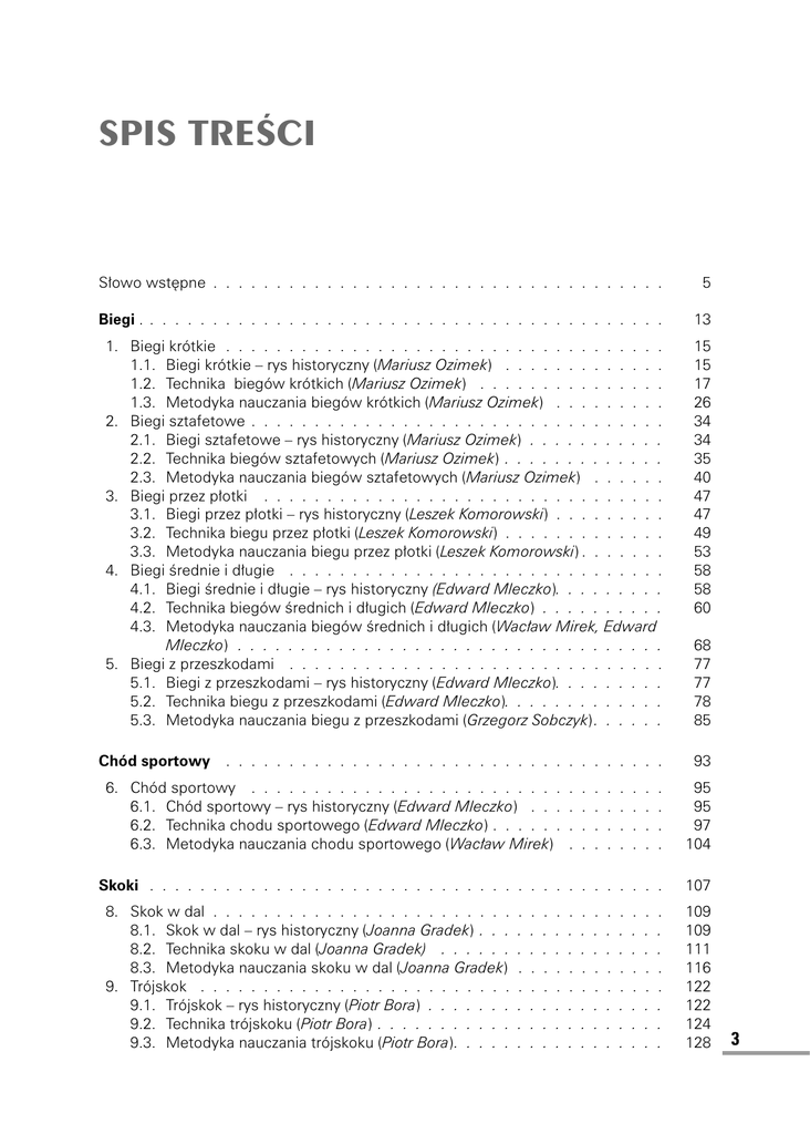 SPIS TREŚCI Słowo wstępne . . . . . . . . . . . . . . . . . . . . . . . . . . . . . . . . . . . . 5 Biegi . . . . . . . . . . . . . . . . . . . . . . . . . . . . . . . . . . . . . . . . . . 13 1. Biegi krótkie . . . . . . . . . . . . . . . . . . . . . . . . . . . . . . 1.1. Biegi krótkie – rys historyczny (Mariusz Ozimek) . . . . . . . . 1.2. Technika biegów krótkich (Mariusz Ozimek) . . . . . . . . . . 1.3. Metodyka nauczania biegów krótkich (Mariusz Ozimek) . . . . 2. Biegi sztafetowe . . . . . . . . . . . . . . . . . . . . . . . . . . . . 2.1. Biegi sztafetowe – rys historyczny (Mariusz Ozimek) . . . . . . 2.2. Technika biegów sztafetowych (Mariusz Ozimek) . . . . . . . . 2.3. Metodyka nauczania biegów sztafetowych (Mariusz Ozimek) . 3. Biegi przez płotki . . . . . . . . . . . . . . . . . . . . . . . . . . . 3.1. Biegi przez płotki – rys historyczny (Leszek Komorowski) . . . . 3.2. Technika biegu przez płotki (Leszek Komorowski) . . . . . . . . 3.3. Metodyka nauczania biegu przez płotki (Leszek Komorowski) . . 4. Biegi średnie i długie . . . . . . . . . . . . . . . . . . . . . . . . . 4.1. Biegi średnie i długie – rys historyczny (Edward Mleczko). . . . 4.2. Technika biegów średnich i długich (Edward Mleczko) . . . . . 4.3. Metodyka nauczania biegów średnich i długich (Wacław Mirek, Mleczko) . . . . . . . . . . . . . . . . . . . . . . . . . . . . . 5. Biegi z przeszkodami . . . . . . . . . . . . . . . . . . . . . . . . . 5.1. Biegi z przeszkodami – rys historyczny (Edward Mleczko). . . . 5.2. Technika biegu z przeszkodami (Edward Mleczko). . . . . . . . 5.3. Metodyka nauczania biegu z przeszkodami (Grzegorz Sobczyk) . Chód sportowy . . . . . . . . . . . . . . . . . . . . . . . . . . . . . . . . . . . . . . . . . . . . . . . . . . . . . . . . . . . . . . . . . . . . . . . . . . . Edward . . . . . . . . . . . . . . . . . . . . . . . . . 15 15 17 26 34 34 35 40 47 47 49 53 58 58 60 . . . . . . . . . . . . . . . . . . . . . . . . . . . . . . . . . . . 93 6. Chód sportowy . . . . . . . . . . . . . . . . . . . . . . . . . 6.1. Chód sportowy – rys historyczny (Edward Mleczko) . . . 6.2. Technika chodu sportowego (Edward Mleczko) . . . . . . 6.3. Metodyka nauczania chodu sportowego (Wacław Mirek) . . . . 95 95 97 104 Skoki . . . . . . . . . . . . . . . . . . . . . . . . . . . . . . . . . . . . . . . . . 107 8. Skok w dal . . . . . . . . . . . . . . . . . . . . . . . . 8.1. Skok w dal – rys historyczny (Joanna Gradek) . . . 8.2. Technika skoku w dal (Joanna Gradek) . . . . . . 8.3. Metodyka nauczania skoku w dal (Joanna Gradek) 9. Trójskok . . . . . . . . . . . . . . . . . . . . . . . . . 9.1. Trójskok – rys historyczny (Piotr Bora) . . . . . . . 9.2. Technika trójskoku (Piotr Bora) . . . . . . . . . . . 9.3. Metodyka nauczania trójskoku (Piotr Bora) . . . . . . . . . . . . . . . . . . . . . . . . . . . . . . . . . . . . . . . . . . . . . . . . . . . . . . . . . . . . . . . . . . . . . . . . . . . . . . . . . . . . . . . . . . . . . . . . . . . . . . . . . . . . . . . . . 68 77 77 78 85 . . . . . . . . . . . . . . . . 109 109 111 116 122 122 124 128 3 SPIS TREŚCI 10. Skok wzwyż . . . . . . . . . . . . . . . . . . . . . . . . . . 10.1. Skok wzwyż – rys historyczny (Piotr Bora) . . . . . . . 10.2. Technika skoku wzwyż (Piotr Bora) . . . . . . . . . . . 10.3. Metodyka nauczania skoku wzwyż (Piotr Bora) . . . . . 11. Skok o tyczce . . . . . . . . . . . . . . . . . . . . . . . . . 11.1. Skok o tyczce – rys historyczny (Andrzej Mleczko) . . . 11.2. Technika skoku o tyczce (Andrzej Mleczko) . . . . . . 11.3. Metodyka nauczania skoku o tyczce (Andrzej Mleczko) 4 . . . . . . . . . . . . . . . . 132 132 135 142 146 146 149 153 Rzuty . . . . . . . . . . . . . . . . . . . . . . . . . . . . . . . . . . . . . . . . . 161 12. Pchnięcie kulą . . . . . . . . . . . . . . . . . . . . . . . . . 12.1. Pchnięcie kulą – rys historyczny (Renata Tokarz) . . . . 12.2. Technika pchnięcia kulą (Renata Tokarz) . . . . . . . . 12.3. Metodyka nauczania pchnięcia kulą (Renata Tokarz) . . 13. Rzut młotem . . . . . . . . . . . . . . . . . . . . . . . . . . 13.1. Rzut młotem – rys historyczny (Renata Nieroda) . . . . 13.2. Technika rzutu młotem (Renata Nieroda) . . . . . . . . 13.3. Metodyka nauczania rzutu młotem (Renata Nieroda) . 14. Rzut dyskiem . . . . . . . . . . . . . . . . . . . . . . . . . 14.1. Rzut dyskiem – rys historyczny (Maria Mleczko) . . . . 14.2. Technika rzutu dyskiem (Maria Mleczko) . . . . . . . . 14.3. Metodyka nauczania rzutu dyskiem (Maria Mleczko) . 15. Rzut oszczepem . . . . . . . . . . . . . . . . . . . . . . . . 15.1. Rzut oszczepem – rys historyczny (Ewa Orłowska) . . 15.2. Technika rzutu oszczepem (Ewa Orłowska) . . . . . . 15.3. Metodyka nauczania rzutu oszczepem (Ewa Orłowska) . . . . . . . . . . . . . . . . 163 163 165 168 177 177 178 182 187 187 188 192 196 196 198 203 Piśmiennictwo . . . . . . . . . . . . . . . . . . . . . . . . . . . . . . . . . . . . Aneks . . . . . . . . . . . . . . . . . . . . . . . . . . . . . . . . . . . . . . . . . Rekordowe wyniki w 2006 r . i quo vadis lekkoatletyko? (Edward Mleczko) . . . . Zestawienie rekordów świata, Europy i Polski mężczyzn i kobiet (Edward Mleczko, Renata Nieroda) . . . . . . . . . . . . . . . . . . . . . . . . . . . . . . . . . Prognoza wyników w konkurencjach lekkoatletycznych (Leszek Nowak) . . . . . . 215 221 223 . . . . . . . . . . . . . . . . . . . . . . . . . . . . . . . . . . . . . . . . . . . . . . . . . . . . . . . . . . . . . . . . . . . . . . . . . . . . . . . . . . . . . . . . . . . . . . . . . . . . . . . . . . . . . . . . . . . . . . . . . . . . . . . . . . . . . . . . . . . . . . . . . . . . . . . . . . . . . . . . . . . . . . . . . . . . . . . . . . . . . . . . 225 229