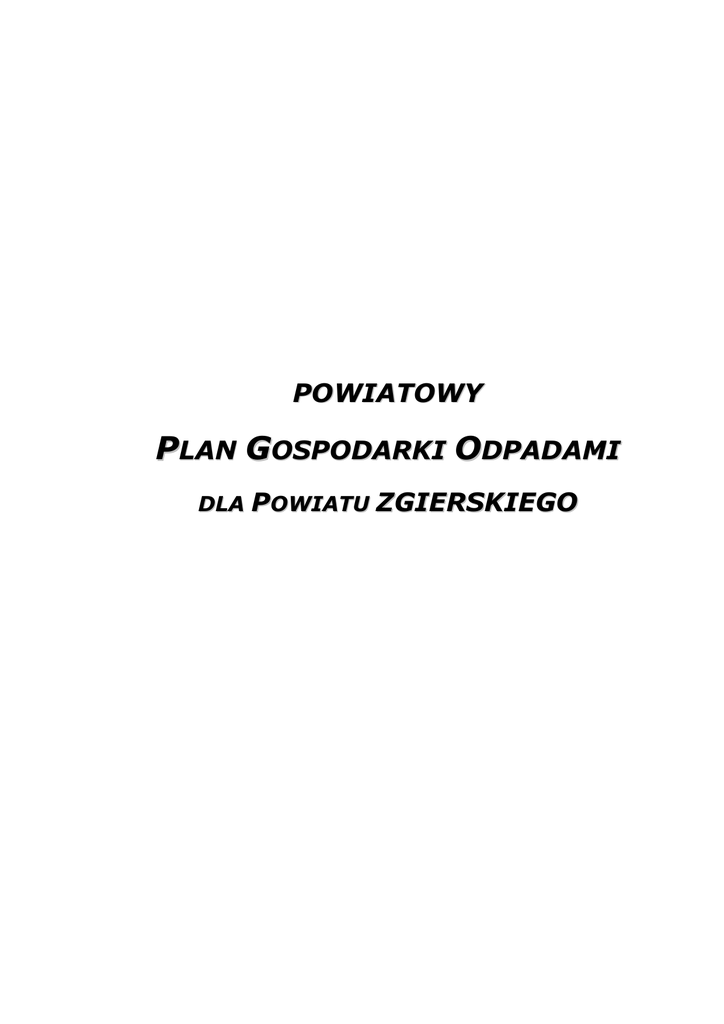 POWIATOWY PLAN GOSPODARKI ODPADAMI DLA POWIATU ZGIERSKIEGO Spis treści 1. Wstęp ....................................................................................Błąd! Nie zdefiniowano zakładki. 1.1 Informacje ogólne o powiecie.....................................Błąd! Nie zdefiniowano zakładki. 1.2 Sytuacja demograficzna powiatu zgierskiego...........Błąd! Nie zdefiniowano zakładki. 1.3 Charakterystyka gospodarcza ...................................Błąd! Nie zdefiniowano zakładki. 1.4 MoŜliwości lokalizacji instalacji gospodarki odpadami ......... Błąd! Nie zdefiniowano zakładki. 2. Analiza aktualnego stanu gospodarki odpadami..............Błąd! Nie zdefiniowano zakładki. 2.1 Odpady powstające w sektorze komunalnym ..........Błąd! Nie zdefiniowano zakładki. 2.1.1 Odpady komunalne ...................................... Błąd! Nie zdefiniowano zakładki. 2.1.1.1 Odpady komunalne ulegające biodegradacji ..........Błąd! Nie zdefiniowano zakładki. 2.1.1.2 Odpady opakowaniowe.............................. Błąd! Nie zdefiniowano zakładki. 2.1.1.3 Odpady wielkogabarytowe ........................ Błąd! Nie zdefiniowano zakładki. 2.1.1.4 Odpady budowlane .................................... Błąd! Nie zdefiniowano zakładki. 2.1.1.5 Odpady niebezpieczne wytwarzane w grupie odpadów komunalnych ........................................................................ Błąd! Nie zdefiniowano zakładki. 2.1.2 Selektywna zbiórka odpadów ...................... Błąd! Nie zdefiniowano zakładki. 2.1.3 Komunalne osady ściekowe ......................... Błąd! Nie zdefiniowano zakładki. 2.2 2.2.1 2.2.2 2.2.3 2.2.4 2.2.5 2.2.6 2.2.7 2.3 2.3.1 2.3.2 2.3.3 2.3.4 2.3.5 2.3.6 2.3.7 2.3.8 2.3.9 Odpady powstające w sektorze gospodarczym. .......Błąd! Nie zdefiniowano zakładki. Odpady z sektora rolno-spoŜywczego......... Błąd! Nie zdefiniowano zakładki. Odpady z przemysłu skórzanego, futrzarskiego i tekstylnego ....... Błąd! Nie zdefiniowano zakładki. Odpady z produkcji, przygotowania, obrotu i stosowania produktów przemysłu chemii organicznej ..................... Błąd! Nie zdefiniowano zakładki. Odpady z produkcji, przygotowywania, obrotu i stosowania powłok ochronnych (farb, lakierów, emalii ceramicznych, kitu, szczeliw i farb drukarskich).................................................. Błąd! Nie zdefiniowano zakładki. Odpady z sektora remontowo-budowlanego..............Błąd! Nie zdefiniowano zakładki. Odpady z sektora energetycznego............... Błąd! Nie zdefiniowano zakładki. Odpady z hutnictwa szkła, z produkcji ceramiki budowlanej i produkcji spoiw mineralnych ........................................ Błąd! Nie zdefiniowano zakładki. Odpady niebezpieczne ................................................Błąd! Nie zdefiniowano zakładki. Odpady środków ochrony roślin ................. Błąd! Nie zdefiniowano zakładki. Odpady olejowe............................................. Błąd! Nie zdefiniowano zakładki. ZuŜyte urządzenia elektryczne i elektroniczne ..........Błąd! Nie zdefiniowano zakładki. Odpady zawierające PCB ............................ Błąd! Nie zdefiniowano zakładki. Odpady medyczne i weterynaryjne............. Błąd! Nie zdefiniowano zakładki. Baterie i akumulatory................................... Błąd! Nie zdefiniowano zakładki. Wycofane z eksploatacji pojazdy ................ Błąd! Nie zdefiniowano zakładki. Odpady zawierające azbest.......................... Błąd! Nie zdefiniowano zakładki. Inne odpady niebezpieczne .......................... Błąd! Nie zdefiniowano zakładki. 2.4 Zbieranie i transport odpadów ..................................Błąd! Nie zdefiniowano zakładki. 2.5 Rodzaj, rozmieszczenie oraz moc przerobowa istniejących instalacji i urządzeń do odzysku i unieszkodliwiania odpadów.................................Błąd! Nie zdefiniowano zakładki. 2.5.1 Unieszkodliwianie odpadów komunalnych Błąd! Nie zdefiniowano zakładki. 2.5.1.1.Zakład Utylizacji Odpadów w Zgierzu. ..... Błąd! Nie zdefiniowano zakładki. 2.5.1.2.Składowisko odpadów innych niŜ niebezpieczne i obojętne w Modlnej gmina Ozorków............................................. Błąd! Nie zdefiniowano zakładki. 2.5.1.3 Składowisko odpadów innych niŜ niebezpieczne i obojętnych w Ziewanicach gm. Głowno. ........................... Błąd! Nie zdefiniowano zakładki. 2.5.1.4 Składowisko odpadów innych niŜ niebezpieczne i obojętnych w Parzęczewie. .................................................. Błąd! Nie zdefiniowano zakładki. 2.5.2 Instalacje, których eksploatacja została zakończona, wymagające rekultywacji................................................... Błąd! Nie zdefiniowano zakładki. 2.5.2.1 Składowisko odpadów komunalnych w Zgniłym Błocie ................. Błąd! Nie zdefiniowano zakładki. 2.5.3 Unieszkodliwianie odpadów niebezpiecznych............Błąd! Nie zdefiniowano zakładki. 2.5.4 Utylizacja odpadów przemysłowych ........... Błąd! Nie zdefiniowano zakładki. 2.6 Obowiązki posiadaczy odpadów oraz stan ich realizac .......... Błąd! Nie zdefiniowano zakładki. 2.7 Tzw. „dzikie wysypiska odpadów” ............................Błąd! Nie zdefiniowano zakładki. 2.8 Mogilniki ......................................................................Błąd! Nie zdefiniowano zakładki. 2.9 Inne „odpady problemowe” .......................................Błąd! Nie zdefiniowano zakładki. 2.10 Import i eksport odpadów ..........................................Błąd! Nie zdefiniowano zakładki. 2.10.1 2.10.2 Odpady komunalne ...................................... Błąd! Nie zdefiniowano zakładki. Odpady niebezpieczne .................................. Błąd! Nie zdefiniowano zakładki. 2.11 Koszty i opłaty .............................................................Błąd! Nie zdefiniowano zakładki. 2.12 Stan istniejący w zakres