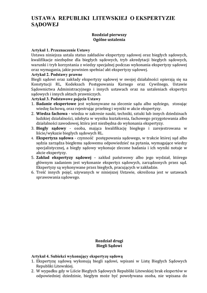 USTAWA REPUBLIKI LITEWSKIEJ O EKSPERTYZIE SĄDOWEJ Rozdział pierwszy Ogólne ustalenia Artykuł 1. Przeznaczenie Ustawy Ustawa niniejsza ustala status zakładów ekspertyzy sądowej oraz biegłych sądowych, kwalifikacje niezbędne dla biegłych sądowych, tryb akredytacji biegłych sądowych, warunki i tryb korzystania z wiedzy specjalnej podczas wykonania ekspertyzy sądowej oraz wymagania, jakie powinien spełniać akt ekspertyzy sądowej. Artykuł 2. Podstawy prawne Biegli sądowi oraz zakłady ekspertyzy sądowej w swojej działalności opierają się na Konstytucji RL, Kodeksach Postępowania Karnego oraz Cywilnego, Ustawie Sądownictwa Administracyjnego i innych ustawach oraz na ustaleniach ekspertyz sądowych i innych aktach prawniczych. Artykuł 3. Podstawowe pojęcia Ustawy 1. Badanie ekspertowe jest wykonywane na zlecenie sądu albo sędziego, stosując wiedzę fachową, oraz rejestrując przebieg i wyniki w akcie ekspertyzy. 2. Wiedza fachowa - wiedza w zakresie nauki, techniki, sztuki lub innych dziedzinach ludzkiej działalności, zdobyta w wyniku kształcenia, fachowego przygotowania albo działalności zawodowej, która jest niezbędna do wykonania ekspertyzy. 3. Biegły sądowy - osoba, mająca kwalifikację biegłego i zarejestrowana w liście/wykazie biegłych sądowych RL. 4. Ekspertyza sądowa - czynność postępowania sądowego, w trakcie której sąd albo sędzia zarządza biegłemu sądowemu odpowiedzieć na pytania, wymagające wiedzy specjalistycznej, a biegły sądowy wykonuje zlecone badania i ich wyniki notuje w akcie ekspertyzy. 5. Zakład ekspertyzy sądowej – zakład państwowy albo jego wydział, którego głównym zadaniem jest wykonanie ekspertyz sądowych, zarządzonych przez sąd. Ekspertyzy są wykonywane przez biegłych, pracujących w zakładzie. 6. Treść innych pojęć, używanych w niniejszej Ustawie, określona jest w ustawach sprawowania sądowego. Rozdział drugi Biegli Sądowi Artykuł 4. Subiekci wykonujący ekspertyzę sądową 1. Ekspertyzę sądową wykonują biegli sądowi, wpisani w Listę Biegłych Sądowych Republiki Litewskiej. 2. W wypadku gdy w Liście Biegłych Sądowych Republiki Litewskiej brak ekspertów w odpowiedniej dziedzinie, biegłym może być powoływana osoba, nie wpisana do 2 Listy Biegłych Sądowych Republiki Litewskiej. 3. W razie potrzeby biegłym może być powoływana osoba, uprawniona jako rzeczoznawca w państwie Unii Europejskiej albo w państwie, z którym Republika Litewska ma zawartą umowę o pomocy prawniczej. Artykul 5. Wymagania osobom, zabiegającym o status biegłego sądowego. 1. Osoba, zabiegająca o status biegłego sądowego, powinna: 1) mieć wykształcenie wyższe, odpowiadające wybranej dziedzinie ekspertowej; 2) zaliczyć egzamin na kwalifikację biegłego sądowego według programu, zatwierdzonego przez kierownika zakładu ekspertyzy sądowej; 3) zdać egzamin w zakresie wiedzy prawnej według programu dla osób, zabiegających o status biegłego sądowego, zatwierdzonego przez Ministra Sprawiedliwości; 4) nie mieć wyroku za ciężką albo poważną zbrodnię oraz za przestępstwo wobec sprawiedliwości, służby państwowej albo interesów publicznych. 2.Wymagania punktu 2 części pierwszej nie są stosowane osobom, którym kwalifikacja rzeczoznawcy była już przyznana w trybie określonym w ustawach albo innych normatywnych aktach prawniczych przez instytucje państwowe albo przez komisje specjalnie utworzone przy tych instytucjach. Osoby te wpisane są w Listę Biegłych Sądowych Republiki Litewskiej zgodnie z artykułami 8-10 niniejszej Ustawy. Artykuł 6. Nadanie kwalifikacji biegłego sądowego oraz orzeczenia komisji kwalifikacyjnej 1. Kwalifikację biegłego sądowego nadaje komisja, powołana przez kierownika zakładu ekspertyzy sądowej. Komisja ta ma się składać nie mniej jak z pięciu członków, z nich nie mniej jak dwa powinni być rzeczoznawcami odpowiedniej dziedziny oraz jeden prawnikiem. Jeżeli zaś w zakładzie ekspertyzy sądowej nie ma fachowego prawnika, wtedy on powinien być zaproszony z uczelni wyższych albo z instytucji państwowych, mających fachowców w tej dziedzinie. 2. Do udziału w pracy komisji kwalifikacyjnych powinno się zapraszać naukowców z zakładów naukowych, uczelni wyższych oraz biegłych z innych zakładów ekspertyzy. 3. Komisja kwalifikacyjna, utworzona w zakładzie ekspertyzy sądowej, może przyznać kwalifikację biegłego sądowego, która pozwala przeprowadzać tylko takiego rodzaju ekspertyzy, jakie są wykonywane w tym zakładzie. Zakład ekspertyzy sądowej ma prawo aprobować ekspertyzy nowego rodzaju i nadać kwalifikację biegłego sądowego ich inicjatorom, stwarzając komisję kwalifikacyjną ze znawców odpowiedniej gałęzi naukowej oraz z ekspertów pokrewnych dziedzin. 4. Osoba, nie pracująca w zakładzie ekspertyzy sądowej, ale zabiegająca o status biegłego sądowego, powinna się zwrócić do kierownika zakładu ekspertyzy sądowej z prośbą o przyznanie kwalifikacji biegłego sądowego, uprawniającej do wykonania ekspertyzy pewnego rodzaju. Osoba taka powinna odpowiadać wymaganiom niniejszej Ustawy, stawianej dla osób, zabiegających o status biegłego sądowego. 5. Po złożeniu egzaminu komisja kwalifikacyjna wydaje świadectwo o kwalifikacji biegłego sądowego. Świadectwo takie potwierdza przygotowanie osoby do wykonania ekspertyz sądowych wskazanego rodzaju. 6. Świadectwo, wydane przez komisję kwalifikacyjną zakładu ekspertyzy sądowej, jest ważne w ciągu pięciu lat od dnia wydania. Po wygaśnięciu ważności świadectwa biegły sądowy ma zwrócić się o przedłużenie terminu do kierownika zakładu ekspertyzy sądowej, w którym świadectwo było wydane. Decyzja o przedłużeniu terminu ważności jest podejmowana przez komisję kwalifikacyjną zakładu ekspertyzy sądowej, w którym świadectwo było wydane. 7. Kierownik zakładu ekspertyzy sądowej ma prawo utworzyć komisję kw
