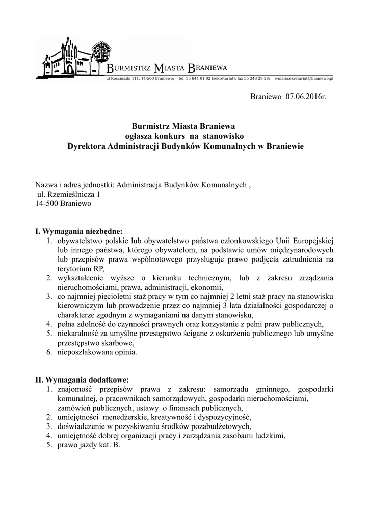 Braniewo 07.06.2016r. Burmistrz Miasta Braniewa ogłasza konkurs na stanowisko Dyrektora Administracji Budynków Komunalnych w Braniewie Nazwa i adres jednostki: Administracja Budynków Komunalnych , ul. Rzemieślnicza 1 14-500 Braniewo I. Wymagania niezbędne: 1. obywatelstwo polskie lub obywatelstwo państwa członkowskiego Unii Europejskiej lub innego państwa, którego obywatelom, na podstawie umów międzynarodowych lub przepisów prawa wspólnotowego przysługuje prawo podjęcia zatrudnienia na terytorium RP, 2. wykształcenie wyższe o kierunku technicznym, lub z zakresu zrządzania nieruchomościami, prawa, administracji, ekonomii, 3. co najmniej pięcioletni staż pracy w tym co najmniej 2 letni staż pracy na stanowisku kierowniczym lub prowadzenie przez co najmniej 3 lata działalności gospodarczej o charakterze zgodnym z wymaganiami na danym stanowisku, 4. pełna zdolność do czynności prawnych oraz korzystanie z pełni praw publicznych, 5. niekaralność za umyślne przestępstwo ścigane z oskarżenia publicznego lub umyślne przestępstwo skarbowe, 6. nieposzlakowana opinia. II. Wymagania dodatkowe: 1. znajomość przepisów prawa z zakresu: samorządu gminnego, gospodarki komunalnej, o pracownikach samorządowych, gospodarki nieruchomościami, zamówień publicznych, ustawy o finansach publicznych, 2. umiejętności menedżerskie, kreatywność i dyspozycyjność, 3. doświadczenie w pozyskiwaniu środków pozabudżetowych, 4. umiejętność dobrej organizacji pracy i zarządzania zasobami ludzkimi, 5. prawo jazdy kat. B. III. Zakres zadań wykonywanych na stanowisku: 1. kierowanie bieżącą działalnością Administracji Budynków Komunalnych w Braniewie, działanie w jej imieniu i reprezentowanie jej na zewnątrz, 2. realizacja zadań zawartych w statucie, 3. wykonywanie obowiązku pracodawcy w stosunku do zatrudnionych pracowników, 4. przygotowywanie wewnętrznych dokumentów związanych z funkcjonowaniem Administracji Budynków Komunalnych w Braniewie, 5. zapewnienie właściwej organizacji pracy, 6. utrzymywanie w należytym stanie powierzonych zasobów majątkowych zgodnie z obowiązującymi przepisami prawa, 7. prowadzenie prawidłowej oraz zgodnej z przepisami prawa gospodarki finansowej IV. Informacja o warunkach pracy na stanowisku: 1. praca administracyjno -biurowa, 2. praca wykonywana również w terenie, 3. praca wykonywana przy monitorze ekranowym powyżej 4 godzin dziennie, 4. z pracą związane są wyjazdy służbowe, 5. czas pracy : pełen etat, 6. przewidywany termin rozpoczęcia pracy : 1 lipiec 2016r. V. Wymagane dokumenty: 1. życiorys /CV/, 2. list motywacyjny, 3. kserokopie dokumentów potwierdzających wykształcenie, 4. kserokopie świadectw pracy i innych dokumentów potwierdzających posiadany staż pracy, 5. kserokopie innych dokumentów potwierdzających kwalifikacje, 6. oświadczenie kandydata o korzystaniu z pełni praw publicznych oraz o pełnej zdolności do czynności prawnych, 7. oświadczenie o niekaralności za umyślne przestępstwo ścigane z oskarżenia publicznego lub umyślne przestępstwo skarbowe, 8. oświadczenie kandydata o wyrażeniu zgody na przetwarzanie danych osobowych zawartych w ofercie pracy do celów rekrutacji zgodnie z ustawą z dnia 27.08.1997r. o ochronie danych osobowych / t.j. Dz.U. z 2014r. poz. 1182 z późn.zm./. 9. oświadczenie, że kandydat nie ma zakazu pełnienia funkcji kierowniczych związanych z dysponowaniem środkami publicznymi o których mowa w ustawie z dnia 17 grudnia 2004r. o odpowiedzialności za naruszenie dyscypliny finansów publicznych /t.j. z 2013r. poz 168/ VI. Informacja o wskaźniku zatrudnienia osób niepełnosprawnych Wskaźnik zatrudnienia osób niepełnosprawnych w Administracji Budynków Komunalnych w Braniewie w miesiącu poprzedzającym datę upublicznienia ogłoszenia w rozumieniu przepisów o rehabilitacji zawodowej i społecznej oraz zatrudnianiu osób niepełnosprawnych kształtuje się na poziomie poniżej 6 %. Dokumenty należy składać w zamkniętych kopertach z dopiskiem: „Konkurs na stanowisko Dyrektora Administracji Budynków Komunalnych w Braniewie” w terminie do dnia 17 czerwca 2016r. do godz. 15.00 w Sekretariacie Urzędu Miasta Braniewa I piętro, pok. Nr 16 lub pocztą na adres: Urząd Miasta Braniewa ul. Kościuszki 111 14-500 Braniewo Decyduje data wpływu do Urzędu Miasta Braniewa do godz. 15.00, a nie data stempla pocztowego. Aplikacje, które wpłyną po wyżej określonym terminie nie będą rozpatrywane, a te, które nie będą spełniały wymagań formalnych zawartych w ogłoszeniu zostaną odrzucone. Osoby spełniające wymagania formalne określone w ogłoszeniu zostaną powiadomieni telefonicznie lub drogą mailową o terminie kolejnego etapu naboru - rozmowie kwalifikacyjnej. Informacja o wyniku naboru będzie ogłoszona na tablicy informacyjnej w Urzędzie Miasta Braniewa oraz w Biuletynie Informacji Publicznej Urzędu Miasta Braniewa.