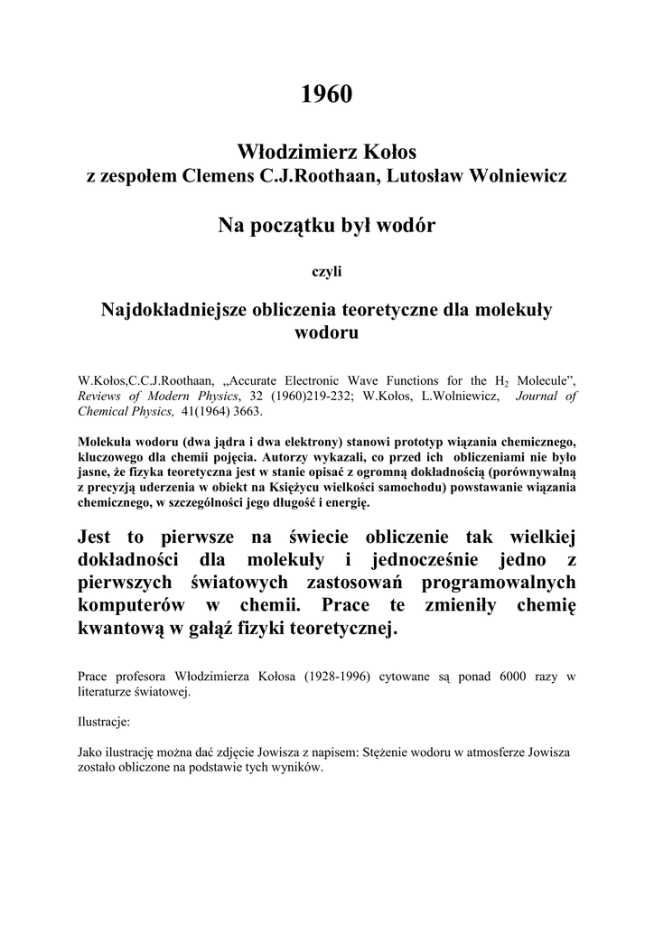 1960 Włodzimierz Kołos z zespołem Clemens C.J.Roothaan, Lutosław Wolniewicz Na początku był wodór czyli Najdokładniejsze obliczenia teoretyczne dla molekuły wodoru W.Kołos,C.C.J.Roothaan, „Accurate Electronic Wave Functions for the H2 Molecule”, Reviews of Modern Physics, 32 (1960)219-232; W.Kołos, L.Wolniewicz, Journal of Chemical Physics, 41(1964) 3663. Molekuła wodoru (dwa jądra i dwa elektrony) stanowi prototyp wiązania chemicznego, kluczowego dla chemii pojęcia. Autorzy wykazali, co przed ich obliczeniami nie było jasne, Ŝe fizyka teoretyczna jest w stanie opisać z ogromną dokładnością (porównywalną z precyzją uderzenia w obiekt na KsięŜycu wielkości samochodu) powstawanie wiązania chemicznego, w szczególności jego długość i energię. Jest to pierwsze na świecie obliczenie tak wielkiej dokładności dla molekuły i jednocześnie jedno z pierwszych światowych zastosowań programowalnych komputerów w chemii. Prace te zmieniły chemię kwantową w gałąź fizyki teoretycznej. Prace profesora Włodzimierza Kołosa (1928-1996) cytowane są ponad 6000 razy w literaturze światowej. Ilustracje: Jako ilustrację moŜna dać zdjęcie Jowisza z napisem: StęŜenie wodoru w atmosferze Jowisza zostało obliczone na podstawie tych wyników.