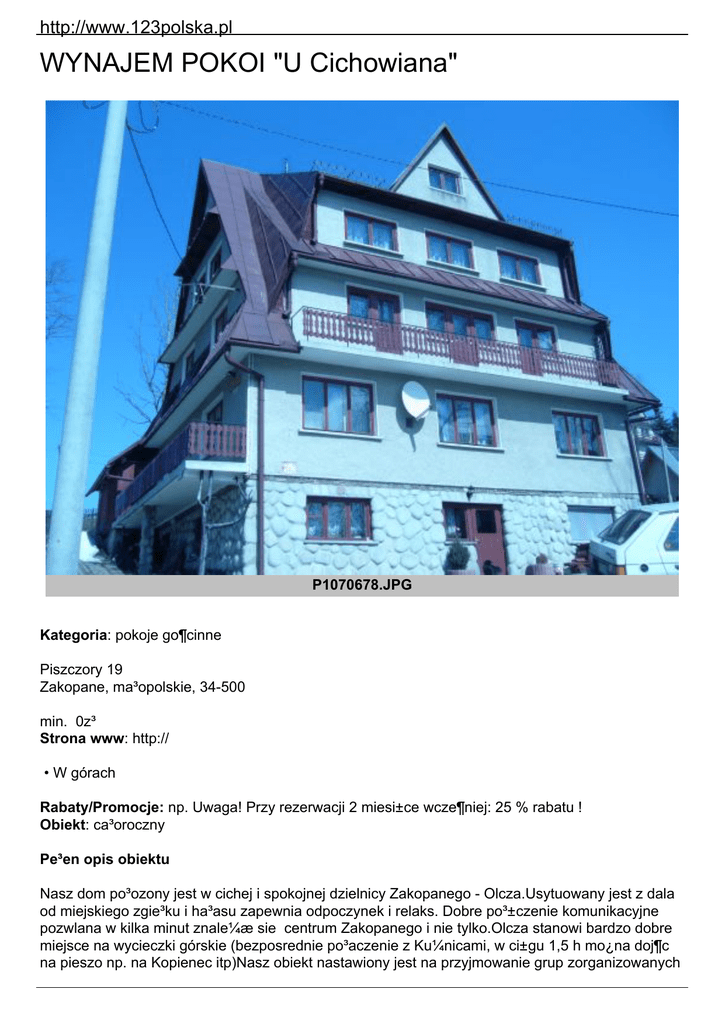 http://www.123polska.pl WYNAJEM POKOI "U Cichowiana" P1070678.JPG Kategoria: pokoje go¶cinne Piszczory 19 Zakopane, ma³opolskie, 34-500 min. 0z³ Strona www: http:// • W górach Rabaty/Promocje: np. Uwaga! Przy rezerwacji 2 miesi±ce wcze¶niej: 25 % rabatu ! Obiekt: ca³oroczny Pe³en opis obiektu Nasz dom po³ozony jest w cichej i spokojnej dzielnicy Zakopanego - Olcza.Usytuowany jest z dala od miejskiego zgie³ku i ha³asu zapewnia odpoczynek i relaks. Dobre po³±czenie komunikacyjne pozwlana w kilka minut znale¼æ sie centrum Zakopanego i nie tylko.Olcza stanowi bardzo dobre miejsce na wycieczki górskie (bezposrednie po³aczenie z Ku¼nicami, w ci±gu 1,5 h mo¿na doj¶c na pieszo np. na Kopienec itp)Nasz obiekt nastawiony jest na przyjmowanie grup zorganizowanych http://www.123polska.pl jak i go¶ci indywidualnych. Oferowane pokoje: Cennik: inne np. od 25.12 do 2.01 - +20% od 23.06 do 31.08 - -5% dla studentów Mo¿liwo¶æ wykupienia obiadów w cenie 12z³/os...; ceny do negocjacji; cena za ca³y domek 200z³/db; cena za ³ó¿ko dostawiane 30z³; sylwester +20%, ..., Za basen symboliczna op³ata... Opis otoczenia np. O¶rodek le¿y w przepiêknie po³o¿onej dolinie....., tu¿ nad potokiem..... Z tarasu widaæ szczyty gór..., które szczególnie piêknie prezentuj± siê w blasku zachodz±cego s³oñca. Bezpo¶rednie s±siedztwo jeziora sprawia, ¿e powietrze latem jest..... Atrakcje turystyczne: np. 2 km do Jaskini Jana, ruiny zamku XIII w., gor±ce ¬ród³a Czarne, itd. Dojazd: np. szczegó³y na stronie internetowej np. Jad±c tras± z ... do ..., ok. 30 km od ....., skrêæ w lewo w stronê wsi ... . Po przejechaniu 1,5km w±sk± szos± skrêæ ponownie w lewo na brukowana drogê, która nale¿y przejechaæ kolejne 1,5km do skraju lasu, n W pobli¿u: do sklepu: 0.1 km