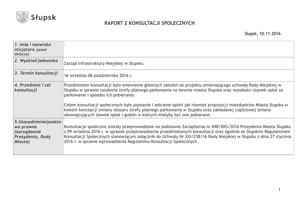 RAPORT Z KONSULTACJI SPOŁECZNYCH Słupsk, 10.11.2016 1. Imię i nazwisko inicjatora (jeżeli - dotyczy) 2. Wydział/jednostka 3. Termin konsultacji 4. Przedmiot i cel konsultacji Zarząd Infrastruktury Miejskiej w Słupsku. 16 września–06 października 2016 r. Przedmiotem konsultacji było omówienie głównych założeń do projektu zmieniającego uchwałę Rady Miejskiej w Słupsku w sprawie ustalenia strefy płatnego parkowania na terenie miasta Słupska oraz wysokości stawek opłat za parkowanie i sposobu ich pobierania. Celem konsultacji społecznych było poznanie i zebranie opinii jak również propozycji mieszkańców Miasta Słupska w kwestii koncepcji zmiany obszaru strefy płatnego parkowania w Słupsku oraz zakładanej częściowej zmiany obowiązujących stawek opłat i godzin w których miałyby być one pobierane. 5.Uzasadnienie/podsta wa prawna (zarządzenie Prezydenta, Rady Miasta) Konsultacje społeczne zostały przeprowadzone na podstawie Zarządzenia nr 698/DKS/2016 Prezydenta Miasta Słupska z 09 września 2016 r. w sprawie przeprowadzenia przedmiotowych konsultacji oraz zgodnie ze Słupskim Regulaminem Konsultacji Społecznych stanowiącym załącznik do Uchwały Nr XXI/238/16 Rady Miejskiej w Słupsku z dnia 27 stycznia 2016 r. w sprawie wprowadzenia Regulaminu Konsultacji Społecznych. 1 RAPORT Z KONSULTACJI SPOŁECZNYCH 6. Metoda przeprowadzenia konsultacji (opis) Konsultacje odbyły się w trzech formach: - protokołowanego publicznego spotkania z mieszkańcami Miasta Słupska, które odbyło się dnia 26 września 2016 r. o godzinie 1630 w siedzibie Słupskiego Centrum Organizacji Pozarządowych i Ekonomii Społecznej zlokalizowanej przy ul. Niedziałkowskiego 6, - udostępnienia założeń do projektu zmieniającego przedmiotową uchwałę w Biuletynie Informacji Publicznej Miasta Słupska, na stronach www.slupsk.pl i www.zimslupsk.com oraz na fanpage’u Miasta Słupska na portalu Facebook, - zgłaszania uwag do omawianego zakresu zmian przedmiotowej uchwały w formie elektronicznej bądź papierowej poprzez wysłanie formularza uwag na adres [email protected] lub złożenie go w siedzibie Zarządu Infrastruktury Miejskiej w Słupsku mieszczącej się przy ul. Przemysłowej 73. 7. Akcja informacyjna (opis) Informacja dotycząca konsultacji została ogłoszona na Biuletynie Informacji Publicznej Miasta Słupska, na stronach www.slupsk.pl i www.zimslupsk.com, na fanpage’u Miasta Słupska na portalu Facebook oraz w lokalnych mediach. 8. Harmonogram spotkania/spotkań (scenariusz konsultacji) Otwarte spotkanie z mieszkańcami Miasta Słupska odbyło się zgodnie z założeniem dnia 26 września 2016 r. o godzinie 1630 w siedzibie Słupskiego Centrum Organizacji Pozarządowych i Ekonomii Społecznej zlokalizowanego przy ul. Niedziałkowskiego 6. 2 RAPORT Z KONSULTACJI SPOŁECZNYCH 9. Liczba osób biorących udział w konsultacjach/liczba uwag a) mieszkańcy - 9 b) przedstawiciele ZIM - 3 c) przedstawiciele Urzędu Miejskiego - 1 razem: 13 osób Uwagi zgłoszone w formie ustnej na spotkaniu: a) mieszkańcy - 8 Uwagi zgłoszone w formie pisemnej: a) mieszkańcy – 3 b) instytucje i organizacje – 2 10.UWAGI ZGŁASZANE PRZEZ UCZESTNIKÓW 1. Zgłaszający uwagę 2. Część dokumentu, do którego zgłaszane są uwagi 1. Mieszkaniec Słupska Uwaga poza zakresem. 3.Treść uwagi/opinii Propozycja obniżenia stawki abonamentu przedsiębiorcy pracującego typu „P” oraz ograniczenia rejonu jego obowiązywania. 4. Propozycja zmian wraz z uzasadnieniem 5. Odpowiedź na uwagę Ustalenie stawki abonamentu na poziomie 45,0 zł i ograniczenie jego ważności do obszaru o promieniu około 300,0 metrów wokół miejsca prowadzenia działalności gospodarczej lub miejsca zatrudnienia nabywcy abonamentu. Uwaga nieuwzględniona. Przedstawiona problematyka nie dotyczy założeń podanych jako temat niniejszych konsultacji. 3 RAPORT Z KONSULTACJI SPOŁECZNYCH 2. Mieszkaniec Słupska Uwaga dotycząca wszystkich punktów (1, 2 i 3) stanowiących zakres konsultacji. Propozycja rozszerzenia SPP o proponowane ulice oraz dodatkowo o ulice: Tuwima, Deotymy, Plac Dąbrowskiego, Wandy oraz Kilińskiego. Brak poparcia dla zmiany stawek i czasu płatnego parkowania. Ograniczenie postoju na wymienionych ulicach i wymuszenie rotacji pojazdów w celu zapewnienia dostępności miejsc postojowych. Poparcie dla dotychczas wprowadzonych stawek opłat oraz godzin obowiązywania strefy sprawdzających się w słupskich realiach. Uwaga uwzględniona. Kwestia objęcia strefą części z zaproponowanych dodatkowo ulic zostanie przedstawiona w projekcie uchwały w sprawie SPP. 3. Ośrodek Szkolenia Kierowców PLUS Uwaga dotycząca punktu 1. Propozycja rozszerzenia SPP o ulicę Kilińskiego. Ograniczenie postoju dla pojazdów osób unikających parkowania i opłat w SPP mające na celu zwolnienie miejsc postojowych oraz uniknięcie konfliktów z mieszkańcami pobliskich budynków. Uwaga uwzględniona. Kwestia objęcia strefą wskazanej ulicy zostanie przedstawiona w projekcie uchwały w sprawie SPP. 4.Mieszkaniec Słupska Uwaga dotycząca punktu 1. Propozycja rozszerzenia SPP o ulicę Kilińskiego. Ograniczenie postoju przy wskazanej ulicy oraz umożliwienie osobom pracującym w pobliżu swobodne zaparkowanie pojazdu. Uwaga uwzględniona. Kwestia objęcia strefą wskazanej ulicy zostanie przedstawiona w projekcie uchwały w sprawie SPP. 4 RAPORT Z KONSULTACJI SPOŁECZNYCH 5. Stowarzyszenie Nasz Słupsk Uwaga poza zakresem. Propozycja likwidacji opłat dla mieszkańców Słupska. Znikomy wpływ środków budżetowych ze strefy, kłopot dla mieszkańców i zamieranie centrum miasta. Uwaga nieuwzględniona. Przedstawiona problematyka nie dotyczy założeń podanych jako temat niniejszych konsultacji. 6. Mieszkaniec Słupska Uwaga poza zakresem. Uwaga w stosunku do deklaracji składanych przez Prezydenta Miasta Słupska. Pytanie dotyczące czynników mających wpływ na decyzję o konieczności wprowa