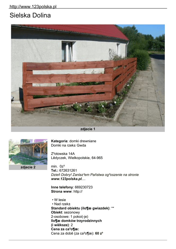 http://www.123polska.pl Sielska Dolina zdjecie 1 Kategoria: domki drewniane Domki na rzek± Gwda Z³otowska 14A Lêdyczek, Wielkopolskie, 64-965 zdjecie 2 min. 0z³ Tel.: 672631261 Dzieñ Dobry! Zanlaz³em Pañstwa og³oszenie na stronie www.123polska.pl.... Inne telefony: 669230723 Strona www: http:// • W lesie • Nad rzek± Standard obiektu (ilo¶æ gwiazdek): ** Obiekt: sezonowy 2-osobowe: 1 pokoi(-je) Ilo¶æ domków trzyrodzinnych (i wiêksze): 2 Cena za ca³o¶æ: Cena za dobê (za ca³o¶æ): 60 z³ http://www.123polska.pl Ca³kowieta ilo¶c miejsc noclegowych: ok. 8 Cena za osobê (w SEZONIE): Wy¿ywienie: • Mo¿liwo¶æ zorganizowania obiadów (w innym obiekcie) • Aneks kuchenny w pokojach/domkach Na terenie obiektu: • dostêp do internetu • grill • miejsce na ognisko • mo¿liwo¶æ przechowania rowerów • parking Pozosta³e: • akceptujemy zwierzêta W KA¯DYM pokoju apartamencie domku: • toaleta • tylko umywalka • aneks kuchenny • czajnik elektryczny • garnki • podstawowe naczynia • sztuæce Opis otoczenia Domki holenderskie u zbiegu rzek Gwda i Debrynka, w¶ród lasów obfituj±cych w grzyby i zwierzêta. £±cz±ce siê tu cztery czyste rzeki obfituj± w ryby. Szlaki rowerowe przy wzd³u¿ rzek i jezior. W pobli¿u: do sklepu: 0.1 km do supermarketu / marketu: 6 km szlaki turystyczne: 0.2 km restauracje / kawiarnie / bary: 0.3 km dyskoteka / dancing / klub nocny: 6 km s³u¿by medyczne: 6 km poczta: 0.1 km bank / bankomat: 6 km budka telefoniczna: 0.1 km dworzec / przystanek PKS: 0.1 km