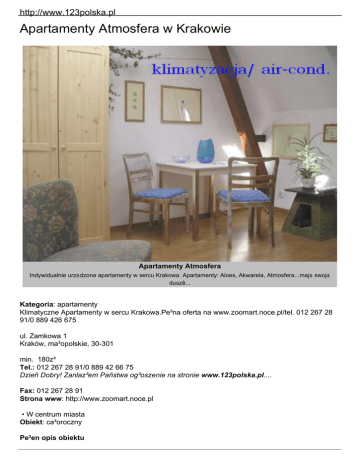 http://www.123polska.pl Apartamenty Atmosfera w Krakowie Apartamenty Atmosfera Indywidualnie urz±dzone apartamenty w sercu Krakowa. Apartamenty: Aloes, Akwarela, Atmosfera...maj± swoj± duszê... Kategoria: apartamenty Klimatyczne Apartamenty w sercu Krakowa.Pe³na oferta na www.zoomart.noce.pl/tel. 012 267 28 91/0 889 426 675 ul. Zamkowa 1 Kraków, ma³opolskie, 30-301 min. 180z³ Tel.: 012 267 28 91/0 889 42 66 75 Dzieñ Dobry! Zanlaz³em Pañstwa og³oszenie na stronie www.123polska.pl.... Fax: 012 267 28 91 Strona www: http://www.zoomart.noce.pl • W centrum miasta Obiekt: ca³oroczny Pe³en opis obiektu http://www.123polska.pl Apartamenty Atmosfera zbli¿aj± do atmosfery magicznego Krakowa… Idealne miejsce odpoczynku dla pary przyjació³, rodziny, biznesmena szukaj±cego wytchnienia i skupienia do pracy. Je¶li szukasz kameralnego i eleganckiego miejscu, w centrum Krakowa, zapraszamy do apartamentów z artystyczna dusz±...Kalendarz dostêpno¶ci apartamentów wraz z cennikiem mog± Pañstwo znale¼æ na stronie: www.zoomart.noce.plZapraszamy! Oferowane pokoje: 2-osobowe: 2 pokoi(-je) 3-osobowe: 3 pokoi(-je) Ilo¶æ Apartamentów: 5 Cena za ca³o¶æ: Cena za dobê (za ca³o¶æ): 180-250 z³ Ca³kowieta ilo¶c miejsc noclegowych: ok. 13 Cena za osobê (w SEZONIE): Pozosta³e: • wystawiamy faktury VAT • obiekt klimatyzowany • zakaz zabierania zwierz±t • mówimy po angielsku • mówimy po hiszpañsku Inne: francusku W KA¯DYM pokoju apartamencie domku: • toaleta • ³azienka • prysznic • klimatyzacja • aneks kuchenny • lodówka • czajnik elektryczny • garnki • podstawowe naczynia • sztuæce • telewizor Inne: suszarka do w³osów, ¿elazko, deska do prasowania, rêczniki, myd³o Opis otoczenia Apartamenty Atmosfera znajduj± siê na poddaszu kamienicy po³o¿onej w centrum Krakowa, przy zakolu Wis³y. Kamienica po³o¿ona jest na bulwarze Wis³y, w bezpo¶rednim s±siedztwie Zamku Królewskiego na Wawelu. Dojazd: Szegó³owa mapa dojazdu do apartamentów na naszej stronie:www.zoomart.noce.pl