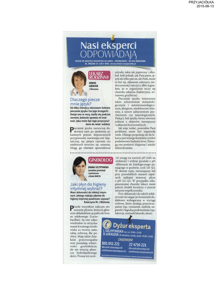 PRZYJACIÓ£KA 2015-08-13 Nasi eksperci ODPOWIADAJĄ PISZCIE DO NASZYCH EKSPERTÓW NA ADRES: „PRZYJACIÓŁKA^", 00-048 WARSZAWA, UL. WIEISKA 19, LUB E-MAIL: [email protected] z Warszawy Dlaczego piecze mnie język? Od kilku miesięcy odczuwam bolesne pieczenie języka (na jego brzegach). Ustaje ono w nocy, nasila się podczas rozmów, jedzenie sprawia mi trud ność. |aka może być tego przyczyna? dane do wiad. redakcji P ieczenie języka zazwyczaj do skwiera nam po zjedzeniu pi kantnych potraw doprawionych przyprawami zawierającymi kapsaicynę, np. pieprz cayenne czy niektórych owoców, np. ananasa. Mogą go również spowodować JOANNA SZCZYPTAŃSKA specjalista ginekologii X i położnictwa z Kliniki INVICTA Jaki płyn do higieny intymnej wybrać? Mam skłonności do infekcji intym nych. jakiego rodzaju płynów do higieny intymnej powinnam używać? Katarzyna W. z Wielunia P używki, takie jak papierosy i alko hol. Jeśli jednak, jak Pani pisze, ję zyk nie tylko piecze, ale i boli, może to być np. objawem cukrzycy, nie doczynności tarczycy albo sygna łem, że w organizmie toczy się choroba zakaźna (bakteryjna, wi rusowa, grzybicza). Pieczenie języka towarzyszy także schorzeniom stomatolo gicznym i autoimmunologicznym, alergiom, niedoborom wita min, a nawet zaburzeniom psy chicznym czy neurologicznym. Piekący ból języka bywa również jednym z objawów menopauzy i zaburzeń hormonalnych. Jak więc widać, powodów Pani problemu może być naprawdę wiele. Dlatego proponuję iść do le karza pierwszego kontaktu i zrobić podstawowe badania krwi. Pomo gą one postawić diagnozę i ustalić dalsze leczenie. cić uwagę na wartość pH (info na etykiecie) i wybrać produkt z pH zbliżonym do fizjologicznego pa nującego w pochwie, czyli 3,8-4,5. W okresie ciąży, meonopauzy lub przy przewlekłych stanach zapal nych najlepiej stosować płyny o pH 3,5-4,5. W przypadku zdiagnozowanej choroby lekarz może polecić środek leczniczy o jeszcze niższym współczynniku. Przy skłonności do takich infek cji wato teżsięgać po kosmetyki do datkowo wzbogacana w wyciągi ziołowe, które działają przeciwza palnie (np.: rumianek, szałwia, na gietek) i łagodzą podrażnienia (np.: lukrecja, mniszek lekarski, aloes). rzede wszystkim zalecam sto sowanie płynów, których głów nym składnikiem są pałeczki kwa su mlekowego (Lactobacillus). Są one odpo wiedzialne za utrzymamanie kwaśnego środo wiska co tworzy natu SKA XX'M ,90°-2100 ralną ochroną dla po D ŁUKAVn6 •ŁUriMVUK 26 sierpnia,środa, godz. 19.00-21.00 chwy. Mają także dzia W Dyżur eksperta łanie przeciwzapalne oraz posiadają właści wości grzybobójcze, ale nie niszczą płasz cza hydrolipidowego skóry. Proszę też zwró ZADZWOŃ! 801051221 224710221 dla osob dzwoniących dla osób dzwoniących z telefonów komorkowych z telefonów stacjonarnych Kosflpojąoenia równa sięcenie jednego impulsupołączenia lokalnego.