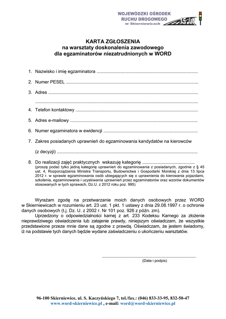 KARTA ZGŁOSZENIA na warsztaty doskonalenia zawodowego dla egzaminatorów niezatrudnionych w WORD 1. Nazwisko i imię egzaminatora ………………………………………………………………………………………. 2. Numer PESEL ………………………………………………………………………………………………………………….. 3. Adres …………………………………………………………………………………………………………………………………. …………………………………………………………………………………………………………………………………………….. 4. Telefon kontaktowy …………………………………………………………………………………………………………. 5. Adres e-mailowy ……………………………………………………………………………………………………………… 6. Numer egzaminatora w ewidencji ………………………………………………………………………………… 7. Zakres posiadanych uprawnień do egzaminowania kandydatów na kierowców (z decyzji) …………………………………………………………………………………………………………………………. 8. Do realizacji zajęć praktycznych wskazuję kategorię ……………………………………………. (proszę podać tylko jedną kategorię uprawnień do egzaminowania z posiadanych, zgodnie z § 45 ust. 4, Rozporządzenia Ministra Transportu, Budownictwa i Gospodarki Morskiej z dnia 13 lipca 2012 r. w sprawie egzaminowania osób ubiegających się o uprawnienia do kierowania pojazdami, szkolenia, egzaminowania i uzyskiwania uprawnień przez egzaminatorów oraz wzorów dokumentów stosowanych w tych sprawach, Dz.U. z 2012 roku poz. 995) Wyrażam zgodę na przetwarzanie moich danych osobowych przez WORD w Skierniewicach w rozumieniu art. 23 ust. 1 pkt. 1 ustawy z dnia 29.08.1997 r. o ochronie danych osobowych (t.j. Dz. U. z 2002 r. Nr 101 poz. 926 z późn. zm). Uprzedzony o odpowiedzialności karnej z art. 233 Kodeksu Karnego za złożenie nieprawdziwego oświadczenia lub zatajenie prawdy, niniejszym oświadczam, że wszystkie przedstawione przeze mnie dane są zgodne z prawdą. Oświadczam, że jestem świadomy, iż na podstawie tych danych będzie wydane zaświadczeniu o ukończeniu warsztatów. ………………………………………………………………………………… (Data i podpis) 96-100 Skierniewice, ul. S. Kaczyńskiego 7, tel./fax.: (046) 833-33-95, 832-50-47 www.word-skierniewice.pl , e-mail: [email protected]