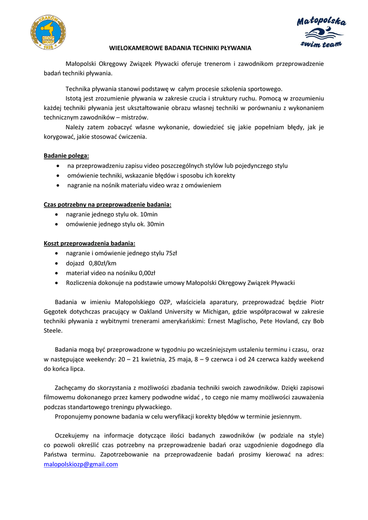 WIELOKAMEROWE BADANIA TECHNIKI PŁYWANIA Małopolski Okręgowy Związek Pływacki oferuje trenerom i zawodnikom przeprowadzenie badao techniki pływania. Technika pływania stanowi podstawę w całym procesie szkolenia sportowego. Istotą jest zrozumienie pływania w zakresie czucia i struktury ruchu. Pomocą w zrozumieniu każdej techniki pływania jest ukształtowanie obrazu własnej techniki w porównaniu z wykonaniem technicznym zawodników – mistrzów. Należy zatem zobaczyd własne wykonanie, dowiedzied się jakie popełniam błędy, jak je korygowad, jakie stosowad dwiczenia. Badanie polega: na przeprowadzeniu zapisu video poszczególnych stylów lub pojedynczego stylu omówienie techniki, wskazanie błędów i sposobu ich korekty nagranie na nośnik materiału video wraz z omówieniem Czas potrzebny na przeprowadzenie badania: nagranie jednego stylu ok. 10min omówienie jednego stylu ok. 30min Koszt przeprowadzenia badania: nagranie i omówienie jednego stylu 75zł dojazd 0,80zł/km materiał video na nośniku 0,00zł Rozliczenia dokonuje na podstawie umowy Małopolski Okręgowy Związek Pływacki Badania w imieniu Małopolskiego OZP, właściciela aparatury, przeprowadzad będzie Piotr Gęgotek dotychczas pracujący w Oakland University w Michigan, gdzie współpracował w zakresie techniki pływania z wybitnymi trenerami amerykaoskimi: Ernest Maglischo, Pete Hovland, czy Bob Steele. Badania mogą byd przeprowadzone w tygodniu po wcześniejszym ustaleniu terminu i czasu, oraz w następujące weekendy: 20 – 21 kwietnia, 25 maja, 8 – 9 czerwca i od 24 czerwca każdy weekend do kooca lipca. Zachęcamy do skorzystania z możliwości zbadania techniki swoich zawodników. Dzięki zapisowi filmowemu dokonanego przez kamery podwodne widad , to czego nie mamy możliwości zauważenia podczas standartowego treningu pływackiego. Proponujemy ponowne badania w celu weryfikacji korekty błędów w terminie jesiennym. Oczekujemy na informacje dotyczące ilości badanych zawodników (w podziale na style) co pozwoli określid czas potrzebny na przeprowadzenie badao oraz uzgodnienie dogodnego dla Paostwa terminu. Zapotrzebowanie na przeprowadzenie badao prosimy kierowad na adres: [email protected]