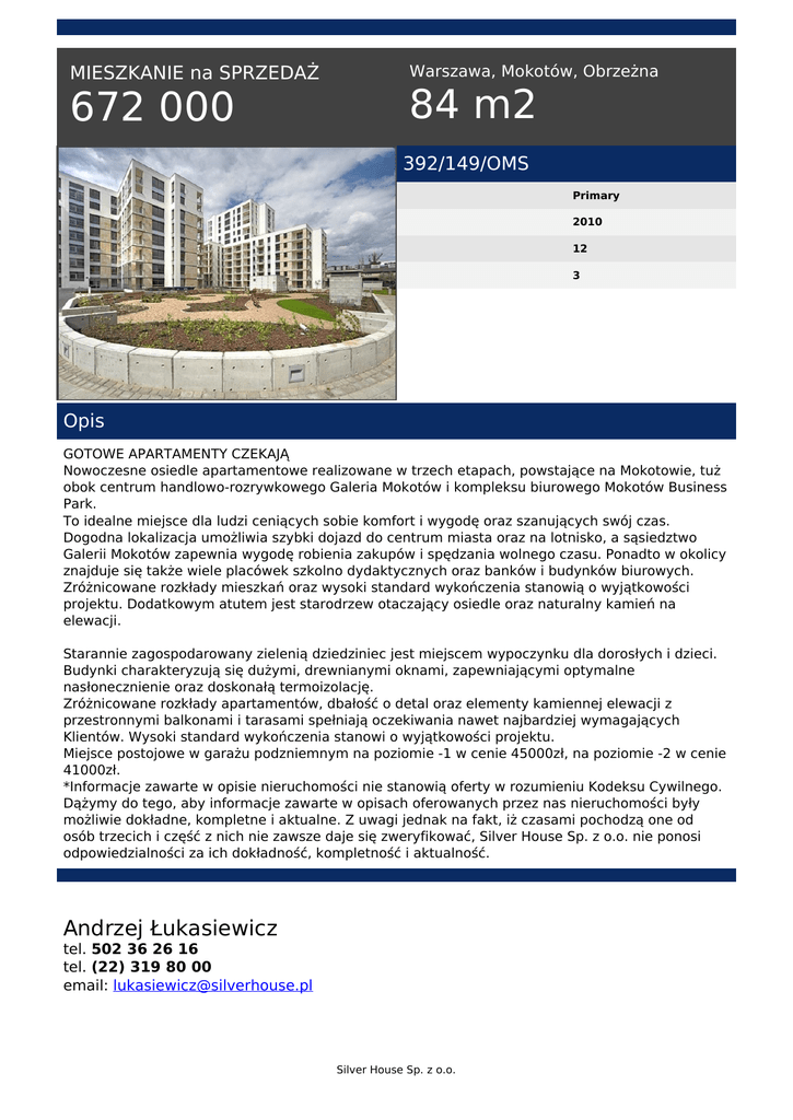 MIESZKANIE na SPRZEDAŻ 672 000 Warszawa, Mokotów, Obrzeżna 84 m2 392/149/OMS Primary 2010 12 3 Opis GOTOWE APARTAMENTY CZEKAJĄ Nowoczesne osiedle apartamentowe realizowane w trzech etapach, powstające na Mokotowie, tuż obok centrum handlowo-rozrywkowego Galeria Mokotów i kompleksu biurowego Mokotów Business Park. To idealne miejsce dla ludzi ceniących sobie komfort i wygodę oraz szanujących swój czas. Dogodna lokalizacja umożliwia szybki dojazd do centrum miasta oraz na lotnisko, a sąsiedztwo Galerii Mokotów zapewnia wygodę robienia zakupów i spędzania wolnego czasu. Ponadto w okolicy znajduje się także wiele placówek szkolno dydaktycznych oraz banków i budynków biurowych. Zróżnicowane rozkłady mieszkań oraz wysoki standard wykończenia stanowią o wyjątkowości projektu. Dodatkowym atutem jest starodrzew otaczający osiedle oraz naturalny kamień na elewacji. Starannie zagospodarowany zielenią dziedziniec jest miejscem wypoczynku dla dorosłych i dzieci. Budynki charakteryzują się dużymi, drewnianymi oknami, zapewniającymi optymalne nasłonecznienie oraz doskonałą termoizolację. Zróżnicowane rozkłady apartamentów, dbałość o detal oraz elementy kamiennej elewacji z przestronnymi balkonami i tarasami spełniają oczekiwania nawet najbardziej wymagających Klientów. Wysoki standard wykończenia stanowi o wyjątkowości projektu. Miejsce postojowe w garażu podzniemnym na poziomie -1 w cenie 45000zł, na poziomie -2 w cenie 41000zł. *Informacje zawarte w opisie nieruchomości nie stanowią oferty w rozumieniu Kodeksu Cywilnego. Dążymy do tego, aby informacje zawarte w opisach oferowanych przez nas nieruchomości były możliwie dokładne, kompletne i aktualne. Z uwagi jednak na fakt, iż czasami pochodzą one od osób trzecich i część z nich nie zawsze daje się zweryfikować, Silver House Sp. z o.o. nie ponosi odpowiedzialności za ich dokładność, kompletność i aktualność. Andrzej Łukasiewicz tel. 502 36 26 16 tel. (22) 319 80 00 email: [email protected] Silver House Sp. z o.o. Silver House Sp. z o.o. Powered by TCPDF (www.tcpdf.org)
