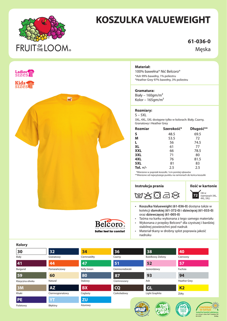 KOSZULKA VALUEWEIGHT 61-036-0 Męska Ladies Mens Materiał: 100% bawełna* Nić Belcoro® Ladies *Ash 99% bawełny, 1% poliestru *Heather Grey 97% bawełny, 3% poliestru Kids Mens Gramatura: Biały – 160gm/m² Kolor – 165gm/m² Kids Rozmiary: S – 5XL 3XL, 4XL, 5XL dostępne tylko w kolorach: Biały, Czarny, Granatowy i Heather Grey Rozmiar S M L XL XXL 3XL 4XL 5XL Tol. +/- Szerokość* 48.5 53.5 56 61 66 71 76 81 2.5 Długość** 69.5 72 74.5 77 78.5 80 81.5 83 2.5 *Mierzone w poprzek koszulki, 1cm poniżej rękawów **Mierzone od najwyższego punktu na ramionach do końca koszulki Instrukcja prania Ilość w kartonie 72 (36 w rozmiarach 3XL, 4XL, 5XL) • Koszulka Valueweight (61-036-0) dostęna także w kolekcji damskiej (61-372-0) i dziecięcej (61-033-0) oraz dziewczęcej (61-005-0) • Taśma na karku wykonana z tego samego materiału • Wykonana z przędzy Belcoro® dla czystszej i bardziej stabilnej powierzchni pod nadruk • Materiał tkany w drobny splot poprawia jakość nadruku Kolory 30 Biały 41 Burgund 59 Klasyczna oliwka 3M Khaki PE Fioletowy 32 Granatowy 44 Pomarańczowy 34 Ciemnożółty 47 Kelly Green 60 80 Natural Stalowy AZ Ciemnogranatowy YT Błękitny BX Ceglasty ZU Azurowy 36 Czarny 51 Ciemnoniebieski 87 Ciemnoszary CQ Czekoladowy 38 Butelkowy Zielony 52 Jasnoróżowy 93 Ash GL Light Graphite 40 Czerwony 57 Fuchsia 94 Heather Grey K2 Żółty