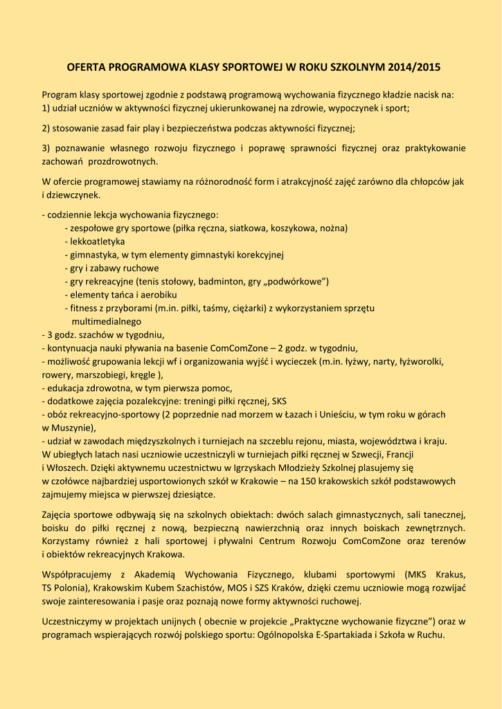 OFERTA PROGRAMOWA KLASY SPORTOWEJ W ROKU SZKOLNYM 2014/2015 Program klasy sportowej zgodnie z podstawą programową wychowania fizycznego kładzie nacisk na: 1) udział uczniów w aktywności fizycznej ukierunkowanej na zdrowie, wypoczynek i sport; 2) stosowanie zasad fair play i bezpieczeństwa podczas aktywności fizycznej; 3) poznawanie własnego rozwoju fizycznego i poprawę sprawności fizycznej oraz praktykowanie zachowań prozdrowotnych. W ofercie programowej stawiamy na różnorodność form i atrakcyjność zajęć zarówno dla chłopców jak i dziewczynek. - codziennie lekcja wychowania fizycznego: - zespołowe gry sportowe (piłka ręczna, siatkowa, koszykowa, nożna) - lekkoatletyka - gimnastyka, w tym elementy gimnastyki korekcyjnej - gry i zabawy ruchowe - gry rekreacyjne (tenis stołowy, badminton, gry „podwórkowe”) - elementy tańca i aerobiku - fitness z przyborami (m.in. piłki, taśmy, ciężarki) z wykorzystaniem sprzętu multimedialnego - 3 godz. szachów w tygodniu, - kontynuacja nauki pływania na basenie ComComZone – 2 godz. w tygodniu, - możliwość grupowania lekcji wf i organizowania wyjść i wycieczek (m.in. łyżwy, narty, łyżworolki, rowery, marszobiegi, kręgle ), - edukacja zdrowotna, w tym pierwsza pomoc, - dodatkowe zajęcia pozalekcyjne: treningi piłki ręcznej, SKS - obóz rekreacyjno-sportowy (2 poprzednie nad morzem w Łazach i Unieściu, w tym roku w górach w Muszynie), - udział w zawodach międzyszkolnych i turniejach na szczeblu rejonu, miasta, województwa i kraju. W ubiegłych latach nasi uczniowie uczestniczyli w turniejach piłki ręcznej w Szwecji, Francji i Włoszech. Dzięki aktywnemu uczestnictwu w Igrzyskach Młodzieży Szkolnej plasujemy się w czołówce najbardziej usportowionych szkół w Krakowie – na 150 krakowskich szkół podstawowych zajmujemy miejsca w pierwszej dziesiątce. Zajęcia sportowe odbywają się na szkolnych obiektach: dwóch salach gimnastycznych, sali tanecznej, boisku do piłki ręcznej z nową, bezpieczną nawierzchnią oraz innych boiskach zewnętrznych. Korzystamy również z hali sportowej i pływalni Centrum Rozwoju ComComZone oraz terenów i obiektów rekreacyjnych Krakowa. Współpracujemy z Akademią Wychowania Fizycznego, klubami sportowymi (MKS Krakus, TS Polonia), Krakowskim Kubem Szachistów, MOS i SZS Kraków, dzięki czemu uczniowie mogą rozwijać swoje zainteresowania i pasje oraz poznają nowe formy aktywności ruchowej. Uczestniczymy w projektach unijnych ( obecnie w projekcie „Praktyczne wychowanie fizyczne”) oraz w programach wspierających rozwój polskiego sportu: Ogólnopolska E-Spartakiada i Szkoła w Ruchu.