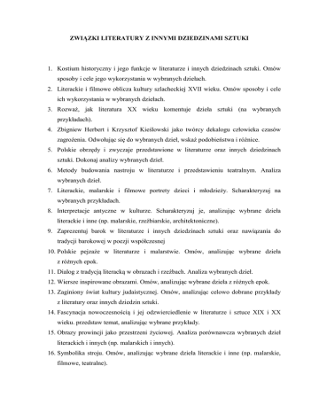 ZWIĄZKI LITERATURY Z INNYMI DZIEDZINAMI SZTUKI 1. Kostium historyczny i jego funkcje w literaturze i innych dziedzinach sztuki. Omów sposoby i cele jego wykorzystania w wybranych dziełach. 2. Literackie i filmowe oblicza kultury szlacheckiej XVII wieku. Omów sposoby i cele ich wykorzystania w wybranych dziełach. 3. Rozważ, jak literatura XX wieku komentuje dzieła sztuki (na wybranych przykładach). 4. Zbigniew Herbert i Krzysztof Kieślowski jako twórcy dekalogu człowieka czasów zagrożenia. Odwołując się do wybranych dzieł, wskaż podobieństwa i różnice. 5. Polskie obrzędy i zwyczaje przedstawione w literaturze oraz innych dziedzinach sztuki. Dokonaj analizy wybranych dzieł. 6. Metody budowania nastroju w literaturze i przedstawieniu teatralnym. Analiza wybranych dzieł. 7. Literackie, malarskie i filmowe portrety dzieci i młodzieży. Scharakteryzuj na wybranych przykładach. 8. Interpretacje antyczne w kulturze. Scharakteryzuj je, analizując wybrane dzieła literackie i inne (np. malarskie, rzeźbiarskie, architektoniczne). 9. Zaprezentuj barok w literaturze i innych dziedzinach sztuki oraz nawiązania do tradycji barokowej w poezji współczesnej 10. Polskie pejzaże w literaturze i malarstwie. Omów, analizując wybrane dzieła z różnych epok. 11. Dialog z tradycją literacką w obrazach i rzeźbach. Analiza wybranych dzieł. 12. Wiersze inspirowane obrazami. Omów, analizując wybrane dzieła z różnych epok. 13. Zaginiony świat kultury judaistycznej. Omów, analizując celowo dobrane przykłady z literatury oraz innych dziedzin sztuki. 14. Fascynacja nowoczesnością i jej odzwierciedlenie w literaturze i sztuce XIX i XX wieku. przedstaw temat, analizując wybrane przykłady. 15. Obrazy prowincji jako przestrzeni życiowej. Analiza porównawcza wybranych dzieł literackich i innych (np. malarskich i innych). 16. Symbolika stroju. Omów, analizując wybrane dzieła literackie i inne (np. malarskie, filmowe, teatralne). 17. Malarstwo, rzeźba i architektura jako inspiracje dla literatury. Omów temat, analizując celowo dobrane przykłady. 18. Obraz szkoły w literaturze i filmie. Omów zagadnienie, przywołując celowo dobrane przykłady. 19. Metody budowania nastroju w literaturze i innych dziedzinach sztuki. Dokonaj analizy wybranych dzieł. 20. Obraz brzydoty w literaturze oraz malarstwie dwóch wybranych epok. Dokonaj analizy celowo dobranych przykładów. 21. Artystyczne interpretacje historii w literaturze i malarstwie. Dokonaj analizy wybranych przykładów realizacji tego motywu. 22. Różnorodność wzorców patriotyzmu w wybranych epokach. Omów, analizując dzieła literackie i filmowe. 23. Portrety, kultura i życie codzienne Romów w literaturze i innych dziedzinach sztuki. Omów, analizując celowo dobrane dzieła. 24. Hagiografia pędzlem i piórem malowana Omów ideał świętego w literaturze i malarstwie różnych epok, uwzględniając specyfikę form artystycznego wyrazu. 25. Opole jako motyw literatury i sztuki. Rozwiń temat, analizując wybrane dzieła. 26. Propaganda w życiu człowieka. Omów zagadnienie na wybranych przykładach sztuki plakatu i literatury okresu socrealizmu. 27. Motyw niewinnej ofiary w sztuce różnych epok. Przedstaw różne ujęcia motywu na podstawie analizy dzieł literackich i malarskich. 28. Romantyczne mity w epokach późniejszych. Ukaż różne ich interpretacje na przykładach literackich i z innych dziedzin sztuki. 29. Motyw dworu szlacheckiego w literaturze i innych dziedzinach sztuki. Omów sposoby jego prezentowania oraz funkcje w wybranych dziełach. 30. Opolszczyzna jako ,,mała ojczyzna”. Zaprezentuj sposoby widzenia najbliższego środowiska w literaturze i innych dziedzinach sztuki twórców związanych z regionem. 31. Dawne i współczesne wzorce rodziny literaturze i filmie. Omów zagadnienie, analizując celowo dobrane przykłady. 32. Pozatekstowe środki wyrazu w teatrze. Przedstaw zagadnienie na przykładzie wybranych inscenizacji w kontekście ich literackich pierwowzorów. 33. Motywy marynistyczne w literaturze i innych dziedzinach sztuki. Omów temat na wybranych przykładach. 34. Synkretyzm sztuk w okresie modernizmu w Polsce i Europie. Omów zjawisko, odwołując się do wybranych przykładów pochodzących z różnych dziedzin. 35. Symbolika tańca w literaturze i malarstwie polskim. Omów zagadnienie, analizując celowo dobrane przykłady i techniki, w jakich zostały zrealizowane. 36. Współczesne interpretacje sceniczne dramatów powstałych przed rokiem 1918. Zanalizuj wybrane spektakle teatru żywego planu i/lub telewizyjnego. 37. Bohema artystyczna i jej obraz w sztuce. Omów zagadnienie, odwołując się do wybranych przykładów pochodzących z różnych dziedzin.