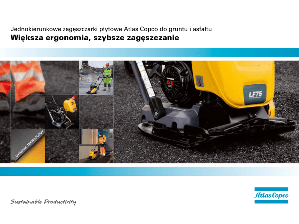 Jednokierunkowe zagęszczarki płytowe Atlas Copco do gruntu i asfaltu Większa ergonomia, szybsze zagęszczanie 2 PRZEWODNIK Oczekuj więcej Skończ pracę szybciej ... Asortyment urządzeń do zagęszczania firmy Atlas Copco przeniesie Państwa wydajność na całkowicie nowy poziom. Wyjątkowa sprawność zagęszczania, dzięki dużej sile odśrodkowej i wysokiej prędkości naszych jednokierunkowych zagęszczarek płytowych, pozwala Państwu wykonać pracę szybciej i pomieścić więcej zadań w codziennym harmonogramie prac. Łatwiej ... Upraszczanie Państwa dnia pracy i zwiększanie Waszej wydajności to nasze najważniejsze priorytety. Dzięki inteligentnym rozwiązaniom technicznym, takim jak prosty, ale skuteczny układ rozprowadzania wody w naszych jednokierunkowych zagęszczarkach płytowych, czas pracy został znacznie wydłużony. Ergonomiczna konstrukcja i ograniczone drgania ułatwiają pracę i jeszcze bardziej zwiększają wydajność. I taniej ... Potrzebujecie Państwo trwałych maszynz dłuższymi okresami pomiędzy przeglądami i niskim kosztem okresu użytkowania. Nasze nowatorskie projekty opierają się na długim doświadczeniu w branży oraz utrzymywaniu bliskich kontaktów z klientami, takimi jak Państwo, co pozwala nam dopasować się do Państwa potrzeb i zwiększać efektywność pracy maszyn. Najniższy koszt własności Całkowity koszt własności to suma wszystkich kosztów generowanych przez urządzenie przez cały okres użytkowania. Zawsze staramy się utrzymywać całkowity koszt własności na jak najniższym poziomie, zapewniając wysoce wydajny sprzęt. Wykres przedstawia średnią dla 1000 godzin. Wartości mogą różnić się w zależności od lokalnych warunków. Operator 89% URZĄDZENIE 5% Części zamienne 2% Energia 4% Sprzęt do piasku i żwiru Sprzęt do IŁU Sprzęt do asfaltu Wszystkie z naszych jednokierunkowych zagęszczarek płytowych pracują doskonale z piaskiem i żwirem. Średnie i ciężkie jednokierunkowe zagęszczarki płytowe zapewniają najlepszą wydajność i zagęszczenie grubszych warstw. Lżejsze zagęszczarki wibracyjne, takie jak LF80, oferują bardzo dobre rezultaty zagęszczania warstw o ograniczonej grubości i łatwą obsługę. LF80 Skuteczność zagęszczania iłu w znacznym stopniu zależy od zawartości wody. W czystym ile, lub gdy ił jest pomieszany z innymi gruboziarnistymi frakcjami, spójność jest niska. Optymalną wydajność zagęszczania iłu zapewnią wszystkie nasze zagęszczarki płytowe. Do pracy z asfaltem oferujemy nasze jednokierunkowe zagęszczarki płytowe o wysokiej niezawodności i z inteligentnym układem rozprowadzania wody. Są łatwe w czyszczeniu, nie pozostawiają śladów na asfalcie i pracują doskonale z każdą wodą dostępną na budowie. LF75 PIASEK 0,06-2 mm ŻWIR 2-60 mm Grubość warstwy m Przejścia Wydajność zagęszczania m3/h Ił 0,06 mm 0,4 Grubość warstwy 4 Przejścia 25 Wydajność zagęszczania m Asfalt 0,002-0,06 mm 0,3 4 m3/h 15-20 Grubość warstwy m Przejścia 4 Wydajność zagęszczania m3/h 120-150 *Średnia z 1000 godzin. Różni się w zależności od lokalnych warunków. 3 Jednokierunkowe zagęszczarki płytowe Wszechstronność i oszczędność czasu Jednokierunkowe zagęszczarki płytowe Atlas Copco pozwolą wykonać każdą pracę – w zasypywaniu wykopów, w pracy z kostką brukową i z powierzchnią asfaltu. Wystarczy założyć zbiornik wody do asfaltu lub zestaw do kostki brukowej, aby być gotowym do każdego rodzaju prac zagęszczających. Osiągnij więcej Inteligentna konstrukcja, ograniczająca wymaganą liczbę czynności konserwacyjnych, pozwala spędzać więcej czasu na rzeczywistym zagęszczaniu zamiast na czyszczeniu płyty dennej lub innych pracach konserwacyjnych. Nasze jednokierunkowe zagęszczarki płytowe oznaczają zwiększoną wydajność. Nowe modele są nawet o 35% szybsze* od poprzednich, a ich wysoka wydajność zagęszczania oraz długi okres sprawności pomagają w szybkim wykonaniu pracy. Liczą się rezultaty Stosując nasze jednokierunkowe zagęszczarki płytowe możecie być Państwo pewni uzyskania najlepszych rezultatów. Płyta zagęszczająca ma zaokrąglone krawędzie, co pozwala uniknąć pozostawiania śladów na powierzchni. Nasz układ rozprowadzania wody zapewnia równomierną dystrybucję wody na całej powierzchni płyty dennej, co zapobiega przywarciu *Nowa LF80 jest o 35% szybsza w porównaniu z poprzednim modelem LF82 4 maszyny do gorącej powierzchni asfaltu. Brak rurek i wężyków sprawia, że układ jest wysoce niezawodny. Zużycie wody jest optymalne dzięki zaworowi regulującemu przepływ łatwo dostępnemu dla operatora. Duży zdejmowany zbiornik z powiększonym bezpiecznym korkiem sprawia, że wodę uzupełnia się szybciej, łatwiej i rzadziej. Oszczędzaj czas i energię Nasze jednokierunkowe zagęszczarki płytowe pomagają oszczędzać czas i energię. Niższe wymogi dotyczące konserwacji i serwisowania oznaczają niższe koszty długoterminowe. Połączenie trwałości i szybkości pracy maszyn to kombinacja doskonale wpływająca na wydajność. Prosty i wydajny system rozprowadzania wody Centralnie umieszczony punkt mocowania uchwytu pozwala na jego postawienie do pionu, co ułatwia pracę blisko przeszkód. Wygoda operatora Wszystkie jednokierunkowe zagęszczarki płytowe są wyposażone w opatentowany uchwyt ograniczający drgania, zapewniający bardzo niski poziom drgań ręki/ ramienia w porównaniu z konwencjonalnymi uchwytami. łatwy transport Standardowe ucho do podnoszenia dźwigiem. Umieszczone w sposób zapewniający wyważenie maszyny podczas podnoszenia. większa prędkość Nowe modele LF są znacznie szybsze od swoich poprzedników. LF80 jest o 35% szybsza w porównaniu z poprzednim modelem LF82. większa sprawność 13-litrowy opcjonalny zbiornik wody z łatwo dostępnym zaworem regulacji przepływu i dużym bezpiecznym korkiem gwarantującym szybkie uzupełnianie wody. 