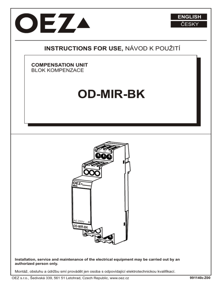 ENGLISH ČESKY INSTRUCTIONS FOR USE, NÁVOD K POUŽITÍ COMPENSATION UNIT BLOK KOMPENZACE OD-MIR-BK A2 A2 A2 AC 230V OD-MIR-BK Installation, service and maintenance of the electrical equipment may be carried out by an authorized person only. Montáž, obsluhu a údržbu smí provádět jen osoba s odpovídající elektrotechnickou kvalifikací. OEZ s.r.o., Šedivská 339, 561 51 Letohrad, Czech Republic, www.oez.cz 991140c Z00 2 OD-MIR-BK A2 A2 A2 A2 A2 AC 230V OD-MIR-BK ON/OFF OFF ON/OFF OFF ON ON OD-MIR-BK A2 A2 A2 Ikomp Z AC 230V = Z Ckomp max. AC 250V 3 mF OD-MIR-BK A1 T N . . . 1 A2 OD-MIR-BK MIR-16 A2 A2 A2 A2 A2 A2 A2 OD-MIR-BK MCR-08 A1 A2 T A2 A2 A2 AC 230V MIR AC 230V 11 OD-MIR-BK 12 N>Nmax 14 OD-MIR-BK MCR ON/OFF OFF 15 16 .. 18 ON N 1 .. .. 1 N N Only materials which have low adverse environmental impact and which do not contain dangerous L substances as specified in ROHS directive have been used in the product. Ve výrobku jsou použity materiály s nízkým negativním dopadem na životní prostředí, které neobsahují zakázané nebezpečné látky dle ROHS. -2- 991140c Z00 ESPAÑOL SLOVENSKY PO POLSKU DEUTSCH OD-MIR-BK Návod k použitiu SLOVENSKY Blok kompenzácie - OD-MIR-BK Montáž, obsluhu a údržbu môže vykonáva 1 2 iba osoba s odpovedajúcou elektrotechnickou kvalifikáciou. Vo výrobku sú použite materiály s nízkym negatívnym dopadom na životné prostredie, ktoré neobsahuje zakázané latky pod a ROHS - OD-MIR-BK , 1 2 . , ROHS. , Instrukcja obs ugi PO POLSKU Modu kompensacji - OD-MIR-BK Monta , obs ug i konserwacj wykonywa 1 2 mo e wy cznie odpowiednio wykwalifikowana osoby z bran y elektrotechnicznej. W wyrobie zastosowane zosta y materia y z niskim negatywnym oddzia ywaniem na rodowisko naturalne, które nie zawieraj zakazanych niebezpiecznych substancji zgodnie z ROHS. Gebrauchsanweisung DEUTSCH -3- 991140c Z00 Kompensationsblock - OD-MIR-BK Die Montage, die Bedienung und Instandhaltung kann nur der Arbeiter mit der 1 2 entsprechenden elektrotechnischen Qualifikation verrichten. Für das Erzeugnis werden Stoffe mit niedrigen negativen Umweltauswirkungen angewandt, die keine verbotenen gefährlichen Stoffe nach ROHS enthalten. Instrucciones de uso ESPAÑOL Bloque de compensación - OD-MIR-BK El montaje, servicio y mantenimiento puede realizar únicamente la persona con la 1 2 cualificación electrotécnica correspondiente. En el producto están usados los materiales que tienen incidencia negativa baja al medio ambiente, que no incluyen las materias peligrosas prohibidas según ROHS. -4- 991140c Z00