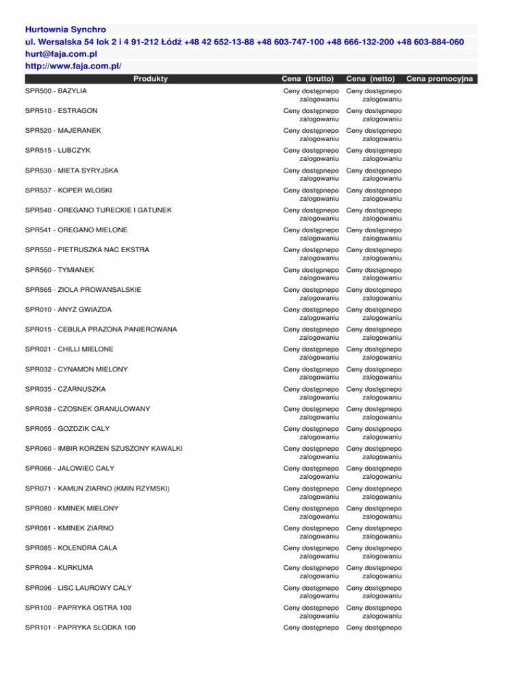Hurtownia Synchro ul. Wersalska 54 lok 2 i 4 91-212 Łódź +48 42 652-13-88 +48 603-747-100 +48 666-132-200 +48 603-884-060 [email protected] http://www.faja.com.pl/ Cena (brutto) Cena (netto) SPR500 - BAZYLIA Produkty Ceny dostępnepo zalogowaniu Ceny dostępnepo zalogowaniu SPR510 - ESTRAGON Ceny dostępnepo zalogowaniu Ceny dostępnepo zalogowaniu SPR520 - MAJERANEK Ceny dostępnepo zalogowaniu Ceny dostępnepo zalogowaniu SPR515 - LUBCZYK Ceny dostępnepo zalogowaniu Ceny dostępnepo zalogowaniu SPR530 - MIETA SYRYJSKA Ceny dostępnepo zalogowaniu Ceny dostępnepo zalogowaniu SPR537 - KOPER WLOSKI Ceny dostępnepo zalogowaniu Ceny dostępnepo zalogowaniu SPR540 - OREGANO TURECKIE I GATUNEK Ceny dostępnepo zalogowaniu Ceny dostępnepo zalogowaniu SPR541 - OREGANO MIELONE Ceny dostępnepo zalogowaniu Ceny dostępnepo zalogowaniu SPR550 - PIETRUSZKA NAC EKSTRA Ceny dostępnepo zalogowaniu Ceny dostępnepo zalogowaniu SPR560 - TYMIANEK Ceny dostępnepo zalogowaniu Ceny dostępnepo zalogowaniu SPR565 - ZIOLA PROWANSALSKIE Ceny dostępnepo zalogowaniu Ceny dostępnepo zalogowaniu SPR010 - ANYZ GWIAZDA Ceny dostępnepo zalogowaniu Ceny dostępnepo zalogowaniu SPR015 - CEBULA PRAZONA PANIEROWANA Ceny dostępnepo zalogowaniu Ceny dostępnepo zalogowaniu SPR021 - CHILLI MIELONE Ceny dostępnepo zalogowaniu Ceny dostępnepo zalogowaniu SPR032 - CYNAMON MIELONY Ceny dostępnepo zalogowaniu Ceny dostępnepo zalogowaniu SPR035 - CZARNUSZKA Ceny dostępnepo zalogowaniu Ceny dostępnepo zalogowaniu SPR038 - CZOSNEK GRANULOWANY Ceny dostępnepo zalogowaniu Ceny dostępnepo zalogowaniu SPR055 - GOZDZIK CALY Ceny dostępnepo zalogowaniu Ceny dostępnepo zalogowaniu SPR060 - IMBIR KORZEN SZUSZONY KAWALKI Ceny dostępnepo zalogowaniu Ceny dostępnepo zalogowaniu SPR066 - JALOWIEC CALY Ceny dostępnepo zalogowaniu Ceny dostępnepo zalogowaniu SPR071 - KAMUN ZIARNO (KMIN RZYMSKI) Ceny dostępnepo zalogowaniu Ceny dostępnepo zalogowaniu SPR080 - KMINEK MIELONY Ceny dostępnepo zalogowaniu Ceny dostępnepo zalogowaniu SPR081 - KMINEK ZIARNO Ceny dostępnepo zalogowaniu Ceny dostępnepo zalogowaniu SPR085 - KOLENDRA CALA Ceny dostępnepo zalogowaniu Ceny dostępnepo zalogowaniu SPR094 - KURKUMA Ceny dostępnepo zalogowaniu Ceny dostępnepo zalogowaniu SPR096 - LISC LAUROWY CALY Ceny dostępnepo zalogowaniu Ceny dostępnepo zalogowaniu SPR100 - PAPRYKA OSTRA 100 Ceny dostępnepo zalogowaniu Ceny dostępnepo zalogowaniu SPR101 - PAPRYKA SLODKA 100 Ceny dostępnepo Ceny dostępnepo Cena promocyjna zalogowaniu zalogowaniu SPR116 - PIEPRZ CZARNY MIELONY I GATUNEK Ceny dostępnepo zalogowaniu Ceny dostępnepo zalogowaniu SPR117 - PIEPRZ CZARNY MLOTKOWANY Ceny dostępnepo zalogowaniu Ceny dostępnepo zalogowaniu SPR125 - PIEPRZ ZIELONY ZIARNO Ceny dostępnepo zalogowaniu Ceny dostępnepo zalogowaniu SPR130 - PIEPRZ CAYENNE Ceny dostępnepo zalogowaniu Ceny dostępnepo zalogowaniu SPR131 - PIEPRZ ZIOLOWY Ceny dostępnepo zalogowaniu Ceny dostępnepo zalogowaniu SPR132 - PIEPRZ KOLOROWY Ceny dostępnepo zalogowaniu Ceny dostępnepo zalogowaniu SPR141 - TRAWA CYTRYNOWA Ceny dostępnepo zalogowaniu Ceny dostępnepo zalogowaniu SPR145 - ZIELE ANGIELSKIE CALE Ceny dostępnepo zalogowaniu Ceny dostępnepo zalogowaniu SPR301 - GARAM MASALA Ceny dostępnepo zalogowaniu Ceny dostępnepo zalogowaniu SPR056 - GOZDZIK MIELONY Ceny dostępnepo zalogowaniu Ceny dostępnepo zalogowaniu SPR065 - JALOWIEC MIELONY Ceny dostępnepo zalogowaniu Ceny dostępnepo zalogowaniu SPR077 - KARDAMON ZIARNO (II GATUNEK) Ceny dostępnepo zalogowaniu Ceny dostępnepo zalogowaniu SPR335 - CZUBRYCA CZERWONA Ceny dostępnepo zalogowaniu Ceny dostępnepo zalogowaniu SPR336 - CZUBRYCA ZIELONA Ceny dostępnepo zalogowaniu Ceny dostępnepo zalogowaniu SPR340 - PRZYPRAWA TZATZIKI Ceny dostępnepo zalogowaniu Ceny dostępnepo zalogowaniu SPR344 - WARZYWA SUSZONE KOSTKA (BEZ SOLI) Ceny dostępnepo zalogowaniu Ceny dostępnepo zalogowaniu SPR303 - PRZYPRAWA 5 SMAKOW Ceny dostępnepo zalogowaniu Ceny dostępnepo zalogowaniu SPR304 - PRZYPRAWA TURECKA (KEBAB) Ceny dostępnepo zalogowaniu Ceny dostępnepo zalogowaniu SPR309 - PRZYPRAWA DO PIZZY Ceny dostępnepo zalogowaniu Ceny dostępnepo zalogowaniu SPR310 - PRZYPRAWA DO SPAGHETTI Ceny dostępnepo zalogowaniu Ceny dostępnepo zalogowaniu SPR315 - PRZYPRAWA DO FLAKOW Ceny dostępnepo zalogowaniu Ceny dostępnepo zalogowaniu SPR134 - PIEPRZ CYTRYNOWY Ceny dostępnepo zalogowaniu Ceny dostępnepo zalogowaniu
