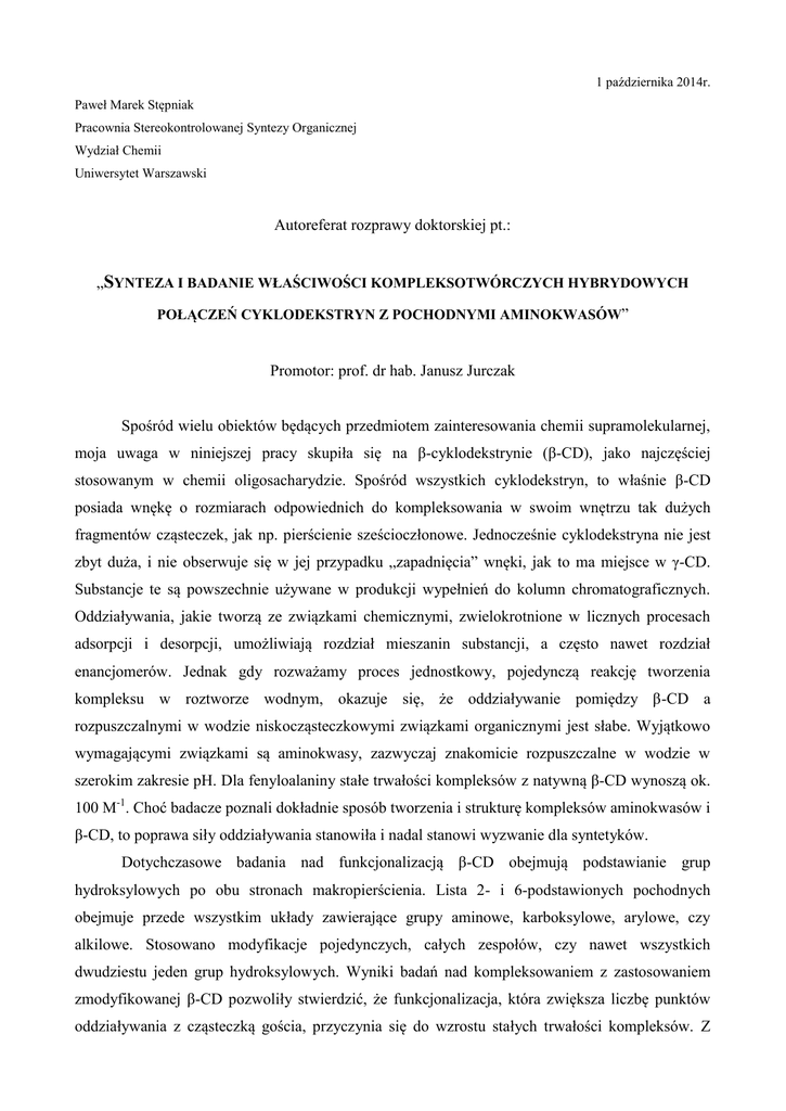 1 października 2014r. Paweł Marek Stępniak Pracownia Stereokontrolowanej Syntezy Organicznej Wydział Chemii Uniwersytet Warszawski Autoreferat rozprawy doktorskiej pt.: „SYNTEZA I BADANIE WŁAŚCIWOŚCI KOMPLEKSOTWÓRCZYCH HYBRYDOWYCH POŁĄCZEŃ CYKLODEKSTRYN Z POCHODNYMI AMINOKWASÓW” Promotor: prof. dr hab. Janusz Jurczak Spośród wielu obiektów będących przedmiotem zainteresowania chemii supramolekularnej, moja uwaga w niniejszej pracy skupiła się na β-cyklodekstrynie (β-CD), jako najczęściej stosowanym w chemii oligosacharydzie. Spośród wszystkich cyklodekstryn, to właśnie β-CD posiada wnękę o rozmiarach odpowiednich do kompleksowania w swoim wnętrzu tak dużych fragmentów cząsteczek, jak np. pierścienie sześcioczłonowe. Jednocześnie cyklodekstryna nie jest zbyt duża, i nie obserwuje się w jej przypadku „zapadnięcia” wnęki, jak to ma miejsce w γ-CD. Substancje te są powszechnie używane w produkcji wypełnień do kolumn chromatograficznych. Oddziaływania, jakie tworzą ze związkami chemicznymi, zwielokrotnione w licznych procesach adsorpcji i desorpcji, umożliwiają rozdział mieszanin substancji, a często nawet rozdział enancjomerów. Jednak gdy rozważamy proces jednostkowy, pojedynczą reakcję tworzenia kompleksu w roztworze wodnym, okazuje się, że oddziaływanie pomiędzy β-CD a rozpuszczalnymi w wodzie niskocząsteczkowymi związkami organicznymi jest słabe. Wyjątkowo wymagającymi związkami są aminokwasy, zazwyczaj znakomicie rozpuszczalne w wodzie w szerokim zakresie pH. Dla fenyloalaniny stałe trwałości kompleksów z natywną β-CD wynoszą ok. 100 M-1. Choć badacze poznali dokładnie sposób tworzenia i strukturę kompleksów aminokwasów i β-CD, to poprawa siły oddziaływania stanowiła i nadal stanowi wyzwanie dla syntetyków. Dotychczasowe badania nad funkcjonalizacją β-CD obejmują podstawianie grup hydroksylowych po obu stronach makropierścienia. Lista 2- i 6-podstawionych pochodnych obejmuje przede wszystkim układy zawierające grupy aminowe, karboksylowe, arylowe, czy alkilowe. Stosowano modyfikacje pojedynczych, całych zespołów, czy nawet wszystkich dwudziestu jeden grup hydroksylowych. Wyniki badań nad kompleksowaniem z zastosowaniem zmodyfikowanej β-CD pozwoliły stwierdzić, że funkcjonalizacja, która zwiększa liczbę punktów oddziaływania z cząsteczką gościa, przyczynia się do wzrostu stałych trwałości kompleksów. Z tego powodu za kluczowe uważano wprowadzanie grup polarnych, często elektrycznie naładowanych, które miały oddziaływać z grupami aminową i karboksylową aminokwasu, podczas gdy wnęka cyklodekstryny miała być dogodnym „środowiskiem” dla hydrofobowych fragmentów tegoż aminokwasu. Wyniki tych badań były obiecujące, jednak stosowanie podstawników elektrycznie naładowanych ograniczało możliwości pracy tak zmodyfikowanej β-CD do pH powyżej 9. W swojej pracy podjąłem się próby opracowania pochodnej β-CD, której synteza miała być prosta i skuteczna. Otrzymywane związki miały być substancjami dobrze zdefiniowanymi, zawierać kilka domen wiążących różne grupy funkcyjne (czy inaczej: oddziałujących z nimi). Wreszcie miały silnie oddziaływać z aminokwasami. Opracowana metodologia syntezy okazała się bardzo wydajna, choć nie wszystkie zsyntezowane tą drogą związki mogły być ostatecznie zastosowane jako praktyczne receptory. Zaprojektowana synteza zbieżna minimalizowała manipulacje, jakim poddawać musiałem β-CD. Było to korzystne także ze względu na fakt jej rozpuszczalności w wodzie. Choćby odparowanie wodnego roztworu β-CD było procesem długotrwałym, uciążliwym i energochłonnym. Z tego powodu jej funkcjonalizacja grupami azydkową lub propargilową pozwoliła na szybkie i wydajne uzyskiwanie deocelowych związków: z użyciem sfunkcjonalizowanej cząsteczki β-CD przeprowadzałem tylko jedną reakcję, a następnie, w wyniku strącenia, uzyskiwałem praktycznie czysty pożądany produkt. Cały ciężar tworzenia skomplikowanej strukturalnie pochodnej przerzuciłem na drugiego partnera reakcyjnego: azydki lub estry propargilowe uzyskiwane z aminokwasów. Zastosowanie aminokwasów jako substancji wyjściowych było bardzo opłacalne, gdyż są one związkami o chyba największej „gęstości różnorodności strukturalnej” (przez co rozumiem tak dużą liczbę różnych grup funkcyjnych i elementów strukturalnych w tak małej cząsteczce). Mogłem zatem przygotować reagent zawierający komplementarną grupę funkcyjną podatną na cykkloaddycję azydkowo-alkinową, grupę aminową (dalej funkcjonalizowaną), różnorodny zestaw łańcuchów bocznych, itd. Jednocześnie, gotowy reagent był enancjomerycznie czystym związkiem chiralnym. Opracowana ścieżka reakcyjna była bardzo wydajna, a więc oba substraty do cykloaddycji azydkowo-alkinowej metodą „click” mogłem otrzymywać w dogodny i ekonomiczny sposób, w dużych ilościach. Opracowanie odpowiednich warunków do tej reakcji pozwoliło z powodzeniem stosować ją dla różnorodnych strukturalnie substratów, realizując tym samym pierwszy postawiony warunek – nieskomplikowanej, wydajnej syntezy. Badania strukturalne potwierdziły że uzyskane związki były dobrze zdefiniowane. Podstawienie zachodziło tylko w zakresie wybranej, pojedynczej grupy hydroksylowej, nie otrzymywałem mieszaniny różnie podstawionych substancji, a ilościowy przebieg reakcji cykloaddycji azydkowo-alkinowej przyczyniał się do izolowania produktu bez choćby śladowych ilości nieprzereagowanych substratów. Tym samym zaprojektowana synteza realizowała warunek otrzymywania dobrze zdefiniowanych związków. Dodatkowo wykazałem, że opracowana metodologia umożliwia syntezę związków o znacznie bardziej skomplikowanej budowie, przy zachowaniu pełnej kontroli nad miejscami funkcjonalizacji. Możliwe jest zatem monopodstawienie zarówno w pozycji C-2, jak i C-6. 