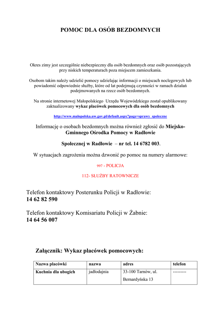 POMOC DLA OSÓB BEZDOMNYCH Okres zimy jest szczególnie niebezpieczny dla osób bezdomnych oraz osób pozostających przy niskich temperaturach poza miejscem zamieszkania. Osobom takim należy udzielić pomocy udzielając informacji o miejscach noclegowych lub powiadomić odpowiednie służby, które od lat podejmują czynności w ramach działań podejmowanych na rzecz osób bezdomnych. Na stronie internetowej Małopolskiego Urzędu Wojewódzkiego został opublikowany zaktualizowany wykaz placówek pomocowych dla osób bezdomnych http://www.malopolska.uw.gov.pl/default.aspx?page=sprawy_spoleczne Informację o osobach bezdomnych można również zgłosić do MiejskoGminnego Ośrodka Pomocy w Radłowie Społecznej w Radłowie – nr tel. 14 6782 003. W sytuacjach zagrożenia można dzwonić po pomoc na numery alarmowe: 997 - POLICJA 112- SŁUŻBY RATOWNICZE Telefon kontaktowy Posterunku Policji w Radłowie: 14 62 82 590 Telefon kontaktowy Komisariatu Policji w Żabnie: 14 64 56 007 Załącznik: Wykaz placówek pomocowych: Nazwa placówki nazwa adres telefon Kuchnia dla ubogich jadłodajnia 33-100 Tarnów, ul. --------- Bernardyńska 13 Kuchnia dla ubogich jadłodajnia 33-100 Tarnów ul. ------------- Krakowska 41 Kuchnia Caritas Jadłodajnia 33-100 Tarnów ul. Noclegowania Prostopadła 9A 146223978 dla mężczyzn Punkt Pomocy Ubogim jadłodajnia Ul. Kapitulna 3 przy Parafii Katedralnej Punkt Pomocy Ubogim 33-100 Tarnów jadłodajnia 33-100 Tarnów Ul. Lwowska 102 przy Parafii Najświętszego Serca Pana Jezusa Punkt Pomocy Ubogim jadłodajnia 33-100 Tarnów, ul. Piłsudskiego 9 przy Parafii Księży Filipinów Dom dla Samotnej Matki Noclegownia dla Schronisko- 33-100 Tarnów, ul. kobiety w ciąży Mościckiego 65 noclegownia 33-100 Tarnów, ul. 694085229 Bandrowskiego 26 602650904 Tuchów ul. Daleka 3 605407503 bezdomnych Dom Samotnej Matki Schronisko dla Kobiety+Dzieci 146211301 665407502 Dom dla Bezdomnych Dom dla Tarnów, ul. Tel. 14 Mężczyzn bezdomnych M Prostopadła 9A 6223978