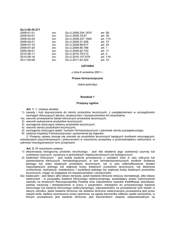 Dz.U.08.45.271 2009-01-01 2009-03-07 2009-03-24 2009-04-01 2009-07-10 2009-07-20 2009-08-01 2010-06-11 2010-09-18 2011-04-08 zm. zm. zm. zm. zm. zm. zm. zm. zm. zm. Dz.U.2008.234.1570 Dz.U.2009.18.97 Dz.U.2008.227.1505 Dz.U.2009.31.206 Dz.U.2009.98.817 Dz.U.2009.95.788 Dz.U.2009.92.753 Dz.U.2010.78.513 Dz.U.2010.107.679 Dz.U.2011.63.322 art. art. art. art. art. art. art. art. art. art. 59 35 173 73 24 1 17 2 119 72 USTAWA z dnia 6 września 2001 r. Prawo farmaceutyczne (tekst jednolity) Rozdział 1 Przepisy ogólne Art. 1. 1. Ustawa określa: 1) zasady i tryb dopuszczania do obrotu produktów leczniczych, z uwzględnieniem w szczególności wymagań dotyczących jakości, skuteczności i bezpieczeństwa ich stosowania; 1a) warunki prowadzenia badań klinicznych produktów leczniczych; 2) warunki wytwarzania produktów leczniczych; 3) wymagania dotyczące reklamy produktów leczniczych; 4) warunki obrotu produktami leczniczymi; 5) wymagania dotyczące aptek, hurtowni farmaceutycznych i placówek obrotu pozaaptecznego; 6) zadania Inspekcji Farmaceutycznej i uprawnienia jej organów. 2. Przepisy ustawy stosuje się również do produktów leczniczych będących środkami odurzającymi, substancjami psychotropowymi i prekursorami w rozumieniu przepisów o przeciwdziałaniu narkomanii, w zakresie nieuregulowanym tymi przepisami. Art. 2. W rozumieniu ustawy: 1) aktywnością biologiczną produktu leczniczego - jest siła działania jego substancji czynnej lub substancji czynnych, wyrażona w jednostkach międzynarodowych lub biologicznych; 2) badaniem klinicznym - jest każde badanie prowadzone z udziałem ludzi w celu odkrycia lub potwierdzenia klinicznych, farmakologicznych, w tym farmakodynamicznych skutków działania jednego lub wielu badanych produktów leczniczych, lub w celu zidentyfikowania działań niepożądanych jednego lub większej liczby badanych produktów leczniczych, lub śledzenia wchłaniania, dystrybucji, metabolizmu i wydalania jednego lub większej liczby badanych produktów leczniczych, mając na względzie ich bezpieczeństwo i skuteczność; 2a) badaczem - jest lekarz albo lekarz dentysta, jeżeli badanie kliniczne dotyczy stomatologii, albo lekarz weterynarii - w przypadku badania klinicznego weterynaryjnego, posiadający prawo wykonywania zawodu na terytorium Rzeczypospolitej Polskiej oraz odpowiednio wysokie kwalifikacje zawodowe, wiedzę naukową i doświadczenie w pracy z pacjentami, niezbędne do prowadzonego badania klinicznego lub badania klinicznego weterynaryjnego, odpowiedzialny za prowadzenie tych badań w danym ośrodku; jeżeli badanie kliniczne lub badanie kliniczne weterynaryjne prowadzone jest przez zespół osób, badacz wyznaczony przez sponsora, za zgodą kierownika zakładu opieki zdrowotnej, w którym prowadzone jest badanie kliniczne, jest kierownikiem zespołu odpowiedzialnym za prowadzenie tego badania w danym ośrodku; 2b) badaniem klinicznym weterynaryjnym - jest każde badanie, którego celem jest potwierdzenie przewidywanej skuteczności lub bezpieczeństwa badanego produktu leczniczego weterynaryjnego prowadzone z udziałem docelowych gatunków zwierząt; 2c) badanym produktem leczniczym - jest substancja albo mieszanina substancji, którym nadano postać farmaceutyczną substancji czynnej lub placebo, badana lub wykorzystywana jako produkt referencyjny w badaniu klinicznym, w tym również produkt już dopuszczony do obrotu, ale stosowany lub przygotowany w sposób odmienny od postaci dopuszczonej do obrotu lub stosowany we wskazaniu nieobjętym pozwoleniem, lub stosowany w celu uzyskania dodatkowych informacji dotyczących postaci już dopuszczonych do obrotu; 2d) badanym produktem leczniczym weterynaryjnym - jest substancja albo mieszanina substancji, którym nadano postać farmaceutyczną albo biologiczną, i które są wykorzystywane w badaniach klinicznych weterynaryjnych; 3) działaniem niepożądanym badanego produktu leczniczego albo badanego produktu leczniczego weterynaryjnego - jest każde niekorzystne i niezamierzone działanie tych produktów, występujące po zastosowaniu jakiejkolwiek dawki tych produktów; 3a) działaniem niepożądanym produktu leczniczego - jest każde niekorzystne i niezamierzone działanie produktu leczniczego występujące podczas stosowania dawek zalecanych u ludzi w celach profilaktycznych, diagnostycznych, terapeutycznych lub dla modyfikacji funkcji fizjologicznych; 3b) działaniem niepożądanym produktu leczniczego weterynaryjnego - jest każde niekorzystne i niezamierzone działanie produktu leczniczego weterynaryjnego: a) występujące podczas stosowania dawek zalecanych u zwierząt w celach profilaktycznych, diagnostycznych, leczniczych oraz dla przywrócenia, poprawienia lub modyfikacji funkcji fizjologicznych organizmu, b) które występuje u człowieka po ekspozycji na produkt leczniczy weterynaryjny; 3c) ciężkim niepożądanym zdarzeniem po użyciu badanego produktu leczniczego albo badanego produktu leczniczego weterynaryjnego - jest zdarzenie, które bez względu na zastosowaną dawkę badanego produktu leczniczego albo badanego produktu leczniczego weterynaryjnego powoduje zgon pacjenta, zagrożenie życia, konieczność hospitalizacji lub jej przedłużenie, trwały lub znaczny uszczerbek na zdrowiu lub jest chorobą, wadą wrodzoną lub uszkodzeniem płodu; 3d) ciężkim niepożądanym działaniem produktu leczniczego - jest działanie, które bez względu na zastosowaną dawkę produktu leczniczego powoduje zgon pacjenta, zagrożenie życia, konieczność hospitalizacji lub jej przedłużenie, trwały lub znaczny uszczerbek na zdrowiu lub inne działanie produktu leczniczego, które lekarz według swojego stanu wiedzy uzna za ciężkie, lub jest chorobą, wadą wrodzoną lub uszkodzeniem płodu; 4) Dobrą Praktyką Dystrybucyjną - jest praktyka, która gwarantuje bezpieczne przyjmowanie, transportowanie, przechowywanie i wydawanie produktów leczniczych; 5) (uchylony); 6) Dobrą