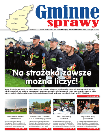 ISSN 1233-2267 MIESIĘCZNIK GMINy MIEDźNA | nr 10 (29), październik 2016 | Cena: 1 zł (w tym 8% VAT) na strażaka zawsze można liczyć! na co dzień dbają o nasze bezpieczeństwo. a w ostatnią sobotę września strażacy z trzech jednostek oSP z gminy Miedźna spotkali się w Górze na zawodach sportowo-pożarniczych. Sprawdzali swoje wyszkolenie, sprzęt, a także integrowali się z kolegami z innych jednostek. w rywalizacji najlepsza okazała się drużyna oSP Miedźna WIĘCEJ NA sTr. 2 Nowatorskie badania w Gilowicach PGNiG i Państwowy Instytut Geologiczny – Państwowy Instytut Badawczy w Gilowicach sprawdzają nową metodę wydobycia metanu WIĘCEJ NA sTr. 4 Roboty na DW 933 w Górze. A co ze światłami przy szkole? Bądź bezpieczny na drodze Jego dobro wciąż promieniuje Zarząd Dróg Wojewódzkich przebudowuje drogę w Górze. Rozpoczął też analizę celowości montażu świateł na przejściu dla pieszych przy szkole Bezpieczeństwo na drodze było hasłem przewodnim III Pikniku Rodzinnego, który odbył się w piątek, 9 września przy Gimnazjum nr 2 w Woli 28 września w Szkole Podstawowej im. Janusza Korczaka w Górze przyjaciele, znajomi, rodzina oraz mieszkańcy gminy wspominali ks. Piotra Zegrodzkiego WIĘCEJ NA sTr. 5 WIĘCEJ NA sTr. 6 WIĘCEJ NA sTr. 8 2 AKTUALNOŚCI gminne sprawy – październik 2016 Strażacy z trzech jednostek OSP z gminy Miedźna spotkali się w Górze na zawodach sportowo-pożarniczych Na strażaka zawsze można liczyć! I to oni będą reprezentować gminę Miedźna w zawodach powiatowych. Co Komendant Gminny OSP może powiedzieć o strażakach-ochotnikach z gminy Miedźna po ostatnich zawodach? - Są bardzo sprawni. Wszyscy nasi strażacy są przeszkoleni na odpowiednim poziomie, uczęszczają na kursy w Państwowej Straży Pożarnej w Pszczynie – dodaje. Więcej zdjęć z zawodów publikujemy na str. 12. W gminie Miedźna są cztery jednostki Ochotniczych Straży Pożarnych: w Miedźnej, Woli, Górze oraz Gilowicach. Łącznie działa w nich ok. 130 osób. W Gminnych Zawodach Sportowo-Pożarniczych Gminy Miedźna udział wzięli strażacy z ochotniczych straży pożarnych z Góry, Miedźnej i Gilowic. Na co dzień gaszą pożary czy biorą udział w usuwaniu skutków wypadków. Czyli dbają o to, byśmy czuli się bezpiecznie. A we wrześniu wspólnie sprawdzali swoje umiejętności. Zawody odbyły się w sobotę, 24 września na boisku spor towym w Górze. Strażacy-ochotnicy z gminy Miedźna rywalizowali w dwóch konkurencjach – sztafecie pożarniczej oraz ćwiczeniu bojowym, które polegało na doprowadzeniu do obrócenia tarczy i strącenia pachołków prądem wody. Oprócz drużyn dorosłych, w rywalizacji udział wzięła też drużyna młodzieżowa z OSP Miedźna. - Celem zawodów było wyszkolenie strażaków w działaniach. Przydaje się to w codziennych akcjach, bo mogli poćwiczyć np. montowanie linii czy sprawdzanie sprzętu. Ma to służyć też integracji jednostek z gminy Miedźna, bo po zawodach przygotowano poczęstunek dla uczestników – przyznaje Adam Tomala, Komendant Gminny OSP. Sędzią głównym zawodów był st. kpt. Damian Wala. Ostatecznie najlepsi okazali się strażacy OSP w Miedźnej. Najlepsi w zawodach okazali się strażacy-ochotnicy z Miedźnej 8 pk (fot. OSP Miedźna) Wyniki Gminnych Zawodów SportowoPożarniczych 1 - OSP Miedźna (sztafeta – 65 pkt., ćwiczenie bojowe – 44 pkt.) – 109 pkt. 2 - OSP Gilowice (sztafeta – 69 pkt., ćwiczenie bojowe – 55 pkt.) – 124 pkt. 3 - OSP Góra (sztafeta – 75 pkt., ćwiczenie bojowe – 60 pkt.) – 135 pkt. Jedną z konkurencji było ćwiczenie bojowe (fot. pk) Delegacje KGW z gminy Miedźna wzięły udział w obchodach wojewódzkich 150-lecia Kół Gospodyń Wiejskich na ziemiach polskich Świętowały 150-lecie KGW Uroczystości regionalne odbyły się w niedzielę, 25 września w gminie Pilica (powiat zawierciański). Spotkały się tam przedstawicielki Kół Gospodyń Wiejskich ze wszystkich regionów województwa śląskiego. Były też delegacje ze wszystkich kół działających na terenie gminy Miedźna. Korowód miał aż 2 km! Na uroczystość przybyli parlamentarzyści na czele z wicemarszałek Sejmu, władze samorządowe województwa śląskiego, powiatowe oraz przedstawiciele instytucji działających na rzecz rolnictwa. Za działalność kół dziękował też wójt Bogdan Taranowski. Rozpoczęto od uroczystej mszy św., dalsze uroczystości odbyły się nieopodal zamku Pilcza w Smoleniu, na terenie Parku Krajobrazowego Orlich Gniazd. Imprezę prowadziła mieszkanka naszej gminy oraz przewodnicząca Wojewódzkiej Rady Kół Gospodyń Wiejskich w Katowicach, Łucja Krutak. Nie zabrakło przemówień, gratulacji oraz prezentów. Członkiniom kół przyznano też Odznaczenia za Zasługi dla Województwa Śląskiego, Odznaczenia dla Zasługi dla Kółek Rolniczych, Odznaczenia Złoty Kółkowicz oraz Ordery Serca Matkom Wsi. Tymi ostatnimi uhonorowane zostały m.in. członkinie KGW Góra, Klara Kosma oraz Felicja Rąba. Uroczystość 150-lecia KGW na ziemiach polskich była także okazją do zaprezentowania ludowych strojów oraz wspólnej zabawy. - Widać było ogromną różnorodność strojów. Muszę przyznać, że nasze panie z gminy Miedźna wyglądały pięknie – przyznaje Łucja Krutak. - Koła Gospodyń Wiejskich działające w naszej gminie wyróżniają się pozytywnie także patrząc na ich działalność. Są prężne, bardzo różnorodne, organizujemy sporo ciekawych imprez – dodaje. I zapowiada, że w listopadzie planowane są gminne obchody 150-lecia KGW. Koła Gospodyń Wiejskich to dobrowolne i niezależne organizacje. Pierwsze KGW na ziemiach polskich powstało w 1866 r. na Pomorzu. Wtedy działano jako Towarzystwo Gospodyń, nazwa KGW funkcjonuje od 1918 r. 8 pk Wśród odznaczonych Orderem Serca Matkom Wsi znalazły się także mieszkanki gminy (fot. UM Pilica) Miedźna Członkinie kół z całego województ