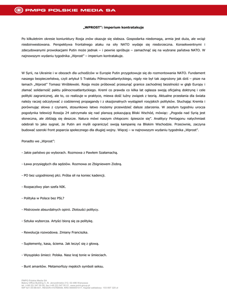 „WPROST”: imperium kontratakuje Po kilkuletnim okresie koniunktury Rosja znów okazuje się słabsza. Gospodarka niedomaga, armia jest duża, ale wciąż niedoinwestowana. Perspektywa frontalnego ataku na siły NATO wydaje się niedorzeczna. Konsekwentnymi i zdecydowanymi prowokacjami Putin może jednak – i pewnie spróbuje – zamachnąć się na wybrane państwa NATO. W najnowszym wydaniu tygodnika „Wprost” – imperium kontratakuje. W Syrii, na Ukrainie i w obozach dla uchodźców w Europie Putin przygotowuje się do rozmontowania NATO. Fundament naszego bezpieczeństwa, czyli artykuł 5 Traktatu Północnoatlantyckiego, nigdy nie był tak zagrożony jak dziś – pisze na łamach „Wprost” Tomasz Wróblewski. Rosja może próbować przesunąć granice zachodniej bezsilności w głąb Europy i złamać solidarność paktu północnoatlantyckiego. Kreml co prawda co kilka lat ogłasza swoją oficjalną doktrynę i cele polityki zagranicznej, ale to, co realizuje w praktyce, miewa dość luźny związek z teorią. Aktualne przesłania dla świata należy raczej odczytywać z codziennej propagandy i z okazjonalnych wystąpień rosyjskich polityków. Słuchając Kremla i porównując słowa z czynami, stosunkowo łatwo możemy przewidzieć dalsze zdarzenia. W zeszłym tygodniu urocza pogodynka telewizji Rossija 24 zatrzymała się nad planszą pokazującą Bliski Wschód, mówiąc: „Pogoda nad Syrią jest słoneczna, ale zbliżają się deszcze. Natura mówi naszym chłopcom: śpieszcie się”. Analitycy Pentagonu natychmiast odebrali to jako sygnał, że Putin ani myśli ograniczyć swoją kampanię na Bliskim Wschodzie. Przeciwnie, zaczyna budować szeroki front poparcia społecznego dla długiej wojny. Więcej – w najnowszym wydaniu tygodnika „Wprost”. Ponadto we „Wprost”: - Jakie państwo po wyborach. Rozmowa z Pawłem Szałamachą. - Ława przysięgłych dla sędziów. Rozmowa ze Zbigniewem Ziobrą. - PO bez uzgodnionej płci. Próba sił na koniec kadencji. - Rozpaczliwy plan szefa NIK. - Polityka w Polsce bez PSL? - Mistrzowie absurdalnych opinii. Złotouści politycy. - Sztuka wyborcza. Artyści biorą się za politykę. - Rewolucja rozwodowa. Zmiany Franciszka. - Suplementy, kasa, ściema. Jak leczyć się z głową. - Wysypisko śmieci: Polska. Nasz kraj tonie w śmieciach. - Bunt amantów. Metamorfozy męskich symboli seksu. PMPG Polskie Media SA Batory Office Building II, Al. Jerozolimskie 212, 02-486 Warszawa tel. (+48 22) 347 50 00, fax (+48 22) 347 50 01, www.point-group.pl NIP 521-00-88-831, REGON 010768408, KRS 0000051017, Kapitał zakładowy: 103 897 320 zł - Niezbadane wyroki szwedzkiej akademii. A w specjalnym dodatku – laureaci i relacja z gali Innowatory Wprost 2015. Nowy numer "Wprost” trafi do kiosków w poniedziałek, 12 października 2015 r. E-wydanie tygodnika będzie dostępne w nowej aplikacji na e.wprost.pl. "Wprost" można zakupić także w wersji do słuchania. oraz na AppleStore i GooglePlay. Zapowiedzi najciekawszych materiałów z najnowszego wydania tygodnika: - na Facebooku (https://www.facebook.com/tygodnikwprost) - oraz na Twitterze (https://twitter.com/TygodnikWPROST). Wydawcą tygodnika „Wprost” jest AWR „Wprost”, spółka zależna giełdowej spółki PMPG Polskie Media SA (GPW: PMPG). Bieżące informacje ze spółki na www.pmpg.pl oraz na profilach w serwisach Twitter: https://twitter.com/PMPG_PL i Facebook: https://www.facebook.com/PMPG.SA. PMPG Polskie Media SA Batory Office Building II, Al. Jerozolimskie 212, 02-486 Warszawa tel. (+48 22) 347 50 00, fax (+48 22) 347 50 01, www.point-group.pl NIP 521-00-88-831, REGON 010768408, KRS 0000051017, Kapitał zakładowy: 103 897 320 zł