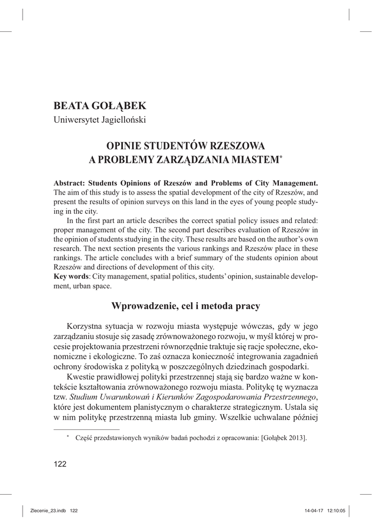 BEATA GOŁĄBEK Uniwersytet Jagielloński OPINIE STUDENTÓW RZESZOWA A PROBLEMY ZARZĄDZANIA MIASTEM* Abstract: Students Opinions of Rzeszów and Problems of City Management. The aim of this study is to assess the spatial development of the city of Rzeszów, and present the results of opinion surveys on this land in the eyes of young people studying in the city. In the first part an article describes the correct spatial policy issues and related: proper management of the city. The second part describes evaluation of Rzeszów in the opinion of students studying in the city. These results are based on the author’s own research. The next section presents the various rankings and Rzeszów place in these rankings. The article concludes with a brief summary of the students opinion about Rzeszów and directions of development of this city. Key words: City management, spatial politics, students’ opinion, sustainable development, urban space. Wprowadzenie, cel i metoda pracy Korzystna sytuacja w rozwoju miasta występuje wówczas, gdy w jego zarządzaniu stosuje się zasadę zrównoważonego rozwoju, w myśl której w procesie projektowania przestrzeni równorzędnie traktuje się racje społeczne, ekonomiczne i ekologiczne. To zaś oznacza konieczność integrowania zagadnień ochrony środowiska z polityką w poszczególnych dziedzinach gospodarki. Kwestie prawidłowej polityki przestrzennej stają się bardzo ważne w kontekście kształtowania zrównoważonego rozwoju miasta. Politykę tę wyznacza tzw. Studium Uwarunkowań i Kierunków Zagospodarowania Przestrzennego, które jest dokumentem planistycznym o charakterze strategicznym. Ustala się w nim politykę przestrzenną miasta lub gminy. Wszelkie uchwalane później * Część przedstawionych wyników badań pochodzi z opracowania: [Gołąbek 2013]. 122 Zlecenie_23.indb 122 14-04-17 12:10:05 miejscowe plany zagospodarowania przestrzennego, będące aktami prawa miejscowego, muszą być zgodne z zapisami tego studium. Zachowany w ten sposób w mieście ład przestrzenny warunkuje ład społeczno-gospodarczy w sensie ilościowym i jakościowym. Rozwój ilościowy w tym kontekście utożsamiać można z ekspansją przestrzenną i zmianą funkcji pewnych obszarów w mieście lub jego strefie podmiejskiej. Rozwój jakościowy natomiast rozumieć należy jako optymalizację wykorzystania przestrzeni w mieście przez wybór najbardziej efektywnego funkcjonalnie modelu użytkowania ziemi, zapewniając jednocześnie najlepszy poziom obsługi mieszkańców z zachowaniem wysokich walorów środowiska przyrodniczego [Markowski, Drzazga 2008]. Istotną rolę w projektowaniu i planowaniu przestrzeni miejskiej odgrywają zachowania studentów w mieście. Warto wziąć pod uwagę specyficzne potrzeby tej grupy społecznej oraz ich opinię na temat sposobu zarządzania miastem, a także ocenę efektów tego zarządzania, którymi jest zagospodarowanie przestrzeni miejskiej. Zazwyczaj wizerunek miasta powstający w oczach ludzi młodych przez okres studiów wpływa częściowo na ich decyzje dotyczące miejsca pracy, czy też miejsca zamieszkania później. Właściwe zarządzanie miastem to takie zarządzanie, które przyciągnie ludzi młodych, które otwarte będzie na napływ innowacji i nowoczesnych technologii, tworzyć będzie klimat sprzyjający przedsiębiorczości, ale też doprowadzi do powstania atrakcyjnego miejsca do zamieszkania, oferując szeroki wachlarz ofert: mieszkaniowej, usługowej, rekreacyjnej, publicznej. Niekiedy pomija się znaczenie przestrzeni publicznej w mieście. Przestrzeń ta bywa niewłaściwie zagospodarowana, nie jest przyjazna dla przechodniów, staje się zaniedbana i „niczyja”, podczas gdy jest ona przeznaczona szczególnie dla mieszkańców miasta. Celem prezentowanej pracy jest ocena zagospodarowania przestrzennego miasta Rzeszowa oraz przedstawienie wyników badań dotyczących opinii tego zagospodarowania w oczach młodych ludzi studiujących w tym mieście. 1. Ocena miasta Rzeszowa Rzeszów jest stolicą woj. podkarpackiego, centrum potencjalnego Rzeszowskiego Obszaru Metropolitalnego, a także gospodarczym, naukowym i kulturalnym centrum południowo-wschodniej Polski. Miasto zamieszkuje obecnie 182 tys. mieszkańców na powierzchni 116,32 km2 (stan na grudzień 2012 r. www.bip.rzeszow.pl). Liczba ta zwiększa się, kiedy do miasta napływają studenci, których obecnie jest ponad 60 tys., z czego większość pochodzi 123 Zlecenie_23.indb 123 14-04-17 12:10:05 spoza Rzeszowa. Stanowią oni istotny procent ogólnej liczby mieszkańców miasta i zamieszkują w nim przez niemal 2/3 roku. Na jednego mieszkańca w tym mieście przypada najwyższy w Europie odsetek studentów studiujących. Z roku na rok następuje systematyczny wzrost liczby studentów podejmujących naukę oraz zwiększanie się oferty w zakresie wyboru kierunków studiów. Od 2005 r. władze Rzeszowa prowadzą politykę poszerzania miasta przez przyłączanie sąsiadujących gmin. Na skutek tych działań powierzchnia miasta wzrosła ponad dwukrotnie w ciągu siedmiu lat. Rzeszów zyskał liczne tereny niezagospodarowane w sposób miejski, w tym zielone, które są rezerwami przestrzennymi pod nowe inwestycje. O opinię na temat zagospodarowania Rzeszowa zostali poproszeni studenci z Rzeszowa. W ankiecie wykonanej przez autorkę wzięło udział 255 studentów rzeszowskich uczelni: Uniwersytetu Rzeszowskiego, Politechniki Rzeszowskiej (uczelnie państwowe), Wyższej Szkoły Informatykii Zarządzania, Zamiejscowego Wydziału Prawa i Administracji Wyższej Szkoły Prawa i Administracji w Przemyślu z siedzibą w Rzeszowie, Wyższej Szkoły Inżynieryjno-Ekonomicznej z siedzibą w Rzeszowie, Wyższej Szkoły Zarządzania, Wyższego Seminarium Duchownego, Promar-International, Nauczycielskiego Kolegium Języków Obcych (uczelnie prywatne). Badania objęły roczniki, które rozpoczęły studia w latach 2007-2010. Ankieta zawierała 27 pytań. 