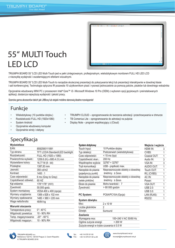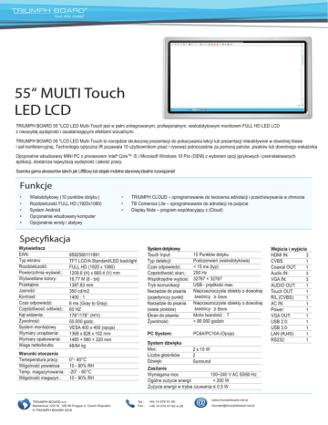 55“ MULTI Touch LED LCD TRIUMPH BOARD 55 "LCD LED Multi-Touch jest w pełni zintegrowanym, profesjonalnym, wielodotykowym monitorem FULL HD LED LCD z niezwykłą wydajność i oszałamiającymi efektami wizualnymi. TRIUMPH BOARD 55 "LCD LED Multi-Touch to narzędzie skutecznej prezentacji do pokazywania lekcji lub prezentacji interaktywnie w dowolnej klasie i sali konferencyjnej. Technologia optyczna IR pozawala 10 użytkownikom pisać i rysować jednocześnie za pomocą palców, pisaków lub dowolnego wskażnika Opcjonalnie wbudowany MINI PC z procesorem Intel® Core™ i5 i Microsoft Windows 10 Pro (OEM) z wyborem opcji językowych i preinstalowanych aplikacji, dostarcza najwyższą wydajność i jakość pracy. Szeroka gama akcesoriów takich jak LiftBoxy lub stojaki mobilne stanowią idealne rozwiązanie! Funkcje • • • • • WIelodotykowy ( 10 punktów dotyku ) Rozdzielczość FULL HD (1920x1080) System Android Opcjonalnie wbudowany komputer Opcjonalnie windy i statywy • • • TRIUMPH CLOUD – oprogramowanie do tworzenia adnotacji i przechowywania w chmurze TB Comenius Lite – oprogramowanie do adnotacji na pulpicie Display Note – program współracyjący z (Cloud) Specyfikacja Wyświetlacz EAN: Typ ekranu Rozdzielczość: Powierzchnia wyświet.: Wyświetlane kolory: Przekątna: Jasność: Kontrast: Czas odpowiedzi: Częstotliwosć odśwież.: Kąt widzenia: Żywotność System montażowy Wymiary urządzenia: Wymiary opakowania: Waga netto/brutto: 8592580111891 TFT LCD/A Standard/LED backlight FULL HD (1920 x 1080) 1209.6 (H) x 680.4 (V) mm 16,77 M (8 - bit) 1387,83 mm 350 cd/m2 1400 : 1 6 ms (Gray to Gray) 60 HZ 178°/178° (H/V) 50.000 godz. VESA 400 x 400 (opcja) 1369 x 828 x 102 mm 1485 × 980 × 220 mm 48/64 kg Warunki otoczenia Temeperatura pracy: Wilgotność powietrza: Temp. magazynowania: Wilgotność magazyn.: 0°- 40°C 10 - 90% RH -20° - 60°C 10 - 90% RH TRIUMPH BOARD a.s. Neklanova 122/15, 128 00 Prague 2, Czech Republic © TRIUMPH BOARD 2016 System dotykowy Touch Input: Typ detekcji: Czas odpowiedzi: Częstotliwość skan.: Współrzędne wyjścia: Tryb komunikacji Narzędzie do pisania (pojedynczy punkt) Narzędzie do pisania (wiele pinktów) Ekran do pisania: Żywotność: 10 Punktów dotyku Podczerwień (wielodotykowa) < 15 ms (typ) 200 Hz 32767 × 32767 USB - prędkość max. Nieprzezroczyste obiekty o dowolnej średnicy ≥ 5mm Nieprzezroczyste obiekty o dowolnej średnicy ≥ 8mm Mohs twardość : 7 > 80 000 godzin PC System: PC6A/PC10A (Opcja) System dźwięku Moc: Liczba głośników Dźwięk: 2 x 10 W 2 Surround Zasilanie 100~240 V AC 50/60 Hz Wymagana moc < 200 W Ogólne zużycie energii Zużycie energii w trybie czuwania:≤ 0.5 W Tel.: Fax.: +48 14 678 91 60 +48 14 678 91 60 w.26 www.triumphboard.net.pl http://www.triumphboard.net.pl mailto:[email protected] [email protected] Wejścia i wyjścia HDMI IN: 3 CVBS: 1 Coaxial OUT: 1 Audio IN: 3 VGA IN: 3 AUDIO OUT: 1 Touch OUT: 1 R/L (CVBS): 1 AC IN: 1 Power: 1 VGA OUT: 1 USB 2.0: 1 USB 3.0: 1 LAN (RJ45): 1 RS232: 1
