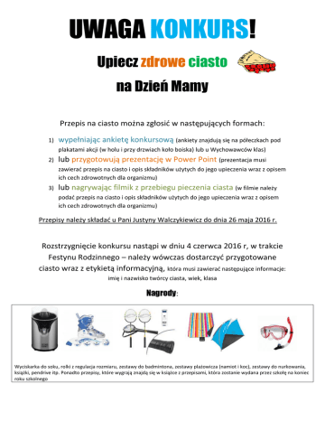 UWAGA KONKURS! Upiecz zdrowe ciasto na Dzień Mamy Przepis na ciasto można zgłosić w następujących formach: 1) wypełniając ankietę konkursową (ankiety znajdują się na półeczkach pod plakatami akcji (w holu i przy drzwiach koło boiska) lub u Wychowawców klas) 2) lub przygotowują prezentację w Power Point (prezentacja musi zawierać przepis na ciasto i opis składników użytych do jego upieczenia wraz z opisem ich cech zdrowotnych dla organizmu) 3) lub nagrywając filmik z przebiegu pieczenia ciasta (w filmie należy podać przepis na ciasto i opis składników użytych do jego upieczenia wraz z opisem ich cech zdrowotnych dla organizmu) Przepisy należy składać u Pani Justyny Walczykiewicz do dnia 26 maja 2016 r. Rozstrzygnięcie konkursu nastąpi w dniu 4 czerwca 2016 r, w trakcie Festynu Rodzinnego – należy wówczas dostarczyć przygotowane ciasto wraz z etykietą informacyjną, która musi zawierać następujące informacje: imię i nazwisko twórcy ciasta, wiek, klasa Nagrody: Wyciskarka do soku, rolki z regulacja rozmiaru, zestawy do badmintona, zestawy plażowicza (namiot i koc), zestawy do nurkowania, książki, pendrive itp. Ponadto przepisy, które wygrają znajdą się w książce z przepisami, która zostanie wydana przez szkołę na koniec roku szkolnego Ankieta konkursowa strona 1/2 Przepis na zdrowe ciasto na Dzień Mamy: ………………………………………………………………………………………………………………………………………………………………………………………………… ………………………………………………………………………………………………………………………………………………………………………………………………… ………………………………………………………………………………………………………………………………………………………………………………………………… ………………………………………………………………………………………………………………………………………………………………………………………………… ………………………………………………………………………………………………………………………………………………………………………………………………… ………………………………………………………………………………………………………………………………………………………………………………………………… ………………………………………………………………………………………………………………………………………………………………………………………………… ………………………………………………………………………………………………………………………………………………………………………………………………… ……………………………………………………………………………………………...………………………………………………………………………………………………… ……………………………………………………………………………………………...………………………………………………………………………………………………… ……………………………………………………………………………………………...………………………………………………………………………………………………… ……………………………………………………………………………………………...………………………………………………………………………………………………… ……………………………………………………………………………………………...………………………………………………………………………………………………… ……………………………………………………………………………………………...………………………………………………………………………………………………… ……………………………………………………………………………………………...………………………………………………………………………………………………… ……………………………………………………………………………………………...………………………………………………………………………………………………… ……………………………………………………………………………………………...………………………………………………………………………………………………… ……………………………………………………………………………………………...………………………………………………………………………………………………… ……………………………………………………………………………………………...………………………………………………………………………………………………… ……………………………………………………………………………………………...………………………………………………………………………………………………… ……………………………………………………………………………………………...………………………………………………………………………………………………… 