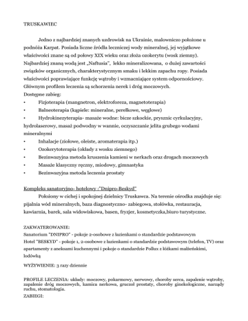 TRUSKAWIEC Jedno z najbardziej znanych uzdrowisk na Ukrainie, malowniczo położone u podnóża Karpat. Posiada liczne źródła leczniczej wody mineralnej, jej wyjątkowe właściwości znane są od połowy XIX wieku oraz złoża ozokerytu (wosk ziemny). Najbardziej znaną wodą jest „Naftusia”, lekko mineralizowana, o dużej zawartości związków organicznych, charakterystycznym smaku i lekkim zapachu ropy. Posiada właściwości poprawiające funkcję wątroby i wzmacniające system odpornościowy. Głównym profilem leczenia są schorzenia nerek i dróg moczowych. Dostępne zabieg: • Fizjoterapia (mangnetron, elektroforeza, magnetoterapia) • Balneoterapia (kąpiele: mineralne, perełkowe, węglowe) • Hydrokinezyterapia- masaże wodne: bicze szkockie, prysznic cyrkulacyjny, hydrolaserowy, masaż podwodny w wannie, oczyszczanie jelita grubego wodami mineralnymi • Inhalacje (ziołowe, oleiste, aromaterapia itp.) • Ozokerytoterapia (okłady z wosku ziemnego) • Bezinwazyjna metoda kruszenia kamieni w nerkach oraz drogach moczowych • Masaże klasyczny ręczny, miodowy, gimnastyka • Bezinwazyjna metoda leczenia prostaty Kompleks sanatoryjno- hotelowy :”Dnipro-Beskyd” Położony w cichej i spokojnej dzielnicy Truskawca. Na terenie ośrodka znajduje się: pijalnia wód mineralnych, baza diagnostyczno- zabiegowa, stołówka, restauracja, kawiarnia, barek, sala widowiskowa, basen, fryzjer, kosmetyczka,biuro turystyczne. ZAKWATEROWANIE: Sanatorium "DNIPRO" - pokoje 2-osobowe z łazienkami o standardzie podstawowym Hotel "BESKYD" - pokoje 1, 2-osobowe z łazienkami o standardzie podstawowym (telefon, TV) oraz apartamenty z aneksami kuchennymi i pokoje o standardzie Pollux z łóżkami małżeńskimi, lodówką WYŻYWIENIE: 3 razy dziennie PROFILE LECZENIA: układy: moczowy, pokarmowy, nerwowy, choroby serca, zapalenie wątroby, zapalenie dróg moczowych, kamica nerkowa, gruczoł prostaty, choroby ginekologiczne, narządy ruchu, stomatologia. ZABIEGI: - Fizjoterapia (magnetron, elektroforeza, magnetoterapia), - Balneoterapia (kąpiele: mineralne, perełkowe, węglowe), - Hydrokinezyterapia - masaże wodne: bicze szkockie, prysznic cyrkulacyjny, hydrolaserowy, masaż podwodny w wannie, oczyszczanie jelita grubego wodami mineralnymi - Inhalacje (ziołowe, oleiste itp.), - Ozokerytoterapia (okłady z wosku ziemnego), - Bezinwazyjna metoda kruszenia kamieni w nerkach oraz w drogach moczowych, - Masaże, gimnastyka, - Bezinwazyjna metoda leczenia prostaty. TERMINY: dowolne (od soboty do soboty) Pokoje Dwuosobowe Dwuosobowy (standard/1os.) Cena (za 1 tydzień za osobę) Wyżywienie w stołówce ośrodka 1000,00 Szwedzki stół 1190,00 Jednoosobowe Jednoosobowy (standard) DNIPRO 1150,00 - Jednoosobowy (standard) BESKYD 1100,0 1280,00 Cena zawiera: - zakwaterowanie (7 noclegów) - wyżywienie wg opcji (3 razy dziennie) - zabiegi lecznicze zgodnie z zaleceniem lekarza - ubezpieczenie NNW i KLiA Cena nie zawiera: - ubezpieczenia płatnego na granicy (ok. 5 USD / os.) - transportu 220 zł/os - opłaty klimatycznej (ok. 1 USD / 7 dni / os.).