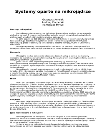 Systemy oparte na mikrojądrze Grzegorz Anielak Andrzej Kacperski Remigiusz Mytyk Dlaczego mikrojądro? Początkowo systemy operacyjne były stosunkowo małe ze względu na ograniczenie wielkością pamięci. Z czasem możliwości komputerów zaczęły się zwiększać, pojawiało się wiele nowych urządzeń, które systemy musiały obsługiwać. W 1977 pojawił się BSD (Berkeley Software Distribution), w którym pojawiły się funkcje takie jak obsługa dodatkowych systemów plików i kompletnego protokołu TCP/IP. Jądra rozrastały się, przez co stawały się coraz bardziej podatne na błędy, trudne w utrzymaniu i rozbudowie. Mikrojądra powstały jako odpowiedź na ten wzrost. W założeniu miały pozwolić na łatwiejsze zarządzanie kodem dzięki podziałowi na usługi działające w przestrzeni użytkownika. Koncepcja Mikrojądro, według założeń nie udostępnia żadnych usług, a jedynie mechanizmy niezbędne do zaimplementowania takich usług. W związku z tym część logiki systemu musi być zaszyta w przestrzeni użytkownika. Jądro zawiera tylko najbardziej niezbędne elementy (tj. komunikację międzyprocesorową, zarządzanie wątkami, obsługę przerwań i wyjątków). Inne zadania takie jak obsługa urządzeń, systemu plików i sieci realizowana jest w przestrzeni użytkownika przez osobne serwery. Do najbardziej znanych systemów operacyjnych o mikrojądrach należą: MINIX, Hurd, Amoeba, QNX. Mikrojądrami są także Mach oraz L4. Firma Microsoft prowadzi projekt badawczy o nazwie Singularity mający na celu stworzenie systemu opartego na mikrojądrze, który w przyszłości może stać się częścią Microsoft Midori. MINIX MINIX jest systemem uniksopodobnym (tj. o zbliżonej do Uniksa budowie, ale o kodzie niewywodzącym się z BSD lub System V) stworzonym przez Andrew Tanenbauma, profesora na Uniwersytecie Vrije w Amsterdamie. MINIX to system tworzony w celach edukacyjnych (co jest wytłumaczeniem dla jego licznych ograniczeń). Pierwsza wersja systemu pojawiła się w roku 1987, czemu towarzyszyło pojawienie się książki Operating Systems Design and Implemetation, w której zawarto elementy kodu źródłowego systemu. W roku 2005 pojawiła się wersja 3.0 systemu wspierająca tylko architekturę x86. Zamierzeniem twórców było, aby był to system używany na słabych maszynach, od którego wymaga się dużej niezawodności. GNU/Hurd GNU/Hurd to jądro systemu, korzystające aktualnie z mikrojądra Mach 4. GNU/Hurd jest powstał w 1984 roku i od tego czasu jest rozwijany w ramach projektu GNU. Ciekawą cechą tego jądra jest jest mechanizm tzw. translatorów, działających na zasadzie filtrów nakładanych na konkretne miejsca w drzewie katalogowym. GNU/Hurd wykorzystywany jest w dystrybucji Debian GNU/Hurd. Jądro monolityczne a mikrojądro Podział systemów na mikrojądro i procesy działające w przestrzeni użytkownika powoduje, że struktura takich systemów znacząco różni się od jąder monolitycznych. Systemy z jądrami monolitycznymi mają budowę poprzecznych warstw. Aplikacje komunikują się z jądrem za pomocą wywołań systemowych. Systemy oparte na mikrojądrach mają horyzontalną budowę, zaś procesy mogą komunikować się z innymi poprzez wywołanie systemowe skierowane do odpowiedniego serwera poprzez IPC. Serwery te są uruchamiane w trakcie uruchomienia systemu, aby udostępniać usługi zwykłym aplikacjom. Mikrojądro udostępnia jedynie podstawowe mechanizmy takie jak: zarządzanie pamięcią, zarządzanie wątkami, podstawowa komunikacja międzyprocesowa, obsługa przerwań i wyjątków. Resztę zadań wykonują procesy wykonywane w przestrzeni użytkownika. Zazwyczaj w systemie funkcjonują takie serwery jak: serwer systemu plików, serwery interfejsu użytkownika, serwery sieci oraz sterowników. Korzystanie z pamięci przez proces nie musi odbywać się za pośrednictwem mikrojądra. Niektóre procesy (np. sterowniki dysków) mogą uzyskać prawa do bezpośredniego zapisu do tych dysków. Jeśli dojdzie do błędu, serwery mogą być w łatwy sposób wznawiane, co jest chyba największą zaletą systemów opartych o mikrojądra. Ich przewagą nad systemami o jądrach monolitycznych jest także większe bezpieczeństwo. Wyobraźmy sobie, że w sterowniku urządzenia sieciowego wystąpi przepełnienie bufora. W systemie opartym na mikrojądrze reszta systemu pozostanie sprawna, podczas gdy w jądrze monolitycznym może nastąpić ingerencja w przestrzenie adresowe innych procesów, a nawet, co gorsza, samego jądra. System MINIX posiada dwa serwery umożliwiające tzw. self-repairing, czyli automatyczną naprawę w przypadku wystąpenia błędu. Pierwszym z nich jest serwer reinkarnacji. Serwer ten jest rodzicem wszystkich sterowników i serwerów. Jego zadaniem jest wznawianie sterowników, które ulegną awarii. Wysyła on cyklicznie żądania zwrócenia statusu do wszystkich sterowników w systemie, a następnie w przypadku nieuzyskania odpowiedzi lub uzyskania błędnej odpowiedzi, podmienia dany sterownik, zastępując go jego świeżą kopią. Zamiana ta odbywa się automatycznie i w sposób niewidoczny dla użytkownika. Drugim serwerem jest data store. Jest to minibaza danych, która przechowuje informacje na temat stanu komponentów działających w systemie. Na przykład w przypadku sterownika pamięci RAM, mógłby być to początek i koniec przestrzeni adresowej, aby w przypadku awarii starego sterownika nowa kopia mogła kontynuować jego pracę. KOMUNIKACJA Wstęp Wydzielenie sterowników i serwerów z jądra systemu operacyjnego do oddzielnych modułów działających, jako samodzielne procesy w trybie użytkownika niesie za sobą wiele korzyści, ale aby można było z tego skorzystać musimy sobie poradzić z pewnymi problemami: • Zależności pomiędzy modułami • Ograniczone pole manewru w trybie użytkownika Zależności Pomimo iż sterowniki i serwery działają jako oddzielne procesy, nie mamy 