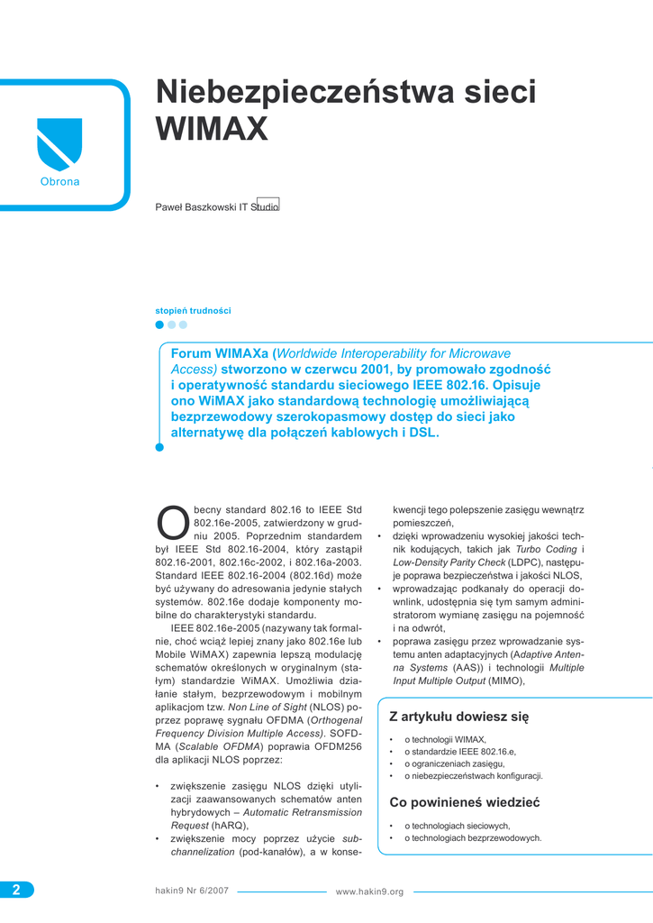 Niebezpieczeństwa sieci WIMAX Obrona Paweł Baszkowski IT Studio stopień trudności Forum WIMAXa (Worldwide Interoperability for Microwave Access) stworzono w czerwcu 2001, by promowało zgodność i operatywność standardu sieciowego IEEE 802.16. Opisuje ono WiMAX jako standardową technologię umożliwiającą bezprzewodowy szerokopasmowy dostęp do sieci jako alternatywę dla połączeń kablowych i DSL. O becny standard 802.16 to IEEE Std 802.16e-2005, zatwierdzony w grudniu 2005. Poprzednim standardem był IEEE Std 802.16-2004, który zastąpił 802.16-2001, 802.16c-2002, i 802.16a-2003. Standard IEEE 802.16-2004 (802.16d) może być używany do adresowania jedynie stałych systemów. 802.16e dodaje komponenty mobilne do charakterystyki standardu. IEEE 802.16e-2005 (nazywany tak formalnie, choć wciąż lepiej znany jako 802.16e lub Mobile WiMAX) zapewnia lepszą modulację schematów określonych w oryginalnym (stałym) standardzie WiMAX. Umożliwia działanie stałym, bezprzewodowym i mobilnym aplikacjom tzw. Non Line of Sight (NLOS) poprzez poprawę sygnału OFDMA (Orthogenal Frequency Division Multiple Access). SOFDMA (Scalable OFDMA) poprawia OFDM256 dla aplikacji NLOS poprzez: • • 2 zwiększenie zasięgu NLOS dzięki utylizacji zaawansowanych schematów anten hybrydowych – Automatic Retransmission Request (hARQ), zwiększenie mocy poprzez użycie subchannelization (pod-kanałów), a w konse- hakin9 Nr 6/2007 kwencji tego polepszenie zasięgu wewnątrz pomieszczeń, dzięki wprowadzeniu wysokiej jakości technik kodujących, takich jak Turbo Coding i Low-Density Parity Check (LDPC), następuje poprawa bezpieczeństwa i jakości NLOS, wprowadzając podkanały do operacji downlink, udostępnia się tym samym administratorom wymianę zasięgu na pojemność i na odwrót, poprawa zasięgu przez wprowadzanie systemu anten adaptacyjnych (Adaptive Antenna Systems (AAS)) i technologii Multiple Input Multiple Output (MIMO), • • • Z artykułu dowiesz się • • • • o technologii WIMAX, o standardzie IEEE 802.16.e, o ograniczeniach zasięgu, o niebezpieczeństwach konfiguracji. Co powinieneś wiedzieć • • www.hakin9.org o technologiach sieciowych, o technologiach bezprzewodowych. Niebezpieczny WIMAX • • eliminowanie zależności przepustowości danego kanału na podwykonawczym dzieleniu kanału umożliwia równą wydajność dla dowolnego kanału RF (radiowego) w zakresie 1.25-20 Mhz, wzbogacony algorytm transformacji – Fast Fourier transform (FFT) – może tolerować większe opóźnienia, zwiększając oporność dla zależności wielościeżkowych. Z drugiej strony, 802.16-2004 (WiMAX) oferuje korzyść dostępnych produktów komercyjnych i implementację zoptymalizowaną dla stałego dostępu. Stały WiMAX jest popularnym standardem wśród alternatywnych dostawców usług i operatorów w rozwijaniu obszarów ze względu na niski koszt rozmieszczenia zaawansowanej wydajności w stałym środowisku. Stały WiMax jest to również potencjalny standard dla bezprzewodowych stacji bazowych, takich jak komórki, WiFi, a także przenośny WiMAX. SOFDMA i OFDM256 nie są kompatybilne, a więc większość sprzętu musi być wymieniona. Jednak niektórzy producenci planują zapewnić ścieżkę migracyjną dla starszego wyposażenia kompatybilności SOFDMA, który mógłby być użyteczny dla tych sieci, które mają już poczynione inwestycje w OFDM256. Niestety wpływa to na małą liczbę użytkowników i operatorów. Użycie Pasmo i dostępność WiMAX są wygodne dla następujących potencjalnych aplikacji: • • • podłączenia hotspotów Wi-Fi pomiędzy sobą i z dostępem do internetu, zapewniając bezprzewodową alternatywę dla kabla i usług DSL do ostatniego km szerokopasmowego dostępu, zapewniając szybką prędkość danych przenośnych i usług telekomunikacyjnych, • • zapewniając podzielny dostęp do sieci Internet jako część planu biznesowego ciągłości pracy. To znaczy, w przypadku posiadania stałego i bezprzewodowego internetu, szczególnie od niezwiązanych dostawców, bardzo rzadko następuje dostęp do usługi poprzez ten sam zasięg serwisowy, zapewniając połączenia tzw. nomadic. Dostęp szerokopasmowy Wiele firm szczegółowo zastanawia się nad użyciem technologii WiMAX jako last mile (połączenia punktwielopunkt) połączenie w drogich opłatach za przesył danych. Spowodować może to obniżkę cen zarówno dla klientów domowych, jak i biznesowych. W miejscach, gdzie brak kabli lub sieci telefonicznych WiMAX może stanowić ciekawą alternatywę dla szerokopasmowego dostępu, który byłby ekonomicznie niedostępny (zbyt drogi). Niezależnie od WiMAX, wielu operatorów używa stałych technologii bezprzewodowych dla usług szerokopasmowych. Zestawy WiMAX są dostępne zarówno do użytku wewnętrznego, jak i zewnętrznego. Zestawy do własnoręcznej instalacji wewnątrz pomieszczeń są wygodne, ale użytkownik musi być bliżej stacji bazowej WiMAX niż w przypadku profesjonalnie instalowanych zestawów. Dodatkowo, wewnętrzne zestawy instalacyjne wymagają kosztów w bardziej złożoną infrastrukturę sieciową, jak również kosztów operacyjnych (wynajem pomieszczeń, obsługa) w związku z dużą ilością stacji bazowych, wymaganych, by pokryć dany obszar. Wewnętrzne zestawy są porównywalne do modemu kablowego lub modemu DSL. Na zewnątrz zestawy umożliwiają użytkownikowi dużo większe odległości od stacji bazowych WiMAX i z reguły wymagają profesjonalnej instalacji. Instalacje zewnętrznych zestawów są porównywalne do instalacji anten satelitarnych. www.hakin9.org Ograniczenia Mówi się, że WiMAX dostarcza 70 Mbit/s na ponad 112 kilometrów. Jest to prawdziwe stwierdzenie, ale dzieje się tak przy idealnych okolicznościach. W praktyce oznacza to, że tzw. środowisko line-ofsight, gdzie możesz dostarczyć symetrycznie prędkość to 10Mb/s dla 10km, a w wysoko zurbanizowanych środowisk