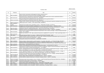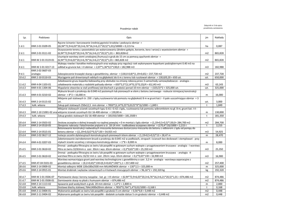Przedmiar robót Lp. Podstawa 1 d.1 KNR 2-01 0109-05 2 d.1 KNR 2-01 0111-02 3 d.1 KNR-W 2-01 0119-01 4 d.1 KNR-W 2-01 0217-13 KNR 2-02 0607-03 analogia KNR 2-10 0110-03 9 d.1 10 d.2 Opis Ręczne ścinanie i karczowanie średniej gęstości krzaków i podszycia obmiar = ((6,94*72,9+6,03*20,3+6,76*16,3+6,21*20,5)*1,01)/10000 = 0,115 ha Oczyszczenie terenu z pozostałości po wykarczowaniu (drobne gałęzie, korzenie, kora i wrzos) z wywiezieniem obmiar = (6,94*72,9+6,03*20,3+6,76*16,3+6,21*20,5)*1,01 = 865,828m2 Usunięcie warstwy ziemi urodzajnej (humusu) o grub.do 15 cm za pomocą spycharek obmiar = (6,94*72,9+6,03*20,3+6,76*16,3+6,21*20,5)*1,01 = 865,828 m2 Wykopy rowów i kanałów melioracyjnych oraz wykopy przy regulacji rzek wykonywane koparkami podsiębiernymi 0.40 m3 na odkład w gruncie kat. I-II obmiar = 2,07*1,36*0,5*130,0 = 182,988 m3 18 d.3 19 d.3 Zabezpieczenie krawędzi skarpy z geowłókniny. obmiar = (130,0-0,8)*(1,19+0,65) = 237,728 m2 Wyciąganie pali drewnianych wbitych na głębokość do 6 m z terenu lub rusztowań obmiar = 130,0/0,20 = 650 szt. Załadowanie gruzu koparko-ładowarką przy obsłudze na zmianę roboczą przez 3 samochody samowyładowcze - analogia KNR 4-04 1103-01 załadowanie materiału z rozbiórki palisady obmiar = 650*5,5*(3,14*0,15*0,15)/4 = 63,143 m3 KNR 4-01 1304-06 Wypalanie otworów w stali profilowej lub blachach o grubości ponad 10 mm obmiar = (325/2)*2 = 325,000 szt. Wykucie bruzd o przekroju do 0.040 m2 poziomych lub pionowych w elem.z betonu żwirowego - rozkucie istniejacej konstrukcji KNR 4-01 0210-02 obmiar = 8*2 = 16,000 m Wbijanie pali stalowych śr. 250 z lądu,rusztowania lub pomostu na głębokość 8 m w grunt kat.I - II pale uszczelniające obmiar = 3 KNR 2-14 0115-02 szt. kalk. własna Zakup pali stalowych 250x12,5 mm obmiar = 7850*(3,14*0,25*0,0125*8*3)/1000 = 1,849 t Wbijanie stalowych scianek szczelnych typu G-61 i G-62 z lądu, rusztowania lub pomostu wibromłotem na gł. 8 m; grunt kat. I-II wbijanie ścianek szczelnych GU 16-400 obmiar = 130,00 m KNR 2-10 21001-02 analogia kalk. własna Zakup grodzic stalowych GU 16-400 obmiar = 181350/1000 = 181,3500 t 20 d.4 21 d.4 KNR 2-14 0503-02 KNR 2-14 0510-05 22 d.4 23 d.4 KNR 2-14 0515-01 KNR 2-02 0617-12 24 d.4 KNR 4-01 0207-03 25 d.5 KNR 2-01 0610-02 26 d.5 KNR 2-01 0610-02 27 d.5 28 d.6 29 d.6 KNR AT-04 0101-03 KNR 2-14 0909-02 KNR 2-14 0915-01 Deskow.oczepów o dolnej krawędzi na rzędnej powyżej +-0 m montaż z lądu obmiar = (1,19+0,5+0,5)*130,0= 284,700 m2 Zbrojenie nabrzeży i falochronów prętami o śr. 10-14 mm - nadbudowa oczepowa obmiar = (170,4*13)/1000 = 2,215 t Betonowanie konstrukcji nadwodnych mieszanka betonowa dostarczona mieszarka do betonu z odbiorem z lądu od pompy do betonu obmiar = ((1,19+0,5)/2*0,5)*130 = 54,925 m3 Izolacje szczelin dylatacyjnych konstrukcyjnych pionowych kitem obmiar = (1,19+0,5+0,5)*13 = 28,47 m Zabetonowanie żwirobetonem bruzd o przekroju do 0.045 m2 w podłożach, stropach i ścianach bez deskowań i stemplowań - przy stykach ścianki szczelnej z istniejaca konstrukcją obmiar = 1*8 = 8,000 m Drenaż - podsypka filtracyjna ze żwiru lub pospółki w gotowym suchym wykopie z przygotowaniem kruszywa - analogia - I warstwa filtra ze żwiru 32/63mm o szer. 30cm i wys. 65cm obmiar = 0,3*0,65*130 = 25,350 m3 Drenaż - podsypka filtracyjna ze żwiru lub pospółki w gotowym suchym wykopie z przygotowaniem kruszywa - analogia -II warstwa filtra ze żwiru 16/32 mm o szer. 20cm i wys. 65cm obmiar = 0,2*0,65*130 = 16,900 m3 Warstwa wzmacniająca grunt pod warstwy technologiczne z geowłókniny o szer. 3,2 m - analogia - warstwya separacyjne z geowłókniny obmiar = (0,2+0,65)*130+(0,3+0,65)*130)*1,1 = 257,400 m2 Montaż odbojnic MDB 120x100x2500 mm MILANÓWEK obmiar = 130*2,5 = 325,000 m Montaż drabinek i wyłazów ratowniczych o 4 kotwach mocujących obmiar = 96,16*2 = 192,320 kg 30 d.7 31 d.7 32 d.8 33 d.8 35 d.8 36 d.8 KNR-W 2-01 0506-07 KNR-W 2-01 0508-01 KNR 2-14 1113-02 kalk. własna KNR 2-11 0404-01 KNR 2-11 0404-02 Plantowanie skarp i korony nasypów - kat. gr. I-III obmiar = (6,94*72,9+6,03*20,3+6,76*16,3+6,21*20,5)*1,01 = 874,486 m2 Darniowanie skarp na płask z humusem obmiar = 874,486 m2 Spawanie pod wodą blach o grub. 20 mm obmiar = 1,4*2 = 2,800 m Dostawa blachy stalowej 764x1400x20mm obmiar = 7850*0,764*1,4*0,02/1000 = 0,168 t Wykonanie podsypki ze żwiru lub pospółki o grubości 5 cm obmiar = 0,56*0,8 = 0,448 m2 Wykonanie podsypki ze żwiru lub pospółki - dodatek za każde dalsze 5 cm grubości obmiar = 0,448 m2 11 d.2 14 d.3 15 d.3 16 d.3 17 d.3 Załącznik nr 3 do opisu przedmiotu zamówienia jm Nakłady ha 0,087 m2 865,828 m2 865,828 m3 182,988 m2 szt. 237,728 650,000 m3 szt. 63,143 325,000 m 16,000 szt. t 3,000 1,849 m t 130,000 181,350 m2 t 284,700 2,215 m3 m 54,925 28,470 m 8,000 m3 25,350 m3 16,900 m2 m kg 257,400 325,000 192,320 m2 m2 m t m2 m2 874,486 874,486 2,800 0,168 0,448 0,448