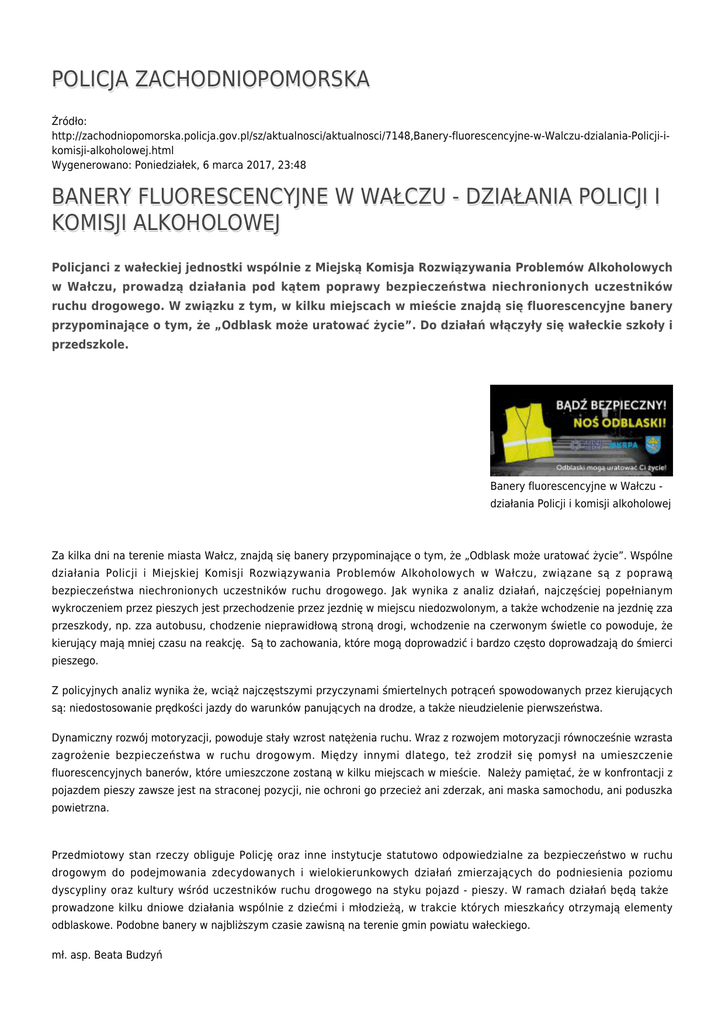 POLICJA ZACHODNIOPOMORSKA Źródło: http://zachodniopomorska.policja.gov.pl/sz/aktualnosci/aktualnosci/7148,Banery-fluorescencyjne-w-Walczu-dzialania-Policji-ikomisji-alkoholowej.html Wygenerowano: Poniedziałek, 6 marca 2017, 23:48 BANERY FLUORESCENCYJNE W WAŁCZU - DZIAŁANIA POLICJI I KOMISJI ALKOHOLOWEJ Policjanci z wałeckiej jednostki wspólnie z Miejską Komisja Rozwiązywania Problemów Alkoholowych w Wałczu, prowadzą działania pod kątem poprawy bezpieczeństwa niechronionych uczestników ruchu drogowego. W związku z tym, w kilku miejscach w mieście znajdą się fluorescencyjne banery przypominające o tym, że „Odblask może uratować życie”. Do działań włączyły się wałeckie szkoły i przedszkole. Banery fluorescencyjne w Wałczu działania Policji i komisji alkoholowej Za kilka dni na terenie miasta Wałcz, znajdą się banery przypominające o tym, że „Odblask może uratować życie”. Wspólne działania Policji i Miejskiej Komisji Rozwiązywania Problemów Alkoholowych w Wałczu, związane są z poprawą bezpieczeństwa niechronionych uczestników ruchu drogowego. Jak wynika z analiz działań, najczęściej popełnianym wykroczeniem przez pieszych jest przechodzenie przez jezdnię w miejscu niedozwolonym, a także wchodzenie na jezdnię zza przeszkody, np. zza autobusu, chodzenie nieprawidłową stroną drogi, wchodzenie na czerwonym świetle co powoduje, że kierujący mają mniej czasu na reakcję. Są to zachowania, które mogą doprowadzić i bardzo często doprowadzają do śmierci pieszego. Z policyjnych analiz wynika że, wciąż najczęstszymi przyczynami śmiertelnych potrąceń spowodowanych przez kierujących są: niedostosowanie prędkości jazdy do warunków panujących na drodze, a także nieudzielenie pierwszeństwa. Dynamiczny rozwój motoryzacji, powoduje stały wzrost natężenia ruchu. Wraz z rozwojem motoryzacji równocześnie wzrasta zagrożenie bezpieczeństwa w ruchu drogowym. Między innymi dlatego, też zrodził się pomysł na umieszczenie fluorescencyjnych banerów, które umieszczone zostaną w kilku miejscach w mieście. Należy pamiętać, że w konfrontacji z pojazdem pieszy zawsze jest na straconej pozycji, nie ochroni go przecież ani zderzak, ani maska samochodu, ani poduszka powietrzna. Przedmiotowy stan rzeczy obliguje Policję oraz inne instytucje statutowo odpowiedzialne za bezpieczeństwo w ruchu drogowym do podejmowania zdecydowanych i wielokierunkowych działań zmierzających do podniesienia poziomu dyscypliny oraz kultury wśród uczestników ruchu drogowego na styku pojazd - pieszy. W ramach działań będą także prowadzone kilku dniowe działania wspólnie z dziećmi i młodzieżą, w trakcie których mieszkańcy otrzymają elementy odblaskowe. Podobne banery w najbliższym czasie zawisną na terenie gmin powiatu wałeckiego. mł. asp. Beata Budzyń Ocena: 5/5 (1) Tweetnij