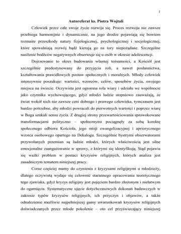 1 Autoreferat ks. Piotra Wojtali Człowiek przez całe swoje Ŝycie rozwija się. Proces rozwoju nie zawsze przebiega harmonijnie i dynamicznie, na jego drodze pojawiają się bowiem rozmaite przeszkody natury fizjologicznej, psychologicznej i socjologicznej, które spowalniają rozwój bądź kierują go na tory niepoŜądane. Szczególne nasilenie bodźców negatywnych obserwuje się u osób w okresie adolescencji. Dojrzewanie to okres budowania własnej toŜsamości, a Kościół jest szczególnie predestynowany do przyjęcia roli, a nawet posłannictwa, kształtowania prawidłowych postaw społecznych i moralnych. Młody człowiek intensywnie poszukuje: wartości, wzorców, celów, sposobów Ŝycia, swojego miejsca na świecie. Oczywista jest ogromna rola wiary i udziału we wspólnocie jako czynnika wychowującego, gdyŜ młodzi ludzie stopniowo zauwaŜają, Ŝe świat wokół nich nie zawsze ceni dobrego i prawego człowieka, tymczasem jest bardzo potrzebne, aby młodzi powracali do pierwotnych wartości i poprzez wiarę w Boga szukali sensu Ŝycia. Z drugiej strony przewartościowania sprowokowane transformacjami polityczno – społecznymi pociągnęły za sobą korektę społecznego odbioru Kościoła, jego misji ewangelizacyjnej i apriorycznego wzorca osobowego opartego na Dekalogu. Szczególnie bystrymi obserwatorami przywołanych przemian są ludzie młodzi, których właściwością jest silne emocjonalne zaangaŜowanie w sprawy, z którymi się identyfikują. Stąd pojawia się waŜki problem w postaci kryzysów religijnych, których analiza jest zasadniczym tematem niniejszej pracy. Coraz częściej mamy do czynienia z kryzysami religijnymi u młodzieŜy, dlatego oczywistą wydaje się celowość starannego opracowania teoretycznego tego zjawiska, gdyŜ kryzys religijny jest pojęciem bardzo złoŜonym i niełatwym do ogarnięcia. Systematyczne ujęcie dotychczasowych dokonań badawczych w zakresie typów kryzysów religijnych, ich przyczyn i objawów, a takŜe odnalezienie moŜliwie najpełniejszej gamy uwarunkowań kryzysów religijnych doświadczanych przez młode pokolenie – oto cel przyświecający niniejszej 2 pracy. Dogłębne zrozumienie przyczyn pozwoli na poszukiwanie skutecznych środków zaradczych. Celem pracy ma być takŜe pomoc tym wszystkim, którzy spotykają się w swoim Ŝyciu ze zjawiskiem kryzysu religijnego u ludzi młodych, tym, którzy z racji swojej profesji czy powołania zobowiązani są udzielić pomocy w sytuacjach trudnych, bowiem – jeśli chcemy rozwiązać problemy dorastającej młodzieŜy, to nie wystarczy jedynie je zauwaŜyć, naukowo opisać i statystycznie uporządkować, ale musimy wpłynąć na młodzieŜ i korygować jej zachowania. Kształtowanie psychiki człowieka, jego duchowości i moralności, jest nie tylko najwaŜniejszym, ale równieŜ najtrudniejszym zadaniem, tak w Ŝyciu człowieka, jak i w naukach teologicznych, pedagogicznych i psychologicznych. Przy opracowaniu tematu wykorzystano kilka metod roboczych, jak metoda obserwacji towarzyszącej, gdyŜ – jak juŜ wspomniano - Ŝyjąc w świecie trudno nie zauwaŜyć zjawiska kryzysu religijnego, szczególnie u młodzieŜy. Doświadczenie to zawsze będzie w określony sposób warunkować spojrzenie na opisywaną problematykę. By określić rozmiary pewnych zjawisk mierzalnych, posłuŜono się (w pierwszym i trzecim rozdziale) metodą statystyczną, która operując konkretnymi, uzyskanymi w wyniku profesjonalnych badań liczbami, ułatwia ogarnięcie rozmiarów zjawiska. Wiodąca rola przy opracowywaniu tematu przypadła jednak metodzie analityczno-syntetycznej, pozwala ona na efektywną analizę zagadnienia kryzysu młodzieńczego, zwłaszcza religijnego. Synteza pojawiających się w róŜnych momentach pracy wniosków daje odpowiedź na wyłaniające się pytania, pozwala wyabstrahować czynniki ułatwiające rozwiązanie kryzysów psychicznych i religijnych. Materiał pracy, po dokonaniu selekcji i opracowania, został podzielony na cztery rozdziały. Zadaniem pierwszego z nich jest ogólne scharakteryzowanie zjawiska kryzysów psychicznych, w tym celu dokonano przeglądu definicji tego pojęcia, następnie przedstawiono rozmaite teorie kryzysów i ich symptomy – z podziałem na wiek dziecięcy i dojrzały. Zjawisko kryzysu młodzieńczego, 3 głównego obiektu zainteresowania niniejszej pracy, ulokowano w wybranych teoriach z zakresu psychologii rozwojowej. Na zakończenie pierwszego rozdziału przeanalizowano szczegółowo mechanizm i przebieg kryzysu młodzieńczego. Główny cel tego rozdziału to wprowadzenie w tematykę pracy: ukazanie zjawiska na szerokim tle badań humanistycznych, analiza etiologii, przebiegu i skutków kryzysów psychicznych w ogólności, a kryzysów wieku młodzieńczego w szczególe. Rozdział drugi został zogniskowany na precyzyjnym scharakteryzowaniu jednego z etapów ontogenezy – okresu młodzieńczego. Po wykazaniu znaczącego wpływu tego etapu rozwoju na całe Ŝycie jednostki, przedstawiono w oparciu o wyniki badań czołowych znawców problemu, zmiany fizjologiczne, poznawcze i społeczne, przeanalizowano czynniki wpływające na te zmiany – a więc kształtujące osobowość człowieka. W dalszej części rozdziału omówiono problematykę rozwoju emocjonalnego, wolitywnego i moralnego oraz związanego z wymienionymi krystalizowania światopoglądu i toŜsamości. Analiza diachroniczna doświadczeń młodzieŜy i zadań rozwojowych tego etapu Ŝycia kończy rozdział. Rozdział trzeci zajmuje się kryzysami religijnymi w Ŝyciu człowieka młodego. Przedstawiony w nim został przebieg dziecięcej formacji religijnej i rozwój religijności w wieku dorastania dla ukazania ich znaczenia w Ŝyciu człowieka – ze szczególnym uwzględnieniem rudymentarnej zasady, Ŝe prawidłowe relacje społeczne w tym okresie Ŝycia owocują pragnieniem autentycznego kontaktu z Bogiem. Następnie, w oparciu o bogaty materiał źród