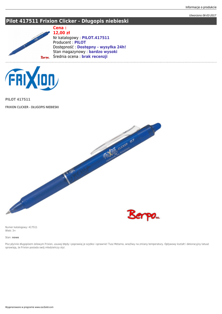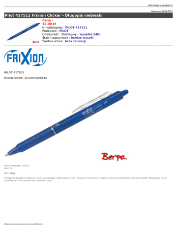 Informacje o produkcie Utworzono 06-03-2017 Pilot 417511 Frixion Clicker - Długopis niebieski Cena : 12,00 zł Nr katalogowy : PILOT.417511 Producent : PILOT Dostępność : Dostępny - wysyłka 24h! Stan magazynowy : bardzo wysoki Średnia ocena : brak recenzji PILOT 417511 FRIXION CLICKER - DŁUGOPIS NIEBIESKI Numer katalogowy: 417511 Wiek: 3+ Stan: nowe Pisz płynnie długopisem żelowym Frixion, usuwaj błędy i poprawiaj je szybko i sprawnie! Tusz Metamo, wrażliwy na zmiany temperatury. Opływowy kształt i dekoracyjny tatuaż sprawiają, że Frixion posiada swój młodzieńczy styl. Wygenerowano w programie www.oscGold.com Dostępność w salonach: Ilość sztuk: Sklep - Złotniki: 10 Sklep - zlikwidowany: 0 Sklep - Szczepankowo: 16