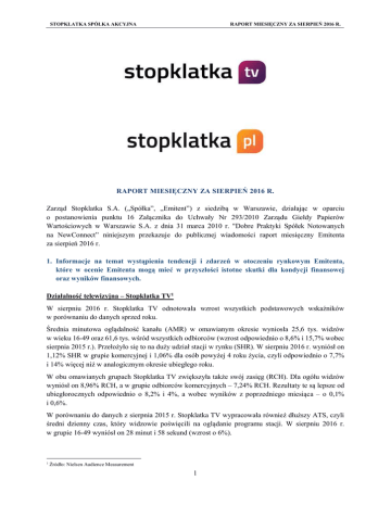 STOPKLATKA SPÓŁKA AKCYJNA RAPORT MIESIĘCZNY ZA SIERPIEŃ 2016 R. RAPORT MIESIĘCZNY ZA SIERPIEŃ 2016 R. Zarząd Stopklatka S.A. („Spółka”, „Emitent”) z siedzibą w Warszawie, działając w oparciu o postanowienia punktu 16 Załącznika do Uchwały Nr 293/2010 Zarządu Giełdy Papierów Wartościowych w Warszawie S.A. z dnia 31 marca 2010 r. "Dobre Praktyki Spółek Notowanych na NewConnect” niniejszym przekazuje do publicznej wiadomości raport miesięczny Emitenta za sierpień 2016 r. 1. Informacje na temat wystąpienia tendencji i zdarzeń w otoczeniu rynkowym Emitenta, które w ocenie Emitenta mogą mieć w przyszłości istotne skutki dla kondycji finansowej oraz wyników finansowych. Działalność telewizyjna – Stopklatka TV1 W sierpniu 2016 r. Stopklatka TV odnotowała wzrost wszystkich podstawowych wskaźników w porównaniu do danych sprzed roku. Średnia minutowa oglądalność kanału (AMR) w omawianym okresie wyniosła 25,6 tys. widzów w wieku 16-49 oraz 61,6 tys. wśród wszystkich odbiorców (wzrost odpowiednio o 8,6% i 15,7% wobec sierpnia 2015 r.). Przełożyło się to na duży udział stacji w rynku (SHR). W sierpniu 2016 r. wyniósł on 1,12% SHR w grupie komercyjnej i 1,06% dla osób powyżej 4 roku życia, czyli odpowiednio o 7,7% i 14% więcej niż w analogicznym okresie ubiegłego roku. W obu omawianych grupach Stopklatka TV zwiększyła także swój zasięg (RCH). Dla ogółu widzów wyniósł on 8,96% RCH, a w grupie odbiorców komercyjnych – 7,24% RCH. Rezultaty te są lepsze od ubiegłorocznych odpowiednio o 8,2% i 4%, a wobec wyników z poprzedniego miesiąca – o 0,1% i 0,6%. W porównaniu do danych z sierpnia 2015 r. Stopklatka TV wypracowała również dłuższy ATS, czyli średni dzienny czas, który widzowie poświęcili na oglądanie programu stacji. W sierpniu 2016 r. w grupie 16-49 wyniósł on 28 minut i 58 sekund (wzrost o 6%). 1 Źródło: Nielsen Audience Measurement 1 STOPKLATKA SPÓŁKA AKCYJNA RAPORT MIESIĘCZNY ZA SIERPIEŃ 2016 R. Przekształcenie modelu funkcjonowania portalu Stopklatka.pl 9 sierpnia 2016 r. Zarząd Emitenta (w nawiązaniu do raportu bieżącego EBI nr 27/2016 z dnia 21 czerwca 2016 r.), poinformował, iż podjął decyzję, że ze względu na kwestie techniczne portal Stopklatka.pl zostanie przekształcony w oficjalną stronę kanału Stopklatka TV z końcem sierpnia 2016 r. Spółka przekazała powyższą decyzję w raporcie bieżącym EBI nr 33/2016. 2. Zestawienie informacji opublikowanych przez Emitenta w okresie objętym raportem. RAPORTY EBI: Data Rodzaj Numer Temat raportu 12.08.2016 r. Bieżący 35/2016 11.08.2016 r. Okresowy 34/2016 09.08.2016 r. Bieżący 33/2016 Aktualizacja raportu bieżącego EBI nr 27/2016 Raport miesięczny Stopklatka S.A. za lipiec 2016 r. Raport kwartalny Stopklatka S.A. za drugi kwartał 2016 r. W okresie objętym niniejszym raportem Spółka nie publikowała raportów ESPI. 3. Informacje na temat realizacji celów emisji, jeżeli taka realizacja choćby w części miała miejsce w okresie objętym raportem oraz informacje na temat działalności Emitenta w sierpniu 2016 r. Informacje odnośnie najważniejszych wydarzeń, mających miejsce w sierpniu 2016 r. zostały przedstawione w pkt 1 niniejszego raportu. 4. Kalendarz inwestora, obejmujący wydarzenia mające mieć miejsce w nadchodzącym miesiącu, które dotyczą Emitenta i są istotne z punktu widzenia interesów inwestorów, w szczególności daty publikacji raportów okresowych, planowanych walnych zgromadzeń, otwarcia subskrypcji, spotkań z inwestorami lub analitykami oraz oczekiwany termin publikacji raportu analitycznego. W związku z punktem 16 Załącznika do Uchwały Nr 293/2010 Zarządu Giełdy Papierów Wartościowych w Warszawie S.A. z dnia 31 marca 2010 r. "Dobre Praktyki Spółek Notowanych na NewConnect” do dnia 14 października 2016 r. Emitent przekaże raport miesięczny za wrzesień 2016 r. 2 STOPKLATKA SPÓŁKA AKCYJNA RAPORT MIESIĘCZNY ZA SIERPIEŃ 2016 R. Podstawa prawna: Punkt 16 Załącznika do Uchwały Nr 293/2010 Zarządu Giełdy Papierów Wartościowych w Warszawie S.A. z dnia 31 marca 2010 r. "Dobre Praktyki Spółek Notowanych na NewConnect”. Osoby reprezentujące Spółkę: Bogusław Kisielewski – Prezes Zarządu Agnieszka Sadowska – Członek Zarządu 3