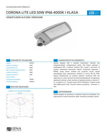 SZCZEGÓŁOWA KARTA PRODUKTU CORONA LITE LED 50W IP66 4000K I KLASA OŚWIETLENIE ULICZNE I DROGOWE PARAMETRY TECHNICZNE CHARAKTERYSTYKA PRODUKTU indeks : 504716 Oprawa drogowa Napięcie zasilajace : 230V energooszczędnym, zintegrowanym panelu LED. Korpus wykonany z Częstotliwość linii : 50Hz polipropylenu (PP) z włóknem szklanym (GF), uchwyt z aluminium. W Moc nominalna źródła światła : 50W oprawie zastosowano kierunkowe matryce soczewkowe (wykonane z Stopień ochrony IK : IK08 Stopień ochrony IP : IP66 Klasa ochrony : I Temperatura barwowa : 4000K Strumień świetlny : 6550lm PMMA), dzięki LED którym o wysokiej możliwe jest skuteczności uzyskanie świetlnej rozsyłu oraz światła spełniającego klasy oświetleniowe określone w normie PN EN 13201. Oprawa charakteryzuje się wysokim stopniem szczelności IP66 oraz odpornością na udary mechaniczne IK08 (wandaloodporna). Zintegrowany, regulowany skokowo uchwyt pozwala na regulację poziomą w zakresie 0°15° ze skokiem co 5°. Trwałość paneli LED 50 000 godzin. Trwałość paneli LED 50000 godzin (L70). Strumień świetlny początkowy - tolerancja +/- KRZYWE ŚWIATŁOŚCI CORONA LITE LED 50W IP66 4000K I KLASA 10%. ZASTOSOWANIE Oprawa drogowa do stosowania w otwartym terenie do oświetlenia: ulic, dróg lokalnych, ścieżek rowerowych, alejek, chodników, parkingów i placów. SZCZEGÓŁOWA KARTA PRODUKTU CORONA LITE LED 50W IP66 4000K I KLASA OŚWIETLENIE ULICZNE I DROGOWE TABELA PARAMETRÓW TECHNICZNYCH indeks: 504716 Źródło światła wymienne: Nie Napięcie zasilajace: 230V Częstotliwość linii: 50Hz Moc nominalna źródła światła: 50W Stopień ochrony IK: IK08 Stopień ochrony IP: IP66 Skuteczność świetlna: 131lm/W Klasa energetyczna: A+ Klasa ochrony: I Wymiary: 580/255/125mm Wymiary montażowe: ø64mm Waga: 2,3kg Materiał korpusu: Polipropylen z włóknem szklanym Temperatura barwowa: 4000K Sposób montażu: Boczny, szczytowy Zasilacz: EVG Kolor: Szary Strumień świetlny: 6550lm Moc znamionowa oprawy: 47,5W Współczynnik mocy lampy: 0,96 Kod EAN: 5905963 Oznaczenie CE: Tak Materiał klosza: PMMA Rodzaj klosza: Matryca Nominalny okres trwałości lampy: 50000h Znamionowa trwałość lampy: 50000h Czas nagrzewania się lampy do 60% pełnego strumienia świetlnego: pomijalny Współpraca z ściemniaczami: Brak możliwości ściemniania Do zastosowań zewnętrznych: Tak Oddawanie barw: Ra>70 Źródło światła: LED GO! Liczba sztuk w opakowaniu zbiorczym: 1 Data aktualizacji karty: 2016-11-30 3/2016 www.lenalighting.pl | Strona 2