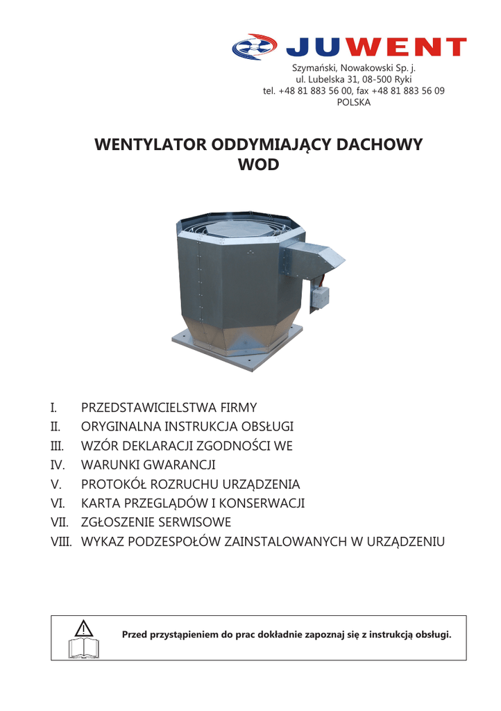 Szymański, Nowakowski Sp. j. ul. Lubelska 31, 08-500 Ryki tel. +48 81 883 56 00, fax +48 81 883 56 09 POLSKA WENTYLATOR ODDYMIAJĄCY DACHOWY WOD I. II. III. IV. V. VI. VII. VIII. PRZEDSTAWICIELSTWA FIRMY ORYGINALNA INSTRUKCJA OBSŁUGI WZÓR DEKLARACJI ZGODNOŚCI WE WARUNKI GWARANCJI PROTOKÓŁ ROZRUCHU URZĄDZENIA KARTA PRZEGLĄDÓW I KONSERWACJI ZGŁOSZENIE SERWISOWE WYKAZ PODZESPOŁÓW ZAINSTALOWANYCH W URZĄDZENIU Przed przystąpieniem do prac dokładnie zapoznaj się z instrukcją obsługi. I. PRZEDSTAWICIELSTWA FIRMY Białystok GSM +48 692 478 020 e-mail: [email protected] Poznań GSM +48 692 473 053 e-mail: [email protected] Gdańsk GSM +48 692 473 056 e-mail: [email protected] Rzeszów 35-210 Rzeszów, ul. Baczyńskiego 1 Tel. +48 17 853 50 09 Fax +48 17 853 50 09 GSM +48 660 771 537 e-mail: [email protected] Kielce GSM +48 606 618 860 e-mail: [email protected] Kraków 30-207 Kraków ul. Malczewskiego 47A lok.9 Tel. +48 12 655 90 63 Fax +48 12 655 97 50 GSM +48 664 197 142 e-mail: [email protected] Lublin GSM +48 692 476 090 e-mail: [email protected] Łódź 93-486 Łódź, ul. Zamojska 16 Tel. +48 42 682 70 55 Fax +48 42 682 70 56 GSM +48 600 438 028 e-mail: [email protected] Olsztyn GSM +48 606 908 820 e-mail: [email protected] 2 www.juwent.com.pl Szczecin GSM +48 608 539 432 e-mail: [email protected] Śląsk 41-200 Sosnowiec ul. Narutowicza 50 Tel. +48 32 293 54 47 Fax +48 32 293 54 47 GSM +48 604 978 536 e-mail: [email protected] Warszawa GSM +48 600 998 676 GSM +48 602 195 709 e-mail: [email protected] Wrocław 50-542 Wrocław ul. Żegiestowska 11 Tel. +48 71 787 21 60 Fax +48 71 787 21 61 GSM +48 601 974 999 GSM +48 601 671 566 e-mail: [email protected] II. ORYGINALNA INSTRUKCJA OBSŁUGI WENTYLATOR ODDYMIAJĄCY DACHOWY WOD wielkości 400÷800 www.juwent.com.pl 3 1. ZASTOSOWANIE SPIS TREŚCI 1.1. OZNAKOWANIE URZĄDZENIA 2. BUDOWA URZĄDZENIA 2.1. BUDOWA WENTYLATORA 3. PARAMETRY TECHNICZNE 4.1. WYMIARY 4 5 5 5 6 6 7 4. TRANSPORT I MAGAZYNOWANIE 7 5. MONTAŻ I URUCHOMIENIE 8 6. INSTALACJI ELEKTRYCZNA 8 7. NAPRAWA I KONSERWACJA 9 www.juwent.com.pl 1. ZASTOSOWANIE Wentylatory oddymiające dachowe WOD służą do usuwania gorących gazów, dymu oraz ciepła powstałego podczas pożaru z pomieszczeń, poprawiając tym samym warunki bezpiecznej ewakuacji i ratowania ludzi. Wykorzystanie wentylatorów oddymiających usuwających dym i ciepło umożliwia: »» utrzymanie drogi ewakuacyjnej w stanie niezadymionym, »» ułatwia prowadzenie akcji gaśniczej tworząc warstwę wolną od dymu, »» zmniejsza temperaturę konstrukcji budynków. Wentylatory WOD są wentylatorami dwufunkcyjnymi. Mogą być wykorzystane do wentylacji pomieszczeń gdzie temperatura przetłaczanego medium nie przekracza 100ºC oraz jako wentylatory oddymiające w przypadku pożaru klasa F400/120 gdzie temperatura medium nie przekracza 400ºC przez okres 120 minut. Zabrania się montowania i użytkowania urządzenia w miejscach gdzie prawdopodobne jest pojawienie się atmosfer wybuchowych. Zabrania się przetłaczania mieszanin zawierających ciała stałe, mieszanin pyłu z powietrzem oraz czynników agresywnych względem materiałów użytych do budowy urządzenia 1.1.OZNAKOWANIE URZĄDZENIA Każde urządzenie w zależności od wielkości i zastosowanego silnika posiada odpowiednie oznakowanie. Wentylator oddymiający WOD-450 -T/1400 -F400/120 Wielkość 400; 450; 500; 560; 630; 710; 800 Typ silnika / obroty jednobiegowy-T / 1400; 900; 700 dwubiegowy TD Klasyfikacja wentylatora 2. BUDOWA URZĄDZENIA 1 – płyta dachowa 2 – wirnik 3 – wspornik 4 – płyta silnika 5 – silnik elektryczny 6 – puszka elektryczna 7 – tunel wentylacyjny silnika 8 – siatka ochronna 9 – obudowa zewnętrzna www.juwent.com.pl 5 2.1.BUDOWA WENTYLATORA Wentylator WOD składa się z płyty dachowej ( Poz. 1), która przykręcana jest do elementu nośnego dachu. Silnik elektryczny (Poz . 5) spoczywa na płycie (Poz. 4), która leży na czterech wspornikach (Poz. 3). Wsporniki przykręcane są za pomocą śrub do płyty dachowej. Wirnik promieniowy z łopatkami wygiętymi do tyłu (Poz. 2) mocowany jest bezpośrednio na wale silnika umieszczony w szczelnej izolowanej kapsule. Tunelem wentylacyjnym (Poz. 7) doprowadzane jest chłodne powietrze do przewietrzania silnika. Aby tunel się nie nagrzewał jest on izolowany od środka. Zasilanie silnika podpinane jest do puszki elektrycznej (Poz. 6). W celu zapobiegnięcia dostaniu się ciał obcych w zasięg kręcącego się wirnika użyto siatki ochronnej (Poz. 8). Obudowa zewnętrzna (Poz. 9) kieruje strumień powietrza do góry. 3. PARAMETRY TECHNICZNE Parametry wentylatorów z silnikami jednobiegowymi Wielkość WOD-400 WOD-450 WOD-500 WOD-560 Wydatek powietrza [m3/h] 3800 2460 5800 3800 7500 4900 10100 6500 Ciśnienie statyczne [Pa] 350 150 450 190 520 240 700 300 Obroty [min-1] 1395 920 1415 915 1420 915 1435 Napięcie [V] 400 400 400 Moc silnika [kW] 0,55 0,37 1,1 0,75 1,5 0,75 4,0 Prąd [A] 1,46 1,20 2,6 2,05 3,52 2,05 8,2 Klasa izolacji H Masa [kg] 72 H 74 75 930 400 H 75 105 2,2 5,4 H 105 125 125 Parametry wentylatorów z silnikami jednobiegowymi Wielkość WOD-630 WOD-710 WOD-800 Wydatek powietrza [m3/h] 16050 10400 7600 21500 14000 10400 32500 21300 15600 Ciśnienie statyczne [Pa] 850 355 200 1100 455 250 1400 600 350 Obroty [min-1] 1450 930 700 1450 950 715 1460 970 715 Napięcie [V] 400 400 400 Moc silnika [kW] 5,5 2,2 1,5 7,5 3,0 2,2 15,0 7,5 4,0 Prąd [A] 11,2 5,4 4,7 15,2 7,3 6,3 23,0 17,6 9,7 Klasa izolacji H Masa [kg] 240 225 H 225 255 255 H 255 355 355 Parametry wentylatorów z silnikami dwubiegowymi 6 Wielkość WOD-400 WOD-450 WOD-500 Wydatek powietrza [m3/h] 3800/2460 5800/3800 7500/4900 Ciśnienie statyczne [Pa] 350/150 450/190 520/240 Obroty [min-1] 1420/930 1430/950 1435/920 Napięcie [V] 400 400 400 Moc silnika [kW] 0,55/0,18 1,1/0,38 1,7/0,6 3,90/2,5 Prąd [A] 2,82/1,27 24,61/2,31 Klasa izolacji H H H Masa [kg] 74 75 105 www.juwent.com.pl 355 3.1.WYMIARY M