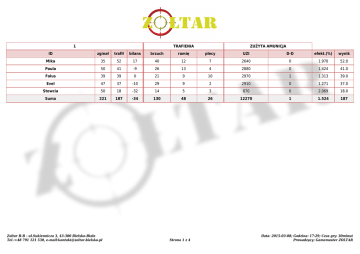 1 TRAFIENIA ZUŻYTA AMUNICJA ID zginał trafił bilans brzuch ramię plecy UZI D-D efekt.(%) wynik Mika 35 52 17 40 12 7 2640 0 1.970 52.0 Paula 50 41 -9 26 13 4 2880 0 1.424 41.0 Folus 39 39 0 21 9 10 2970 1 1.313 39.0 Evel 47 37 -10 29 9 2 2910 0 1.271 37.0 Stowcia 50 18 -32 14 5 3 870 0 2.069 18.0 Suma 221 187 -34 130 48 26 12270 1 1.524 187 Zoltar B-B - ul.Sukiennicza 3, 43-300 Bielsko-Biała Tel.:+48 791 121 530, e-mail:[email protected] Strona 1 z 4 Data: 2015-03-08; Godzina: 17:29; Czas gry: 30minut Prowadzący: Gamemaster ZOLTAR 1 TRAFIENIA ZUŻYTA AMUNICJA ID zginał trafił bilans brzuch ramię plecy UZI D-D efekt.(%) wynik Mika 22 42 20 31 8 6 1950 0 2.154 42.0 Paula 44 28 -16 20 5 7 960 11 2.884 28.0 Fojus 20 27 7 21 5 4 1290 3 2.088 27.0 Stowcia 16 27 11 17 7 5 810 3 3.321 27.0 Evel 36 14 -22 12 1 1 1200 0 1.167 14.0 Suma 138 138 0 101 26 23 6210 17 2.216 138 Zoltar B-B - ul.Sukiennicza 3, 43-300 Bielsko-Biała Tel.:+48 791 121 530, e-mail:[email protected] Strona 2 z 4 Data: 2015-03-08; Godzina: 16:41; Czas gry: 25minut Prowadzący: Gamemaster ZOLTAR Zestawienie wg wyniku Miejsce TRAFIENIA ZUŻYTA AMUNICJA ID zginał trafił bilans brzuch ramię plecy UZI D-D efekt.(%) wynik Mika 61.40 102.40 41.00 77.20 21.60 14.20 4980.00 0.00 2.056 102.40 Folus 78.00 78.00 0.00 42.00 18.00 20.00 5940.00 2.00 1.313 78.00 Paula 102.80 74.60 -28.20 50.00 19.00 12.40 4032.00 13.20 1.844 74.60 4 Fojus 48.00 64.80 16.80 50.40 12.00 9.60 3096.00 7.20 2.088 64.80 5 Evel 90.20 53.80 -36.40 43.40 10.20 3.20 4350.00 0.00 1.237 53.80 6 Stowcia 69.20 50.40 -18.80 34.40 13.40 9.00 1842.00 3.60 2.731 50.40 Zestawienie wg bilansu Miejsce TRAFIENIA ZUŻYTA AMUNICJA ID zginał trafił bilans brzuch ramię plecy UZI D-D efekt.(%) wynik Mika 61.40 102.40 41.00 77.20 21.60 14.20 4980.00 0.00 2.056 102.40 Fojus 48.00 64.80 16.80 50.40 12.00 9.60 3096.00 7.20 2.088 64.80 Folus 78.00 78.00 0.00 42.00 18.00 20.00 5940.00 2.00 1.313 78.00 4 Stowcia 69.20 50.40 -18.80 34.40 13.40 9.00 1842.00 3.60 2.731 50.40 5 Paula 102.80 74.60 -28.20 50.00 19.00 12.40 4032.00 13.20 1.844 74.60 6 Evel 90.20 53.80 -36.40 43.40 10.20 3.20 4350.00 0.00 1.237 53.80 Zoltar B-B - ul.Sukiennicza 3, 43-300 Bielsko-Biała Tel.:+48 791 121 530, e-mail:[email protected] Strona 3 z 4 Data: 2015-03-08 Prowadzący: Gamemaster ZOLTAR Zestawienie wg efektywności Miejsce TRAFIENIA ZUŻYTA AMUNICJA ID zginał trafił bilans brzuch ramię plecy UZI D-D efekt.(%) wynik Stowcia 69.20 50.40 -18.80 34.40 13.40 9.00 1842.00 3.60 2.731 50.40 Fojus 48.00 64.80 16.80 50.40 12.00 9.60 3096.00 7.20 2.088 64.80 Mika 61.40 102.40 41.00 77.20 21.60 14.20 4980.00 0.00 2.056 102.40 4 Paula 102.80 74.60 -28.20 50.00 19.00 12.40 4032.00 13.20 1.844 74.60 5 Folus 78.00 78.00 0.00 42.00 18.00 20.00 5940.00 2.00 1.313 78.00 6 Evel 90.20 53.80 -36.40 43.40 10.20 3.20 4350.00 0.00 1.237 53.80 Zoltar B-B - ul.Sukiennicza 3, 43-300 Bielsko-Biała Tel.:+48 791 121 530, e-mail:[email protected] Strona 4 z 4 Data: 2015-03-08 Prowadzący: Gamemaster ZOLTAR