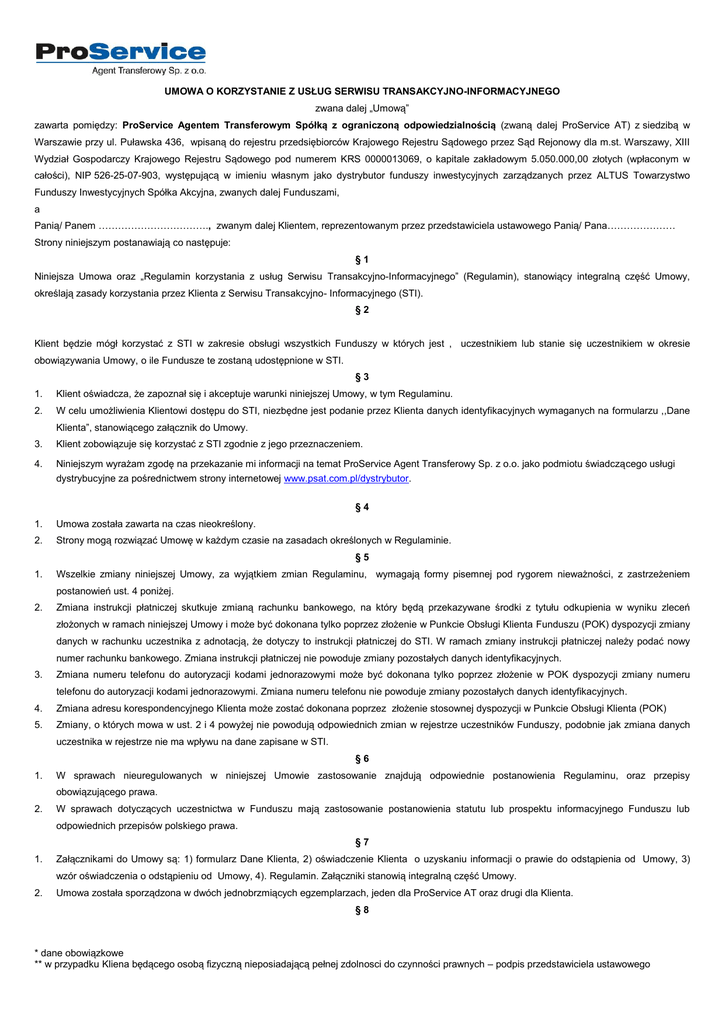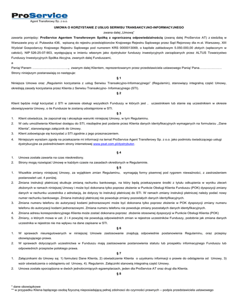 UMOWA O KORZYSTANIE Z USŁUG SERWISU TRANSAKCYJNO-INFORMACYJNEGO zwana dalej „Umową” zawarta pomiędzy: ProService Agentem Transferowym Spółką z ograniczoną odpowiedzialnością (zwaną dalej ProService AT) z siedzibą w Warszawie przy ul. Puławska 436, wpisaną do rejestru przedsiębiorców Krajowego Rejestru Sądowego przez Sąd Rejonowy dla m.st. Warszawy, XIII Wydział Gospodarczy Krajowego Rejestru Sądowego pod numerem KRS 0000013069, o kapitale zakładowym 5.050.000,00 złotych (wpłaconym w całości), NIP 526-25-07-903, występującą w imieniu własnym jako dystrybutor funduszy inwestycyjnych zarządzanych przez ALTUS Towarzystwo Funduszy Inwestycyjnych Spółka Akcyjna, zwanych dalej Funduszami, a Panią/ Panem ……………………………., zwanym dalej Klientem, reprezentowanym przez przedstawiciela ustawowego Panią/ Pana………………… Strony niniejszym postanawiają co następuje: §1 Niniejsza Umowa oraz „Regulamin korzystania z usług Serwisu Transakcyjno-Informacyjnego” (Regulamin), stanowiący integralną część Umowy, określają zasady korzystania przez Klienta z Serwisu Transakcyjno- Informacyjnego (STI). §2 Klient będzie mógł korzystać z STI w zakresie obsługi wszystkich Funduszy w których jest , uczestnikiem lub stanie się uczestnikiem w okresie obowiązywania Umowy, o ile Fundusze te zostaną udostępnione w STI. §3 1. Klient oświadcza, że zapoznał się i akceptuje warunki niniejszej Umowy, w tym Regulaminu. 2. W celu umożliwienia Klientowi dostępu do STI, niezbędne jest podanie przez Klienta danych identyfikacyjnych wymaganych na formularzu ,,Dane Klienta”, stanowiącego załącznik do Umowy. 3. Klient zobowiązuje się korzystać z STI zgodnie z jego przeznaczeniem. 4. Niniejszym wyrażam zgodę na przekazanie mi informacji na temat ProService Agent Transferowy Sp. z o.o. jako podmiotu świadczącego usługi dystrybucyjne za pośrednictwem strony internetowej www.psat.com.pl/dystrybutor. §4 1. Umowa została zawarta na czas nieokreślony. 2. Strony mogą rozwiązać Umowę w każdym czasie na zasadach określonych w Regulaminie. 1. Wszelkie zmiany niniejszej Umowy, za wyjątkiem zmian Regulaminu, wymagają formy pisemnej pod rygorem nieważności, z zastrzeżeniem §5 postanowień ust. 4 poniżej. 2. Zmiana instrukcji płatniczej skutkuje zmianą rachunku bankowego, na który będą przekazywane środki z tytułu odkupienia w wyniku zleceń złożonych w ramach niniejszej Umowy i może być dokonana tylko poprzez złożenie w Punkcie Obsługi Klienta Funduszu (POK) dyspozycji zmiany danych w rachunku uczestnika z adnotacją, że dotyczy to instrukcji płatniczej do STI. W ramach zmiany instrukcji płatniczej należy podać nowy numer rachunku bankowego. Zmiana instrukcji płatniczej nie powoduje zmiany pozostałych danych identyfikacyjnych. 3. Zmiana numeru telefonu do autoryzacji kodami jednorazowymi może być dokonana tylko poprzez złożenie w POK dyspozycji zmiany numeru telefonu do autoryzacji kodami jednorazowymi. Zmiana numeru telefonu nie powoduje zmiany pozostałych danych identyfikacyjnych. 4. Zmiana adresu korespondencyjnego Klienta może zostać dokonana poprzez złożenie stosownej dyspozycji w Punkcie Obsługi Klienta (POK) 5. Zmiany, o których mowa w ust. 2 i 4 powyżej nie powodują odpowiednich zmian w rejestrze uczestników Funduszy, podobnie jak zmiana danych uczestnika w rejestrze nie ma wpływu na dane zapisane w STI. §6 1. W sprawach nieuregulowanych w niniejszej Umowie zastosowanie znajdują odpowiednie postanowienia Regulaminu, oraz przepisy obowiązującego prawa. 2. W sprawach dotyczących uczestnictwa w Funduszu mają zastosowanie postanowienia statutu lub prospektu informacyjnego Funduszu lub odpowiednich przepisów polskiego prawa. §7 1. Załącznikami do Umowy są: 1) formularz Dane Klienta, 2) oświadczenie Klienta o uzyskaniu informacji o prawie do odstąpienia od Umowy, 3) wzór oświadczenia o odstąpieniu od Umowy, 4). Regulamin. Załączniki stanowią integralną część Umowy. 2. Umowa została sporządzona w dwóch jednobrzmiących egzemplarzach, jeden dla ProService AT oraz drugi dla Klienta. §8 * dane obowiązkowe ** w przypadku Kliena będącego osobą fizyczną nieposiadającą pełnej zdolnosci do czynności prawnych – podpis przedstawiciela ustawowego 1. Umowa zostaje zawarta z dniem otrzymania przez ProService AT prawidłowej i podpisanej przez Klienta Umowy, przy czym aktywacja usługi dokonywana jest przez Klienta samodzielnie w Internecie poprzez link aktywacyjny na spersonalizowana stronę, na której Klient wprowadza prawidłowy zestaw danych (identyfikator i hasło oraz kod jednorazowy). 2. Przez prawidłową Umowę rozumie się Umowę, która zawiera wszelkie wymagane dla danego Klienta dane i dokumenty określone w Regulaminie oraz Załączniku do Umowy „Dane Klienta”. ----------------------------- ....................................................... Za Uczestnika (data i podpis)* Za ProService AT (data, podpis)* * dane obowiązkowe ** w przypadku Kliena będącego osobą fizyczną nieposiadającą pełnej zdolnosci do czynności prawnych – podpis przedstawiciela ustawowego Załącznik do Umowy STI DANE KLIENTA Klient indywidualny Imię * Drugie imię Nazwisko * Adres: E-mail * Data urodzenia * Płeć * PESEL * NIP Typ dokumentu tożsamości * Numer dokumentu tożsamości * Obywatelstwo * Status dewizowy * Kraj certyfikatu rezydencji Data wystawienia certyfikatu rezydencji Adres Stały Ulica * Dom * Lokal kod pocztowy * miejscowość * Kraj * Telefon fax Adres Korespondencyjny Ulica * Dom * Lokal kod pocztowy * Miejscowość * Kraj * telefon fax Przedstawiciel ustawowy Imię * Drugie imię Nazwisko * Adres: E-mail * Data urodzenia * Płeć * PESEL NIP Typ dokumentu tożsamości * Numer dokumentu tożsamości * Obywatelstwo * Sposób autoryzacji * Numer telefonu do otrzymywania SMS z Kodami jednorazowymi: ……………………… Instrukcja pła